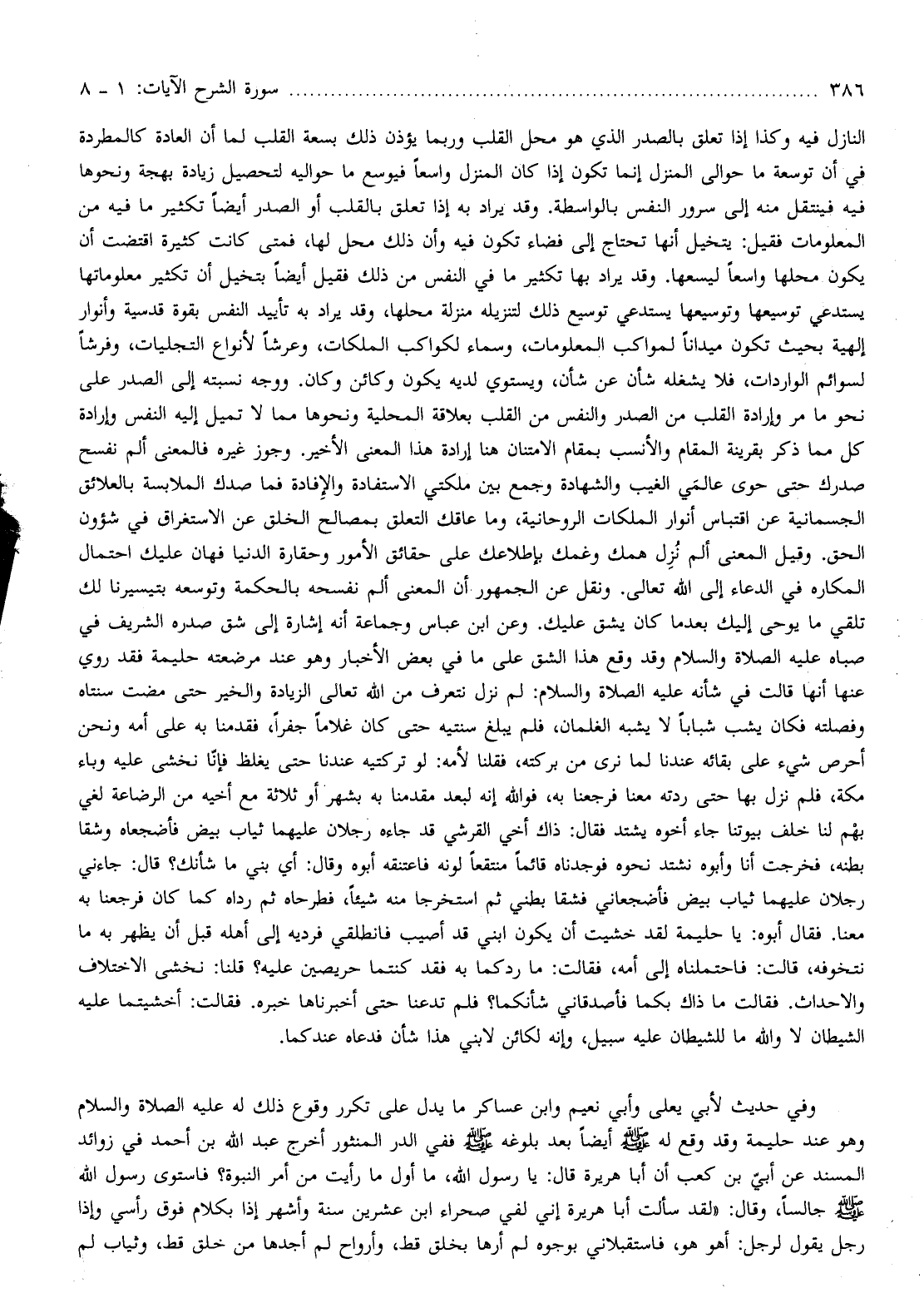 النازل فيه وكذا إذا تعلق بالصدر الذي هو محل القلب وربما يؤذن ذلك بسعة القلب لما أن العادة كالمطردة في أن توسعة ما حوالى المنزل إنما تكون إذا كان المنزل واسعا فيوسع ما حواليه لتحصيل زيادة بهجة ونحوها فيه فينتقل منه إلى سرور النفس بالواسطة. وقد يراد به إذا تعلق بالقلب أو الصدر أيضا تكثير ما فيه من المعلومات فقيل: يتخيل أنها تحتاج إلى فضاء تكون فيه وأن ذلك محل لها، فمتى كانت كثيرة اقتضت أن يكون محلها واسعا ليسعها. وقد يراد بها تكثير ما في النفس من ذلك فقيل أيضا بتخيل أن تكثير معلوماتها يستدعي توسيعها وتوسيعها يستدعي توسيع ذلك لتنزيله منزلة محلها، وقد يراد به تأييد النفس بقوة قدسية وأنوار إلهية بحيث تكون ميدانا لمواكب المعلومات، وسماء لكواكب الملكات، وعرشا لأنواع التجليات، وفرشا لسوائم الواردات، فلا يشغله شأن عن شأن، ويستوي لديه يكون وكائن وكان. ووجه نسبته إلى الصدر على نحو ما مر وإرادة القلب من الصدر والنفس من القلب بعلاقة المحلية ونحوها مما لا تميل إليه النفس وإرادة كل مما ذكر بقرينة المقام والأنسب بمقام الامتنان هنا إرادة هذا المعنى الأخير. وجوز غيره فالمعنى ألم نفسح صدرك حتى حوى عالمي الغيب والشهادة وجمع بين ملكتي الاستفادة والإفادة فما صدك الملابسة بالعلائق الجسمانية عن اقتباس أنوار الملكات الروحانية، وما عاقك التعلق بمصالح الخلق عن الاستغراق في شؤون الحق. وقيل المعنى ألم نزل همك وغمك باطلاعك على حقائق الأمور وحقارة الدنيا فهان عليك احتمال المكاره في الدعاء إلى الله تعالى. ونقل عن الجمهور أن المعنى ألم نفسحه بالحكمة وتوسعه بتيسيرنا لك تلقي ما يوحى إليك بعد ما كان يشق عليك. وعن ابن عباس وجماعة أنه إشارة إلى شق صدره الشريف في صباه عليه الصلاة والسلام وقد وقع هذا الشق على ما في بعض الأخبار وهو عند مرضعته حليمة