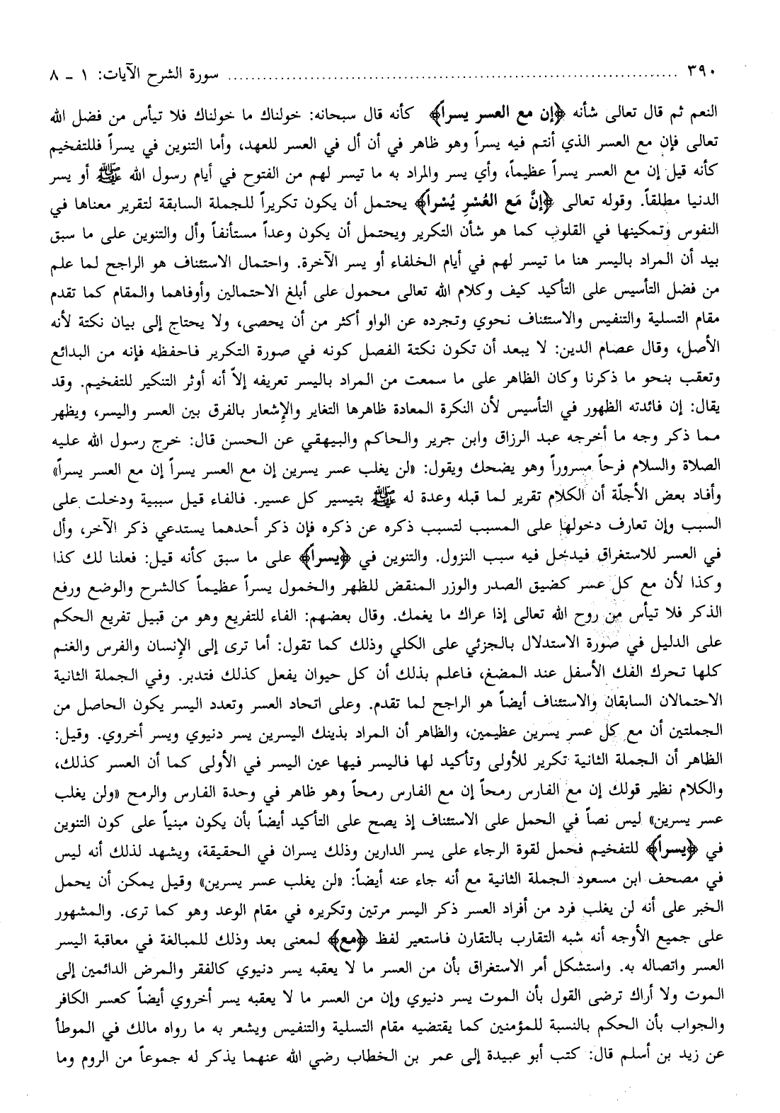 النعم ثم قال تعالى شأنه إِنَّ مَعَ الْعُسْرِ يُسْراً كأنه قال سبحانه: خولناك ما خولناك فلا تيأس من فضل الله تعالى فإن مع العسر الذي أنتم فيه يسرا وهو ظاهر في أن أل في العسر للعهد، وأما التنوين في يسرا فللتفخيم كأنه قيل إن مع العسر يسرا عظيما، وأي يسر والمراد به ما تيسر لهم من الفتوح في أيام رسول الله صلّى الله عليه وسلم أو يسر الدنيا مطلقا. وقوله تعالى إِنَّ مَعَ الْعُسْرِ يُسْراً يحتمل أن يكون تكريرا للجملة السابقة لتقرير معناها في النفوس وتمكينها في القلوب كما هو شأن التكرير ويحتمل أن يكون وعدا مستأنفا وأل والتنوين على ما سبق بيد أن المراد باليسر هنا ما تيسر لهم في أيام الخلفاء أو يسر الآخرة. واحتمال الاستئناف هو الراجح لما علم من فضل التأسيس على التأكيد كيف وكلام الله تعالى محمول على أبلغ الاحتمالين وأوفاهما والمقام كما تقدم مقام التسلية والتنفيس والاستئناف نحوي وتجرده عن الواو أكثر من أن يحصى، ولا يحتاج إلى بيان نكتة لأنه الأصل، وقال عصام الدين: لا يبعد أن تكون نكتة الفصل كونه في صورة التكرير فاحفظه فإنه من البدائع وتعقب بنحو ما ذكرنا وكان الظاهر على ما سمعت من المراد باليسر تعريفه إلّا أنه أوثر التنكير للتفخيم. وقد يقال: إن فائدته الظهور في التأسيس لأن النكرة المعادة ظاهرها التغاير والإشعار بالفرق بين العسر واليسر، ويظهر مما ذكر وجه ما