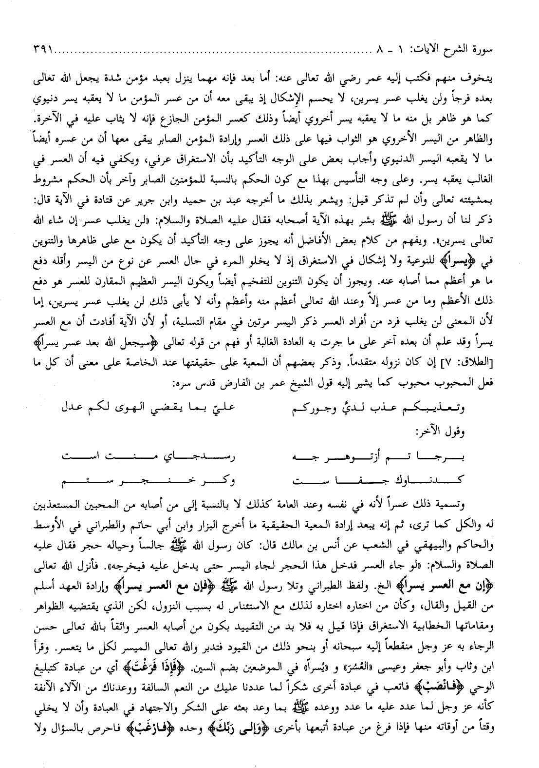 وإرادة العهد أسلم من القيل والقال، وكأن من اختاره اختاره لذلك مع الاستئناس له بسبب النزول، لكن الذي يقتضيه الظواهر ومقاماتها الخطابية الاستغراق فإذا قيل به فلا بد من التقييد بكون من أصابه العسر واثقا بالله تعالى حسن الرجاء به عز وجل منقطعا إليه سبحانه أو بنحو ذلك من القيود فتدبر والله تعالى الميسر لكل ما يتعسر. وقرأ ابن وثاب وأبو جعفر وعيسى «العسر» و «يسرا» في الموضعين بضم السين. فَإِذا فَرَغْتَ أي من عبادة كتبليغ الوحي فَانْصَبْ فاتعب في عبادة أخرى شكرا لما عددنا عليك من النعم السالفة ووعدناك من الآلاء الآنفة كأنه عز وجل لما عدد عليه ما عدد ووعده صلّى الله عليه وسلم بما وعد بعثه على الشكر والاجتهاد في العبادة وأن لا يخلي وقتا من أوقاته منها فإذا فرغ من عبادة أتبعها بأخرى وَإِلى رَبِّكَ وحده فَارْغَبْ فاحرص بالسؤال ولا