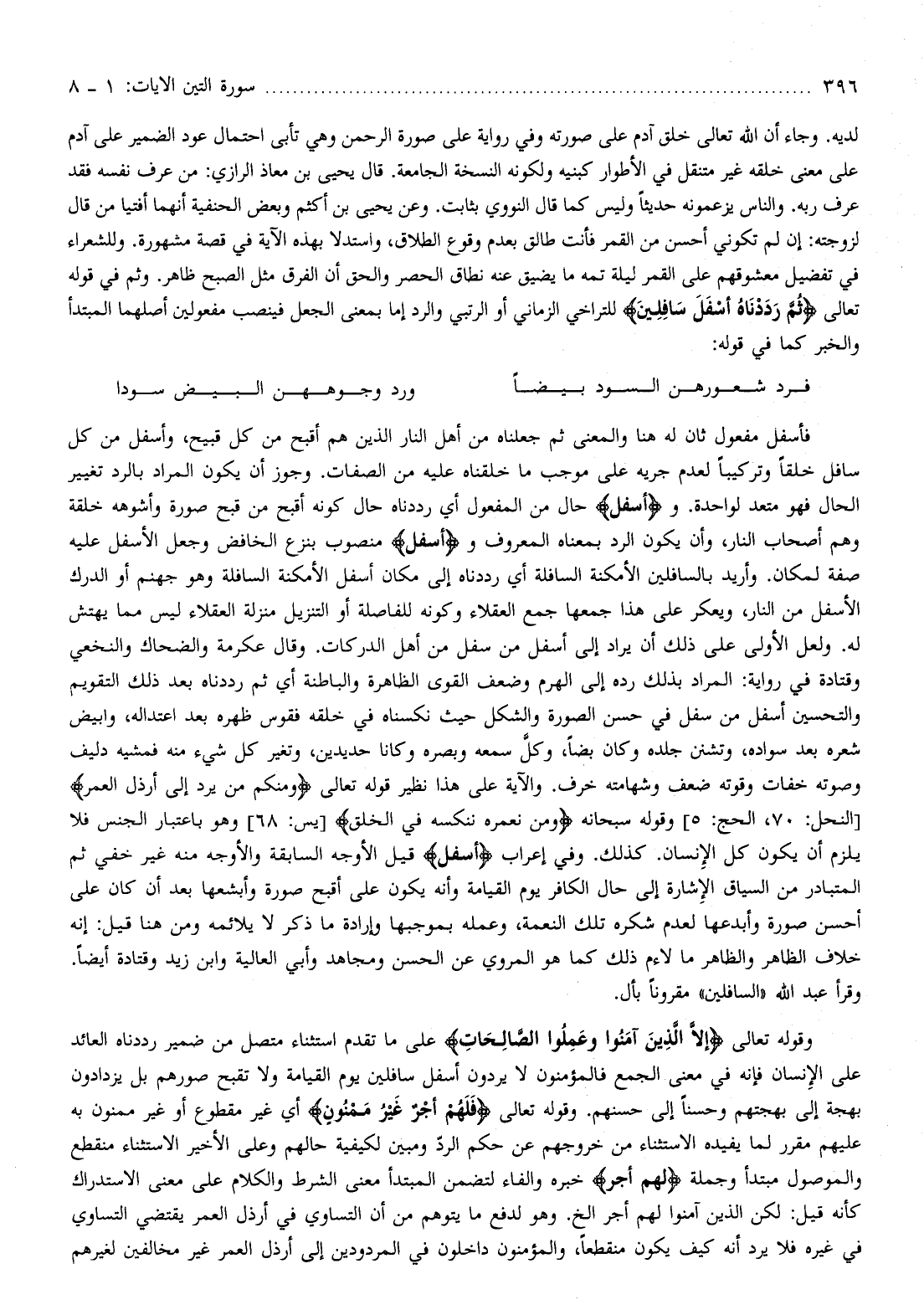 وهي تأبى احتمال عود الضمير على آدم على معنى خلقه غير متنقل في الأطوار كبنيه ولكونه النسخة الجامعة. قال يحيى بن معاذ الرازي: من عرف نفسه فقد عرف ربه. والناس يزعمونه حديثا وليس كما قال النووي بثابت. وعن يحيى بن أكثم وبعض الحنفية أنهما أفتيا من قال لزوجته: إن لم تكوني أحسن من القمر فأنت طالق بعدم وقوع الطلاق، واستدلا بهذه الآية في قصة مشهورة. وللشعراء في تفضيل معشوقهم على القمر ليلة تمه ما يضيق عنه نطاق الحصر والحق أن الفرق مثل الصبح ظاهر. وثم في قوله تعالى ثُمَّ رَدَدْناهُ أَسْفَلَ سافِلِينَ للتراخي الزماني أو الرتبي والرد إما بمعنى الجعل فينصب مفعولين أصلهما المبتدأ والخبر كما في قوله: