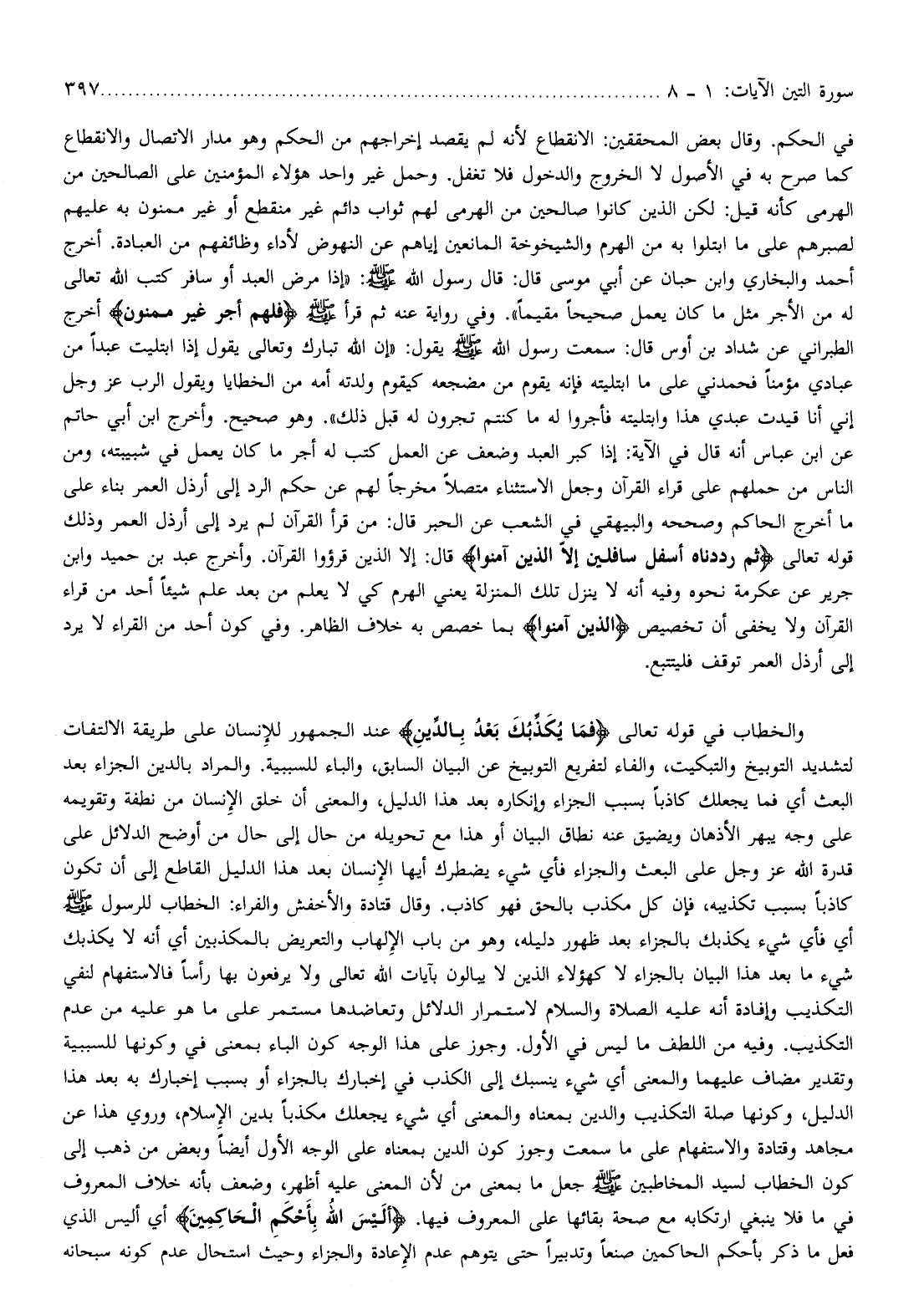 وهو صحيح. وأخرج ابن أبي حاتم عن ابن عباس أنه قال في الآية: إذا كبر العبد وضعف عن العمل كتب له أجر ما كان يعمل في شبيبته، ومن الناس من حملهم على قراء القرآن وجعل الاستثناء متصلا مخرجا لهم عن حكم الرد إلى أرذل العمر بناء على ما أخرج الحاكم وصححه والبيهقي في الشعب عن الحبر قال: من قرأ القرآن لم يرد إلى أرذل العمر وذلك قوله تعالى ثُمَّ رَدَدْناهُ أَسْفَلَ سافِلِينَ إِلَّا الَّذِينَ آمَنُوا قال: إلا الذين قرؤوا القرآن. وأخرج عبد بن حميد وابن جرير عن عكرمة نحوه وفيه أنه لا ينزل تلك المنزلة يعني الهرم كي لا يعلم من بعد علم شيئا أحد من قراء القرآن ولا يخفى أن تخصيص الَّذِينَ آمَنُوا بما خصص به خلاف الظاهر. وفي كون أحد من القراء لا يرد إلى أرذل العمر توقف فليتتبع.