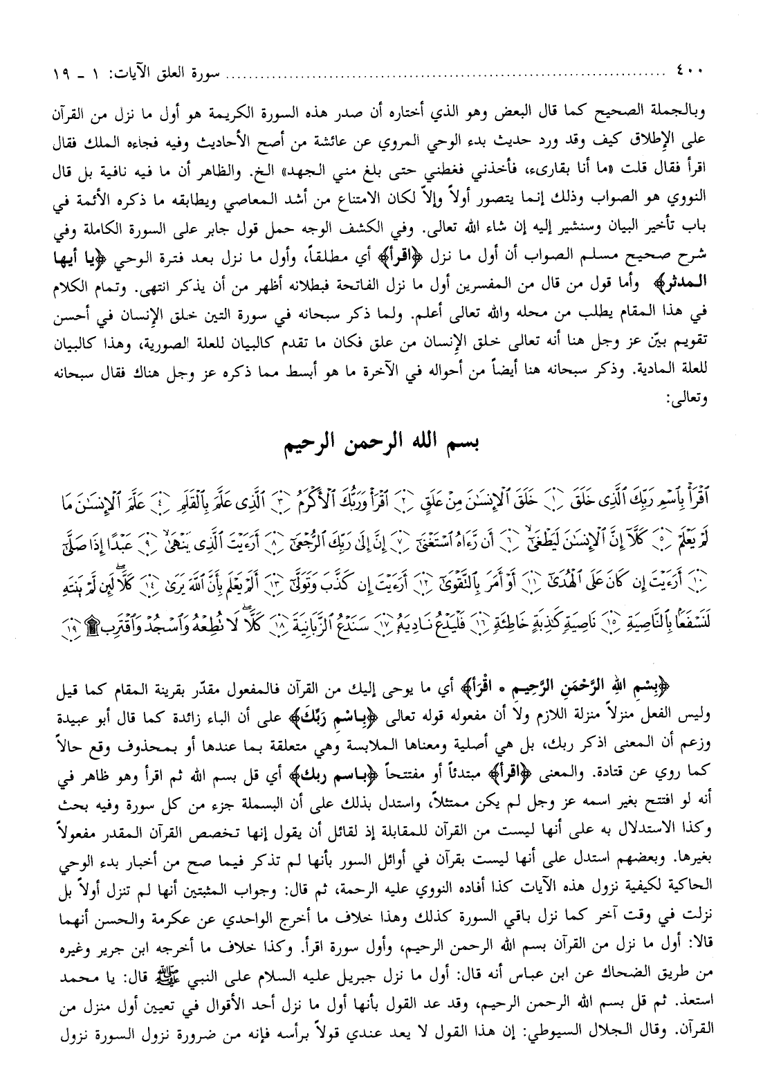 وبالجملة الصحيح كما قال البعض وهو الذي أختاره أن صدر هذه السورة الكريمة هو أول ما نزل من القرآن على الإطلاق كيف