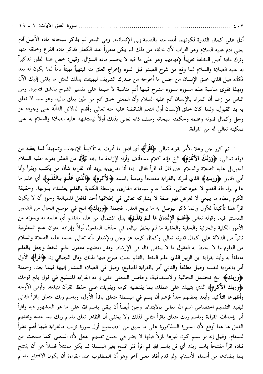 يريد أن القراءة شأن من يكتب ويقرأ وأنا أمي فقيل وَرَبُّكَ الذي أمرك بالقراءة مفتتحا ومبتدأ باسمه الْأَكْرَمُ الَّذِي عَلَّمَ بِالْقَلَمِ أي علم ما علم بواسطة القلم لا غيره تعالى، فكما علم سبحانه القارئ بواسطة الكتابة بالقلم يعلمك بدونها. وحقيقة الكرم إعطاء ما ينبغي لا لغرض فهو صفة لا يشاركه تعالى في إطلاقها أحد فافعل للمبالغة وجوز أن لا يكون اقرأ هذا تأكيدا للأول وإنما ذكر ليوصل به ما يزيح العذر. فجملة وَرَبُّكَ إلخ في موضع الحال من الضمير المستتر فيه. وقوله تعالى عَلَّمَ الْإِنْسانَ ما لَمْ يَعْلَمْ بدل اشتمال من علم بالقلم أي علمه به وبدونه من الأمور الكلية والجزئية والجلية والخفية ما لم يخطر بباله، في حذف المفعول أولا وإيراده بعنوان عدم المعلومية ثانيا من الدلالة على كمال قدرته تعالى وكمال كرمه عز وجل والإشعار بأنه تعالى يعلمه عليه الصلاة والسلام من العلوم ما لا يحيط به العقول ما لا يخفى قاله في الإرشاد. وقدر بعضهم مفعول علم الخط وجعل بالقلم متعلقا به وأيد بقراءة ابن الزبير الذي علم الخط بالقلم حيث صرح فيها بذلك وقال الجبائي إن اقْرَأْ الأول أمر بالقراءة لنفسه وقيل مطلقا والثاني أمر بالقراءة للتبليغ، وقيل في الصلاة المشار إليها فيما بعد. وجملة وَرَبُّكَ إلخ تحتمل الحالية والاستئنافية، وحاصل المعنى على إرادة القراءة للتبليغ في قول بلغ قومك وَرَبُّكَ الْأَكْرَمُ الذي يثيبك على عملك بما يقتضيه كرمه ويقويك على حفظ القرآن لتبلغه. وأولى الأوجه وأظهرها التأكيد وأبعد بعضهم جدا فزعم أن بسم في البسملة متعلق باقرأ الأول، وباسم ربك متعلق باقرأ الثاني ليفيد التقديم اختصاص اسم الله تعالى بالابتداء. وجوز أيضا أن يبقى باسم الله على ما هو المشهور فيه واقرأ أمر بإحداث القراءة وباسم ربك متعلق باقرأ الثاني لذلك ولا يخفى أن الظاهر تعلق باسم ربك بما عنده وتقديم الفعل هاهنا أوقع لأن السورة المذكورة على ما سبق من التصحيح أول سورة نزلت فالقراءة فيها أهم نظرا للمقام. وقيل إنه لو سلم كون غيرها نازلا قبلها لا يضر في حسن تقديم الفعل لأن المعنى كما سمعت عن قتادة اقرأ مفتتحا باسم ربك أي قل باسم الله ثم اقرأ فلو افتتح بغير البسملة لم يكن ممتثلا فضلا عن أن يفتتح بما يضادها من أسماء الأصنام، ولو قدم أفاد معنى آخر وهو أن المطلوب عند القراءة أن يكون الافتتاح باسم