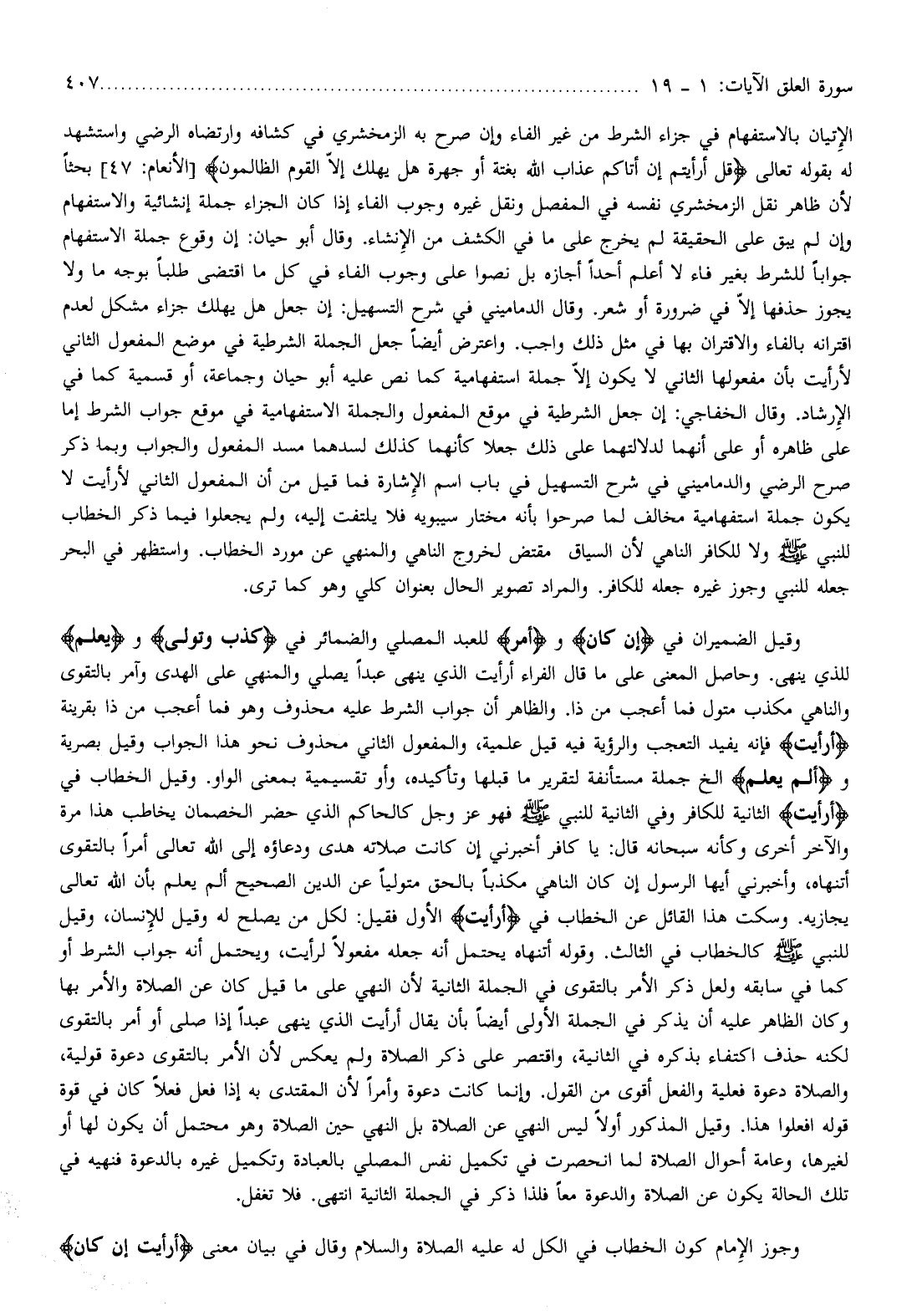 الإتيان بالاستفهام في جزاء الشرط من غير الفاء وإن صرح به الزمخشري في كشافه وارتضاه الرضي واستشهد له بقوله تعالى قُلْ أَرَأَيْتَكُمْ إِنْ أَتاكُمْ عَذابُ اللَّهِ بَغْتَةً أَوْ جَهْرَةً هَلْ يُهْلَكُ إِلَّا الْقَوْمُ الظَّالِمُونَ [الأنعام: 47] بحثا لأن ظاهر نقل الزمخشري نفسه في المفصل ونقل غيره وجوب الفاء إذا كان الجزاء جملة إنشائية والاستفهام وإن لم يبق على الحقيقة لم يخرج على ما في الكشف من الإنشاء. وقال أبو حيان: إن وقوع جملة الاستفهام جوابا للشرط بغير فاء لا أعلم أحدا أجازه بل نصوا على وجوب الفاء في كل ما اقتضى طلبا بوجه ما ولا يجوز حذفها إلّا في ضرورة أو شعر. وقال الدماميني في شرح التسهيل: إن جعل هل يهلك جزاء مشكل لعدم اقترانه بالفاء والاقتران بها في مثل ذلك واجب. واعترض أيضا جعل الجملة الشرطية في موضع المفعول الثاني لأرأيت بأن مفعولها الثاني لا يكون إلّا جملة استفهامية كما نص عليه أبو حيان وجماعة، أو قسمية كما في الإرشاد. وقال الخفاجي: إن جعل الشرطية في موقع المفعول والجملة الاستفهامية في موقع جواب الشرط إما على ظاهره أو على أنهما لدلالتهما على ذلك جعلا كأنهما كذلك لسدهما مسد المفعول والجواب وبما ذكر صرح الرضي والدماميني في شرح التسهيل في باب اسم الإشارة فما قيل من أن المفعول الثاني لأرأيت لا يكون جملة استفهامية مخالف لما صرحوا بأنه مختار سيبويه فلا يلتفت إليه، ولم يجعلوا فيما ذكر الخطاب للنبي صلّى الله عليه وسلم ولا للكافر الناهي لأن السياق مقتض لخروج الناهي والمنهي عن مورد الخطاب. واستظهر في البحر جعله للنبي وجوز غيره جعله للكافر. والمراد تصوير الحال بعنوان كلي وهو كما ترى.