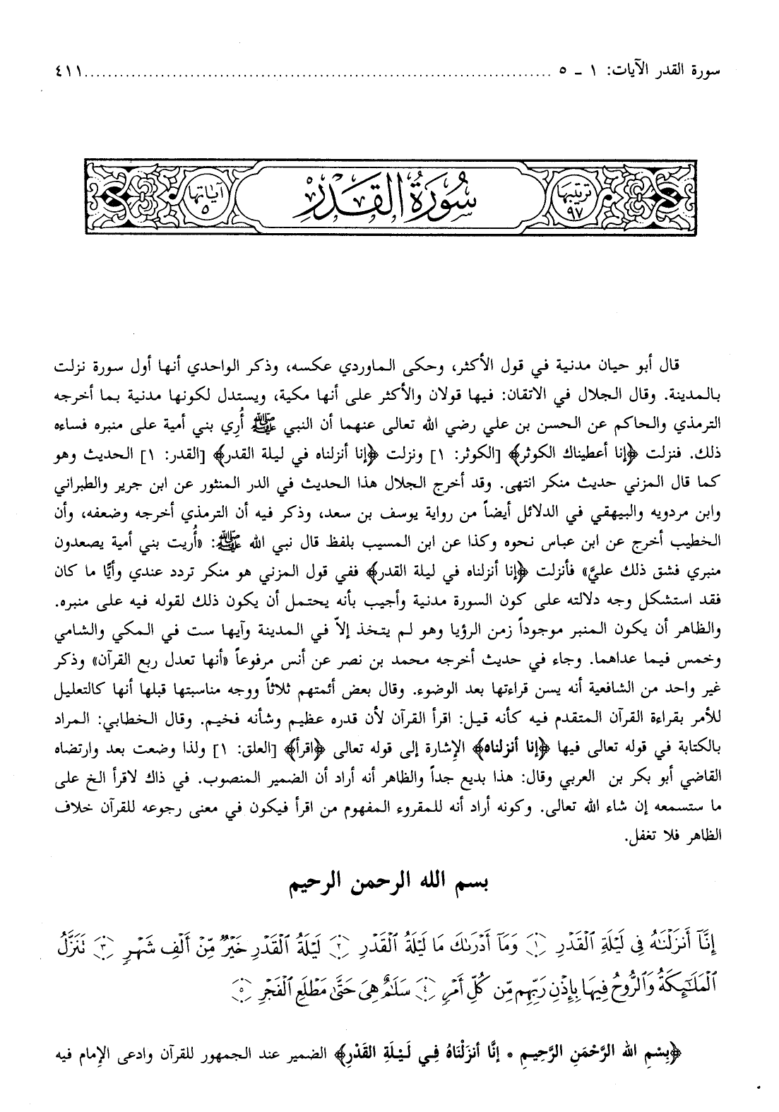 بِسْمِ اللَّهِ الرَّحْمنِ الرَّحِيمِ إِنَّا أَنْزَلْناهُ فِي لَيْلَةِ الْقَدْرِ الضمير عند الجمهور للقرآن وادعى الإمام فيه