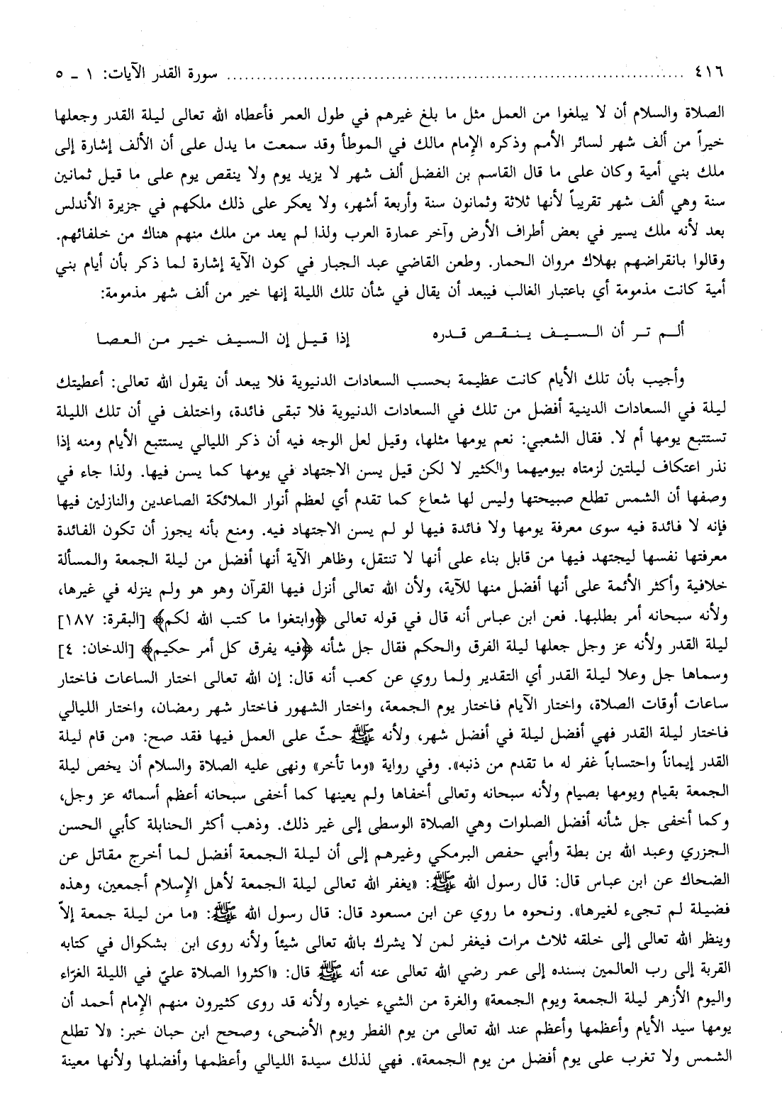 الصلاة والسلام أن لا يبلغوا من العمل مثل ما بلغ غيرهم في طول العمر فأعطاه الله تعالى ليلة القدر وجعلها خيرا من ألف شهر لسائر الأمم وذكره الإمام مالك في الموطأ وقد سمعت ما يدل على أن الألف إشارة إلى ملك بني أمية وكان على ما قال القاسم بن الفضل ألف شهر لا يزيد يوم ولا ينقص يوم على ما قيل ثمانين سنة وهي ألف شهر تقريبا لأنها ثلاثة وثمانون سنة وأربعة أشهر، ولا يعكر على ذلك ملكهم في جزيرة الأندلس بعد لأنه ملك يسير في بعض أطراف الأرض وآخر عمارة العرب ولذا لم يعد من ملك منهم هناك من خلفائهم.