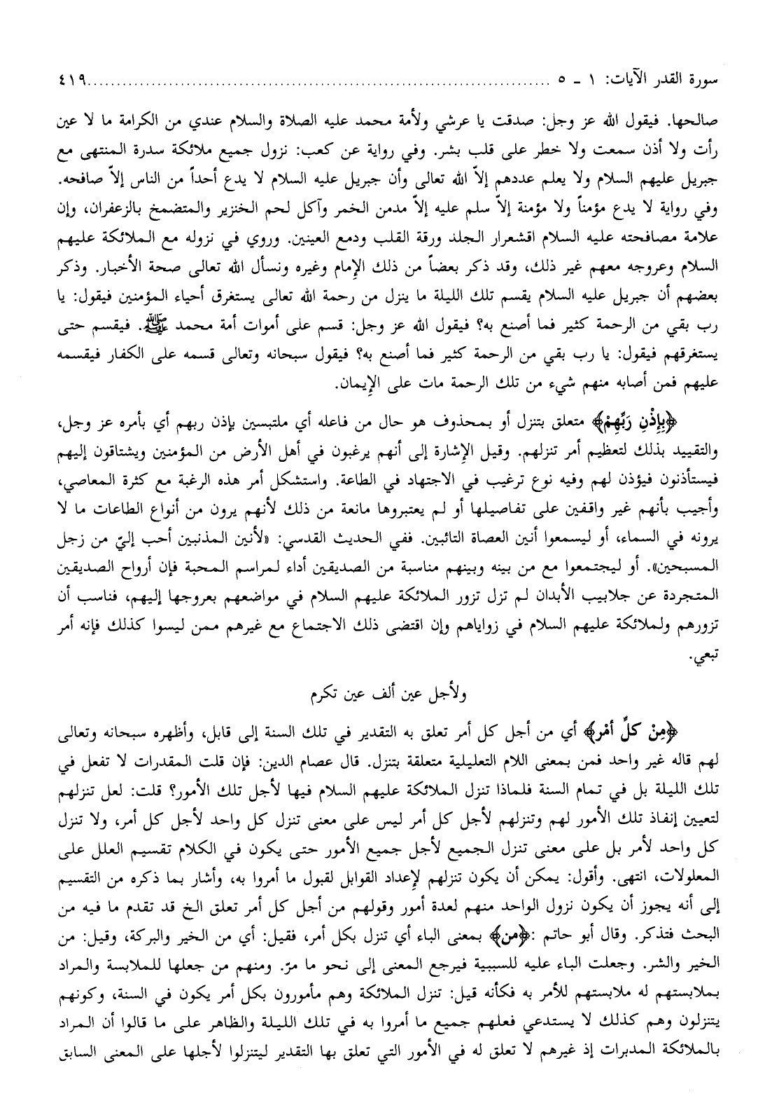 ولأجل عين ألف عين تكرم مِنْ كُلِّ أَمْرٍ أي من أجل كل أمر تعلق به التقدير في تلك السنة إلى قابل، وأظهره سبحانه وتعالى لهم قاله غير واحد فمن بمعنى اللام التعليلية متعلقة بتنزل. قال عصام الدين: فإن قلت المقدرات لا تفعل في تلك الليلة بل في تمام السنة فلماذا تنزل الملائكة عليهم السلام فيها لأجل تلك الأمور؟ قلت: لعل تنزلهم لتعيين إنفاذ تلك الأمور لهم وتنزلهم لأجل كل أمر ليس على معنى تنزل كل واحد لأجل كل أمر، ولا تنزل كل واحد لأمر بل على معنى تنزل الجميع لأجل جميع الأمور حتى يكون في الكلام تقسيم العلل على المعلولات، انتهى. وأقول: يمكن أن يكون تنزلهم لإعداد القوابل لقبول ما أمروا به، وأشار بما ذكره من التقسيم إلى أنه يجوز أن يكون نزول الواحد منهم لعدة أمور وقولهم من أجل كل أمر تعلق إلخ قد تقدم ما فيه من البحث فتذكر. وقال أبو حاتم: مِنْ بمعنى الباء أي تنزل بكل أمر، فقيل: أي من الخير والبركة، وقيل: من الخير والشر. وجعلت الباء عليه للسببية فيرجع المعنى إلى نحو ما مرّ. ومنهم من جعلها للملابسة والمراد بملابستهم له ملابستهم للأمر به فكأنه قيل: تنزل الملائكة وهم مأمورون بكل أمر يكون في السنة، وكونهم يتنزلون وهم كذلك لا يستدعي فعلهم جميع ما أمروا به في تلك الليلة والظاهر على ما قالوا أن المراد بالملائكة المدبرات إذ غيرهم لا تعلق له في الأمور التي تعلق بها التقدير ليتنزلوا لأجلها على المعنى السابق