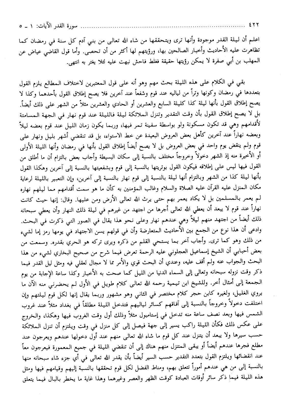 بل لا يصح إطلاق القول بأن وقت التقدير وتنزل الملائكة ليلة فالليلة عند قوم نهار في الجهة المسامتة لأقدامهم وهي قد تكون مسكونة ولو بواسطة سفينة تمر فيها، وربما يكون زمان الليل عند قوم بعضه ليلا وبعضه نهارا عند آخرين كأهل بعض العروض البعيدة عن خط الاستواء، بل قد تنقضي أشهر بليل ونهار على قوم ولم ينقض يوم واحد في بعض العروض بل لا يصح أيضا إطلاق القول بأنها في رمضان وأنها الليلة الأولى أو الأخيرة منه إذ الشهر دخولا وخروجا مختلف بالنسبة إلى سكان البسيطة وأجاب بعض بالتزام أن ما أطلق من القول فيها ليس على إطلاقه فيكون القول بوتريتها بالنسبة إلى قوم وبشفعيتها بالنسبة إلى آخرين وهكذا القول بأنها ليلة كذا من الشهر وبالتزام أنها ليلة بالنسبة إلى قوم نهار بالنسبة إلى آخرين، وإن التعبير بالليلة لرعاية مكان المنزل عليه القرآن عليه الصلاة والسلام وغالب المؤمنين به كأن ما هو سمت أقدامهم مما ليلهم نهاره لم يعمر بالمسلمين بل لا يكاد يعمر بهم حتى يرث الله تعالى الأرض ومن عليها. وقال: إنها حيث كانت نهارا عند قوم لا يبعد أن يعطي الله تعالى أجرها من اجتهد من غيرهم في ليلة ذلك النهار وأن يعطي سبحانه ذلك أيضا من اجتهد منهم ليلا وهي عندهم نهار وعلى نحو هذا يقال في الصور التي ذكرت في البحث.