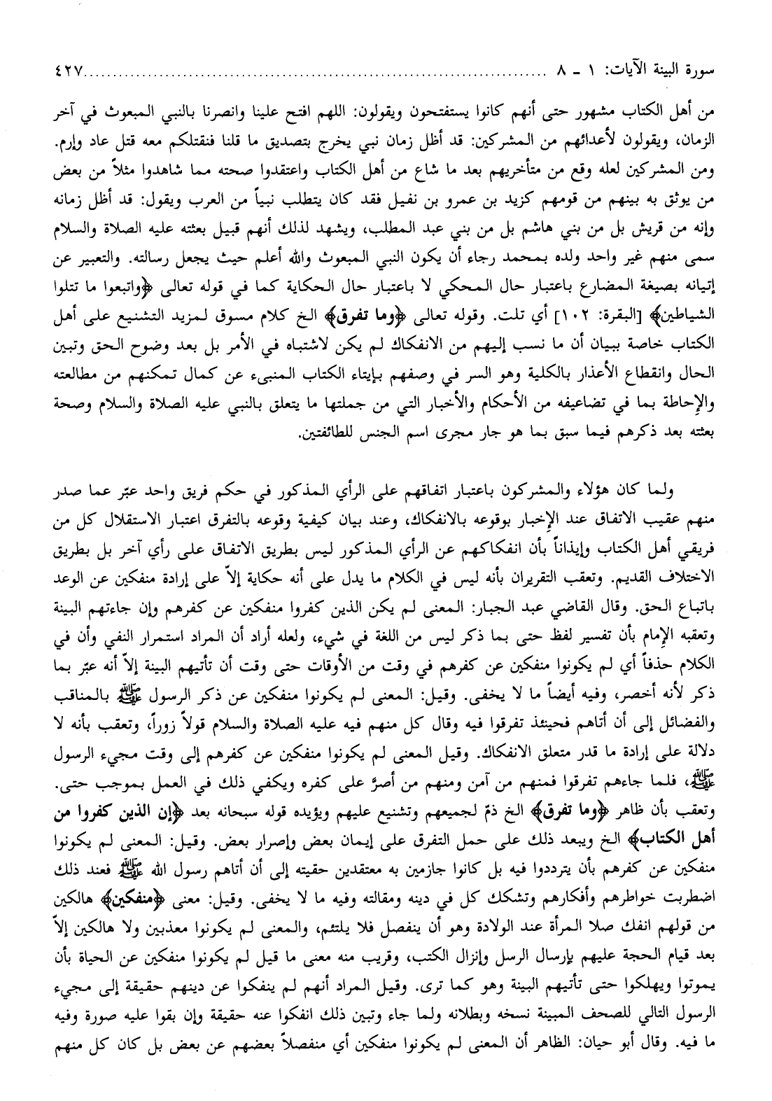 وتعقب بأن ظاهر وَما تَفَرَّقَ إلخ ذمّ لجميعهم وتشنيع عليهم ويؤيده قوله سبحانه بعد إِنَّ الَّذِينَ كَفَرُوا مِنْ أَهْلِ الْكِتابِ إلخ ويبعد ذلك على حمل التفرق على إيمان بعض وإصرار بعض. وقيل: المعنى لم يكونوا منفكين عن كفرهم بأن يترددوا فيه بل كانوا جازمين به معتقدين حقيته إلى أن أتاهم رسول الله صلّى الله عليه وسلم فعند ذلك اضطربت خواطرهم وأفكارهم وتشكك كل في دينه ومقالته وفيه ما لا يخفى. وقيل: معنى مُنْفَكِّينَ هالكين من قولهم انفك صلا المرأة عند الولادة وهو أن ينفصل فلا يلتئم، والمعنى لم يكونوا معذبين ولا هالكين إلّا بعد قيام الحجة علهيم بإرسال الرسل وإنزال الكتب، وقريب منه معنى ما قيل لم يكونوا منفكين عن الحياة بأن يموتوا ويهلكوا حتى تأتيهم البينة وهو كما ترى. وقيل المراد أنهم لم ينفكوا عن دينهم حقيقة إلى مجيء الرسول التالي للصحف المبينة نسخه وبطلانه ولما جاء وتبين ذلك انفكوا عنه حقيقة وإن بقوا عليه صورة وفيه ما فيه. وقال أبو حيان: الظاهر أن المعنى لم يكونوا منفكين أي منفصلا بعضهم عن بعض بل كان كل منهم