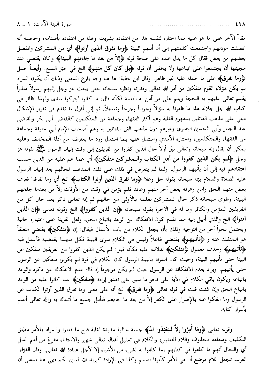 مقرا الآخر على ما هو عليه مما اختاره لنفسه هذا من اعتقاده بشريعته وهذا من اعتقاده بأصنامه، وحاصله أنه اتصلت مودتهم واجتمعت كلمتهم إلى أن أتتهم البينة وَما تَفَرَّقَ الَّذِينَ أُوتُوا أي من المشركين وانفصل بعضهم من بعض فقال كل ما يدل عنده على صحة قوله إِلَّا مِنْ بَعْدِ ما جاءَتْهُمُ الْبَيِّنَةُ وكان يقتضي عند مجيئها أن يجتمعوا على اتباعها ولا يخفى أن قوله (بل كان كل منهم) إلخ في حيّز المنع. وأيضا حمل وَما تَفَرَّقَ على ما حمله عليه غير ظاهر. وقال ابن عطية: هاهنا وجه بارع المعنى وذلك أن يكون المراد لم يكن هؤلاء القوم منفكين من أمر الله تعالى وقدرته ونظره سبحانه حتى يبعث عز وجل إليهم رسولا منذرا يقيم تعالى عليهم به الحجة ويتم على من آمن به النعمة فكأنه قال: ما كانوا ليتركوا سدى ولهذا نظائر في كتاب الله جل جلاله هذا ما ظفرنا به سؤالا وجوابا وجرحا وتعديلا. ثم إني أقول ما تقدم في تقرير الإشكال مبني على مذهب القائلين بمفهوم الغاية وهم أكثر الفقهاء وجماعة من المتكلمين كالقاضي أبي بكر والقاضي عبد الجبار وأبي الحسين البصري وغيرهم دون مذهب الغير القائلين به وهم أصحاب الإمام أبي حنيفة وجماعة من الفقهاء والمتكلمين، واختاره الآمدي واستدل عليه بما استدل ورد ما يعارضه من أدلة المخالف وعليه يمكن أن يقال إنه سبحانه وتعالى بيّن أولا حال الذين كفروا من الفريقين إلى وقت إتيان الرسول صلّى الله عليه وسلم بقوله عز وجل لَمْ يَكُنِ الَّذِينَ كَفَرُوا مِنْ أَهْلِ الْكِتابِ وَالْمُشْرِكِينَ مُنْفَكِّينَ أي عما هم عليه من الدين حسب اعتقادهم فيه إلى أن يأتيهم الرسول، ولما لم يتعرض في ذلك على ذلك المذهب لحالهم بعد إتيان الرسول عليه الصلاة والسلام بيّنه سبحانه بقوله جل وعلا وَما تَفَرَّقَ الَّذِينَ أُوتُوا الْكِتابَ إلخ أي وما تفرقوا فعرف بعض منهم الحق وآمن وعرفه بعض آخر منهم وعاند فلم يؤمن في وقت من الأوقات إلّا من بعد ما جاءتهم البينة. وطوى سبحانه ذكر حال المشركين لعلمه بالأولى من حالهم ثم إنه تعالى ذكر بعد حال كل من الفريقين المؤمن والكافر وما له في الآخرة بقوله سبحانه إِنَّ الَّذِينَ كَفَرُوا إلخ وقوله تعالى إِنَّ الَّذِينَ آمَنُوا إلخ والذي أميل إليه مما تقدم كون الانفكاك عن الوعد باتباع الحق، ولعل القرينة على اعتباره حالية ويحتمل نحوا آخر من التوجيه وذلك بأن يجعل الكلام من باب الأعمال فيقال: إن مُنْفَكِّينَ يقتضي متعلقا هو المنفك عنه وتَأْتِيَهُمُ يقتضي فاعلا وليس في الكلام سوى البينة فكل منهما يقتضيه فأعمل فيه تَأْتِيَهُمُ وحذف معمول مُنْفَكِّينَ لدلالته عليه فكأنه قيل: لم يكن الذين كفروا من الفريقين منفكين عن البينة حتى تأتيهم البينة، وحيث كان المراد بالبينة الرسول كان الكلام في قوة لم يكونوا منفكين عن الرسول حتى يأتيهم. ويراد بعدم الانفكاك عن الرسول حيث لم يكن موجودا إذ ذاك عدم الانفكاك عن ذكره والوعد باتباعه ويكون باقي الكلام في الآية على نحو ما سبق على تقدير إرادة