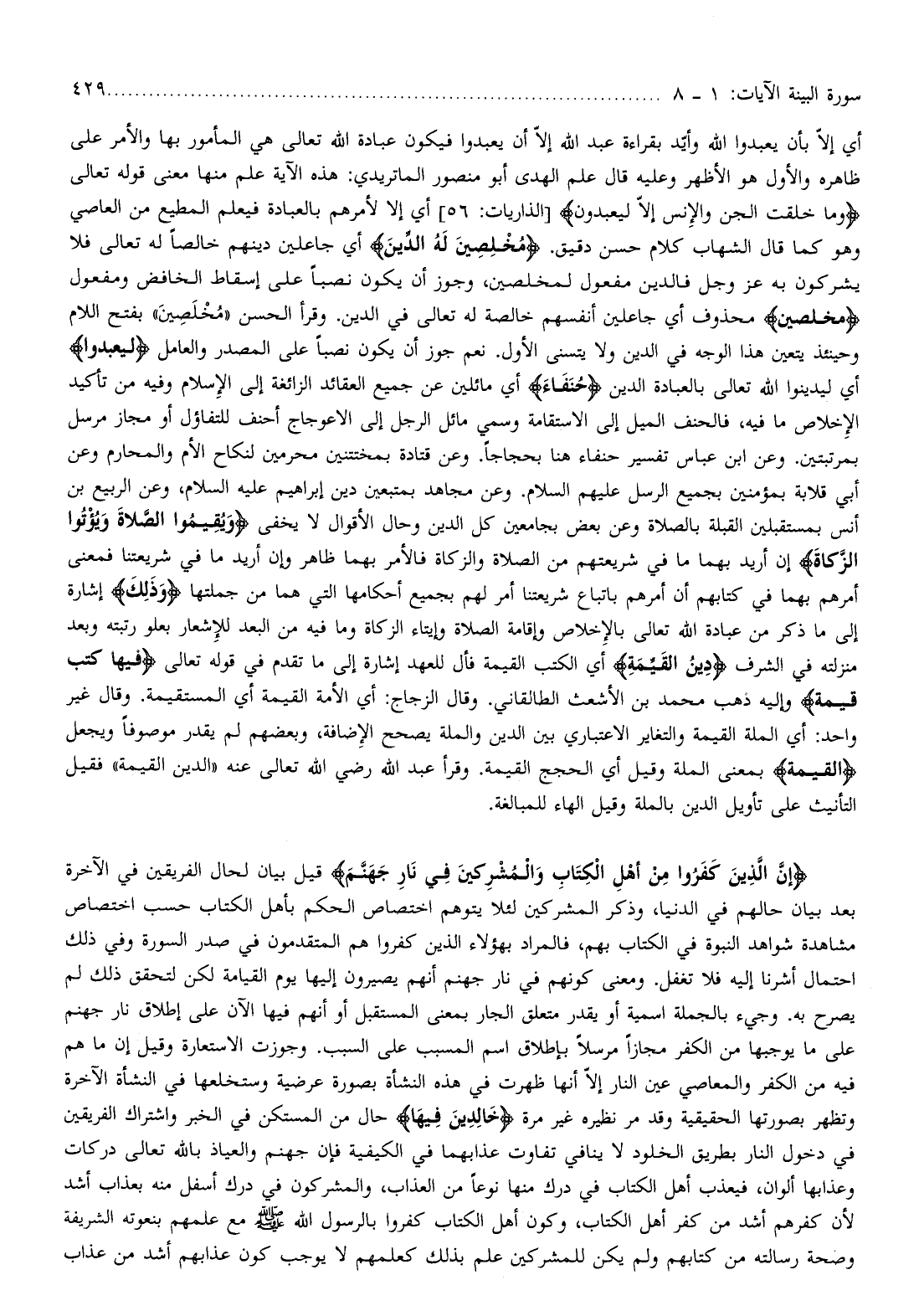 أي إلّا بأن يعبدوا الله وأيّد بقراءة عبد الله إلّا أن يعبدوا فيكون عبادة الله تعالى هي المأمور بها والأمر على ظاهره والأول هو الأظهر وعليه قال علم الهدى أبو منصور الماتريدي: هذه الآية علم منها معنى قوله تعالى وَما خَلَقْتُ الْجِنَّ وَالْإِنْسَ إِلَّا لِيَعْبُدُونِ [الذاريات: 56] أي إلا لأمرهم بالعبادة فيعلم المطيع من العاصي وهو كما قال الشهاب كلام حسن دقيق. مُخْلِصِينَ لَهُ الدِّينَ أي جاعلين دينهم خالصا له تعالى فلا يشركون به عز وجل فالدين مفعول لمخلصين، وجوز أن يكون نصبا على إسقاط الخافض ومفعول مُخْلِصِينَ محذوف أي جاعلين أنفسهم خالصة له تعالى في الدين. وقرأ الحسن «مخلصين» بفتح اللام وحينئذ يتعين هذا الوجه في الدين ولا يتسنى الأول. نعم جوز أن يكون نصبا على المصدر والعامل لِيَعْبُدُوا أي ليدينوا الله تعالى بالعبادة الدين حُنَفاءَ أي مائلين عن جميع العقائد الزائغة إلى الإسلام وفيه من تأكيد الإخلاص ما فيه، فالحنف الميل إلى الاستقامة وسمي مائل الرجل إلى الاعوجاج أحنف للتفاؤل أو مجاز مرسل بمرتبتين. وعن ابن عباس تفسير حنفاء هنا بحجاجا. وعن قتادة بمختتنين محرمين لنكاح الأم والمحارم وعن أبي قلابة بمؤمنين بجميع الرسل عليهم السلام. وعن مجاهد بمتبعين دين إبراهيم عليه السلام، وعن الربيع بن أنس بمستقبلين القبلة بالصلاة وعن بعض بجامعين كل الدين وحال الأقوال لا يخفى وَيُقِيمُوا الصَّلاةَ وَيُؤْتُوا الزَّكاةَ إن أريد بهما ما في شريعتهم من الصلاة والزكاة فالأمر بهما ظاهر وإن أريد ما في شريعتنا فمعنى أمرهم بهما في كتابهم أن أمرهم باتباع شريعتنا أمر لهم بجميع أحكامها التي هما من جملتها وَذلِكَ إشارة إلى ما ذكر من عبادة الله تعالى بالإخلاص وإقامة الصلاة وإيتاء الزكاة وما فيه من البعد للإشعار بعلو رتبته وبعد منزلته في الشرف دِينُ الْقَيِّمَةِ أي الكتب القيمة فأل للعهد إشارة إلى ما تقدم في قوله تعالى فِيها كُتُبٌ قَيِّمَةٌ وإليه ذهب محمد بن الأشعث الطالقاني. وقال الزجاج: أي الأمة القيمة أي المستقيمة. وقال غير واحد: أي الملة القيمة والتغاير الاعتباري بين الدين والملة يصحح الإضافة، وبعضهم لم يقدر موصوفا ويجعل الْقَيِّمَةِ بمعنى الملة وقيل أي الحجج القيمة. وقرأ عبد الله رضي الله تعالى عنه «الدين القيمة» فقيل التأنيث على تأويل الدين بالملة وقيل الهاء للمبالغة.