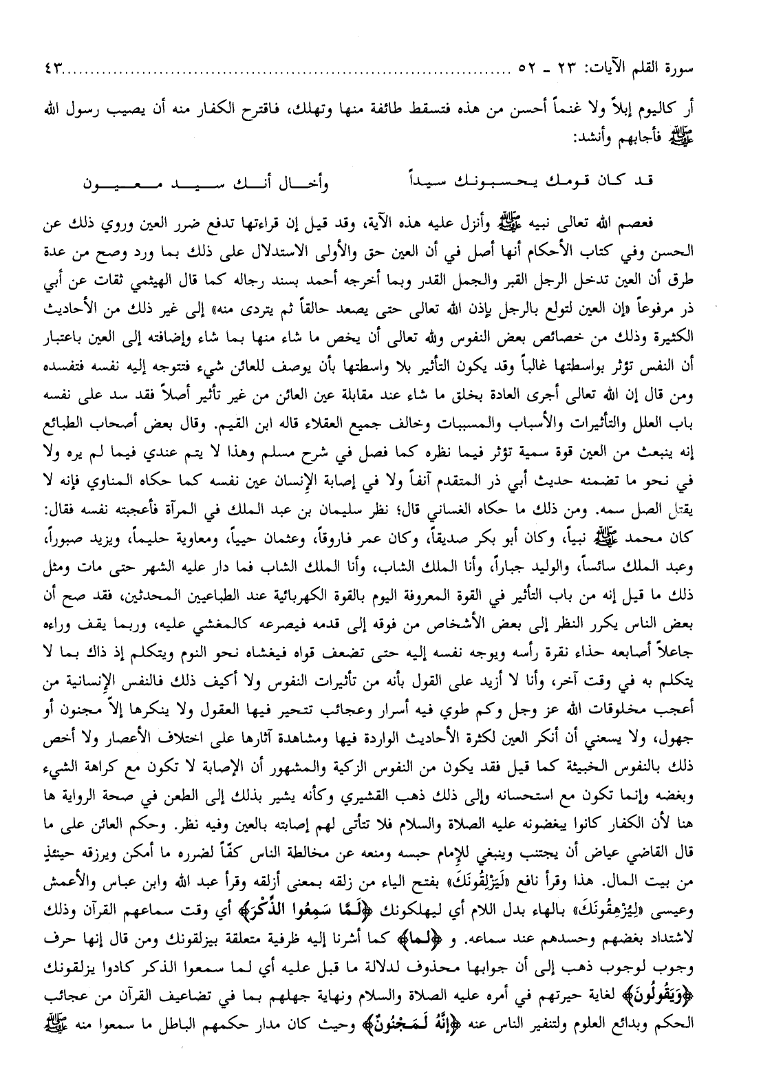 فعصم الله تعالى نبيه صلّى الله عليه وسلم وأنزل عليه هذه الآية، وقد قيل إن قراءتها تدفع ضرر العين وروي ذلك عن الحسن وفي كتاب الأحكام أنها أصل في أن العين حق والأولى الاستدلال على ذلك بما ورد وصح من عدة طرق أن العين تدخل الرجل القبر والجمل القدر وبما