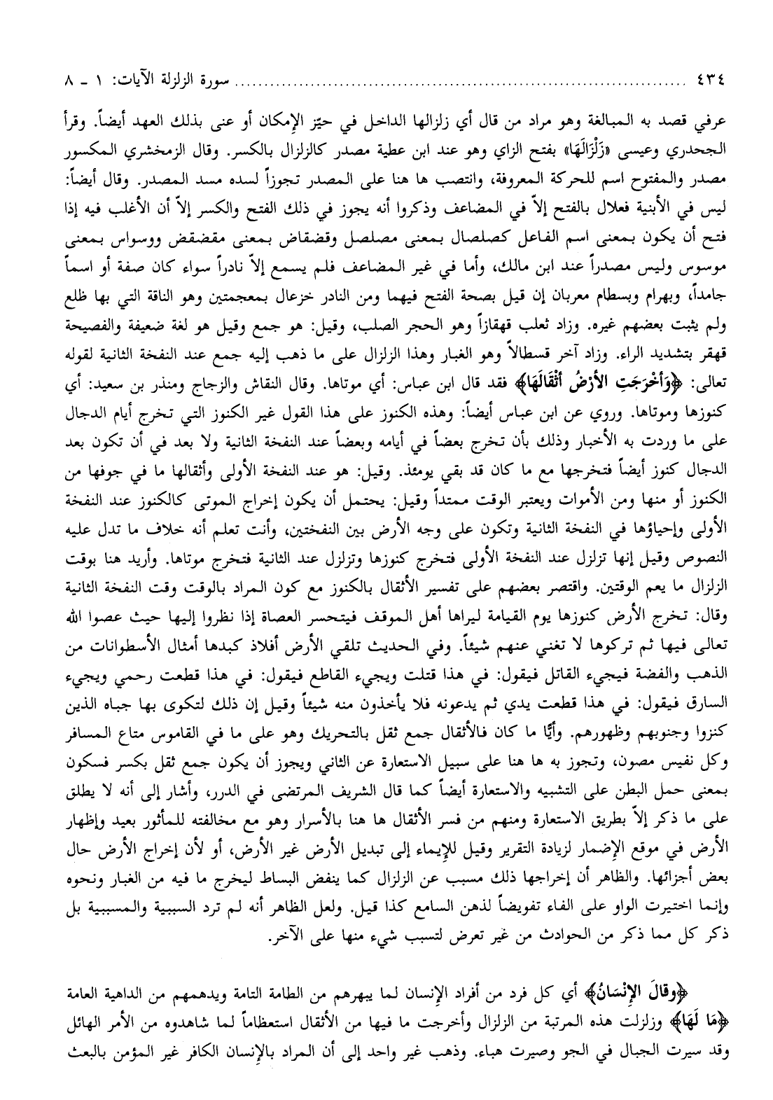 عرفي قصد به المبالغة وهو مراد من قال أي زلزالها الداخل في حيّز الإمكان أو عنى بذلك العهد أيضا. وقرأ الجحدري وعيسى «زلزالها» بفتح الزاي وهو عند ابن عطية مصدر كالزلزال بالكسر. وقال الزمخشري المكسور مصدر والمفتوح اسم للحركة المعروفة، وانتصب هاهنا على المصدر تجوزا لسده مسد المصدر. وقال أيضا: