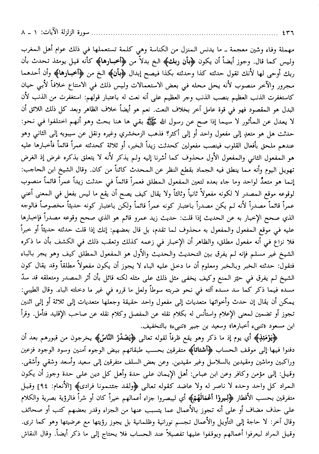 مهملة وفاء وشين معجمة- ما يدنس المنزل من الكناسة وهي كلمة تستعملها في ذلك عوام أهل المغرب وليس كما قال. وجوز أيضا أن يكون بِأَنَّ رَبَّكَ إلخ بدلا من أَخْبارَها كأنه قيل يومئذ تحدث بأن ربك أوحى لها لأنك تقول حدثته كذا وحدثته بكذا فيصح إبدال بِأَنَّ إلخ من أَخْبارَها وأن أحدهما مجرور والآخر منصوب لأنه يحل محله في بعض الاستعمالات وليس ذلك في الامتناع خلافا لأبي حيان كاستغفرت الذنب العظيم بنصب الذنب وجر العظيم على أنه نعت له باعتبار قولهم: استغفرت من الذنب لأن البدل هو المقصود فهو في قوة عامل آخر بخلاف النعت. نعم هو أيضا خلاف الظاهر وبعد كل ذلك اللائق أن لا يعدل عن المأثور لا سيما إذا صح عن رسول الله صلّى الله عليه وسلم بقي هاهنا بحث وهو أنهم اختلفوا في نحو: