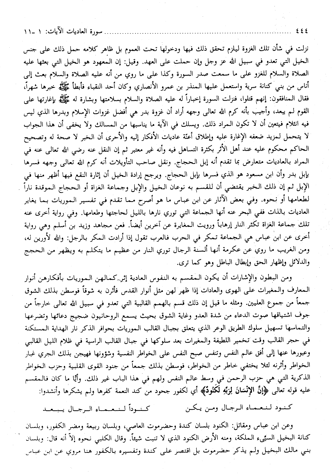 ومن البطون والإشارات أن يكون المقسم به النفوس العادية إثر كمالهن الموريات بأفكارهن أنوار المعارف والمغيرات على الهوى والعادات إذا ظهر لهن مثل أنوار القدس فأثرن به شوقا فوسطن بذلك الشوق جمعا من جموع العليين. ومثله ما قيل إن ذلك قسم بالهمم القالبية التي تعدو في سبيل الله تعالى خارجا من جوف اشتياقها صوت الدعاء من شدة العدو وغاية الشوق بحيث يسمع الروحانيون ضجيج دعائها وتضرعها والتماسها تسهيل سلوك الطريق الوعر الذي يتعلق بجبال القالب الموريات بحوافر الذكر نار الهداية المستكنة في حجر القالب وقت تخمير اللطيفة والمغيرات بعد سلوكها في جبال القالب الراسية في ظلام الليل القالبي وعبورها عنها إلى أفق عالم النفس وتنفس صبح النفس على الخواطر النفسية وشؤونها فهيجن بذلك الجري غبار الخواطر وأثرنه لئلا يختفي خاطر من الخواطر، فوسطن بذلك جمعا من جنود القوى القلبية وحزب الخواطر الذكرية التي هي حزب الرحمن في وسط عالم النفس ولهم في هذا الباب غير ذلك. وأيّا ما كان فالمقسم عليه قوله تعالى إِنَّ الْإِنْسانَ لِرَبِّهِ لَكَنُودٌ أي لكفور جحود من كند النعمة كفرها ولم يشكرها وأنشدوا: