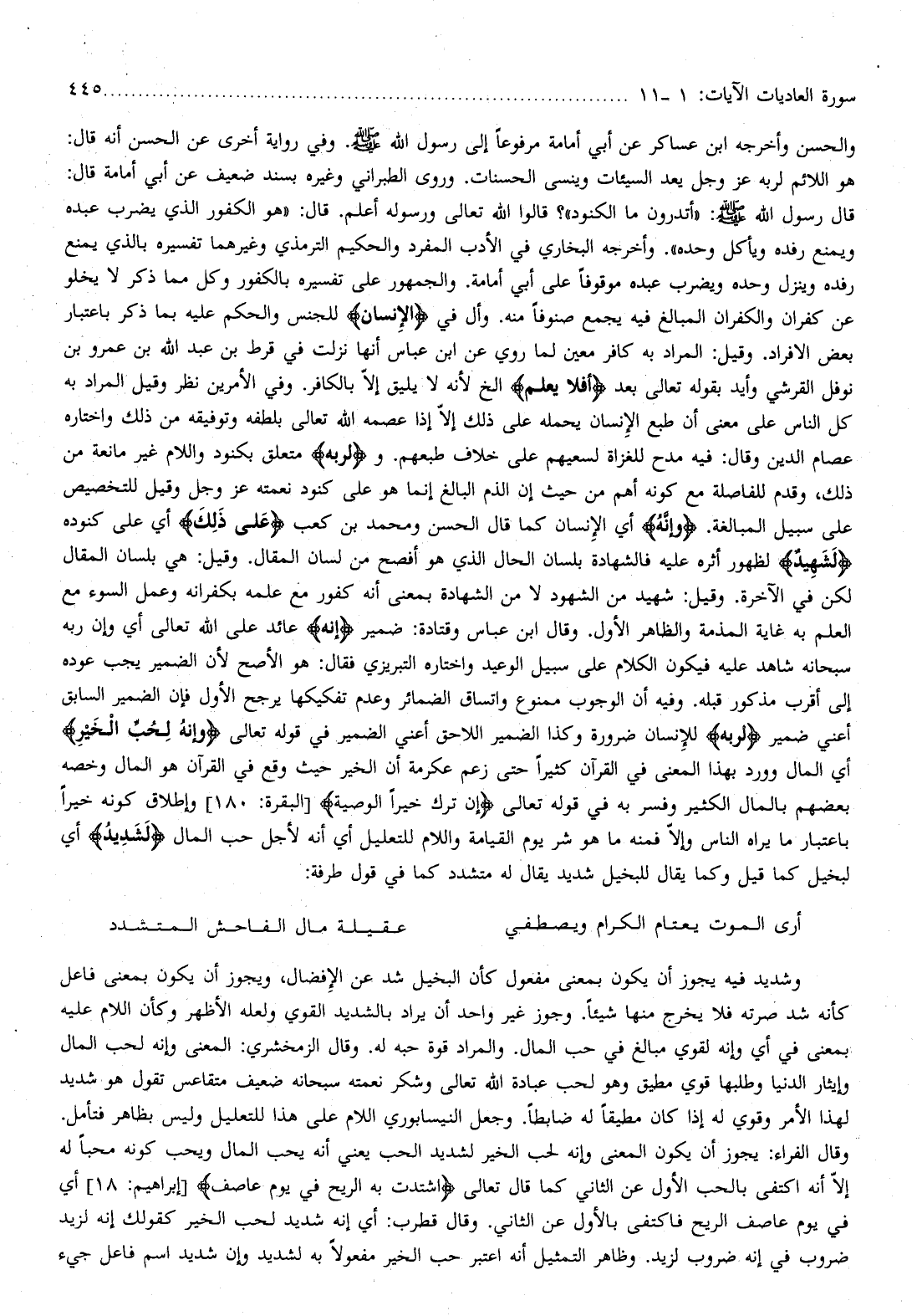 . وأخرجه البخاري في الأدب المفرد والحكيم الترمذي وغيرهما تفسيره بالذي يمنع رفده وينزل وحده ويضرب عبده موقوفا على أبي أمامة. والجمهور على تفسيره بالكفور وكل مما ذكر لا يخلو عن كفران والكفران المبالغ فيه يجمع صنوفا منه. وأل في الْإِنْسانَ للجنس والحكم عليه بما ذكر باعتبار بعض الافراد. وقيل: المراد به كافر معين لما روي عن ابن عباس أنها نزلت في قرط بن عبد الله بن عمرو بن نوفل القرشي وأيد بقوله تعالى بعد أَفَلا يَعْلَمُ إلخ لأنه لا يليق إلّا بالكافر. وفي الأمرين نظر وقيل المراد به كل الناس على معنى أن طبع الإنسان يحمله على ذلك إلّا إذا عصمه الله تعالى بلطفه وتوفيقه من ذلك واختاره عصام الدين وقال: فيه مدح للغزاة لسعيهم على خلاف طبعهم. ولِرَبِّهِ متعلق بكنود واللام غير مانعة من ذلك، وقدم للفاصلة مع كونه أهم من حيث إن الذم البالغ إنما هو على كنود نعمته عز وجل وقيل للتخصيص على سبيل المبالغة. وَإِنَّهُ أي الإنسان كما قال الحسن ومحمد بن كعب عَلى ذلِكَ أي على كنوده لَشَهِيدٌ لظهور أثره عليه فالشهادة بلسان الحال الذي هو أفصح من لسان المقال. وقيل: هي بلسان المقال لكن في الآخرة. وقيل: شهيد من الشهود لا من الشهادة بمعنى أنه كفور مع علمه بكفرانه وعمل السوء مع العلم به غاية المذمة والظاهر الأول. وقال ابن عباس وقتادة: ضمير إِنَّهُ عائد على الله تعالى أي وإن ربه سبحانه شاهد عليه فيكون الكلام على سبيل الوعيد واختاره التبريزي فقال: هو الأصح لأن الضمير يجب عوده إلى أقرب مذكور قبله. وفيه أن الوجوب ممنوع واتساق الضمائر وعدم تفكيكها يرجح الأول فإن الضمير السابق أعني ضمير لِرَبِّهِ للإنسان ضرورة وكذا الضمير اللاحق أعني الضمير في قوله تعالى وَإِنَّهُ لِحُبِّ الْخَيْرِ أي المال وورد بهذا المعنى في القرآن كثيرا حتى زعم عكرمة أن الخير حيث وقع في القرآن هو المال وخصه بعضهم بالمال الكثير وفسر به في قوله تعالى إِنْ تَرَكَ خَيْراً الْوَصِيَّةُ [البقرة: 180] وإطلاق كونه خيرا باعتبار ما يراه الناس وإلّا فمنه ما هو شر يوم القيامة واللام للتعليل أي أنه لأجل حب المال لَشَدِيدٌ أي لبخيل كما قيل وكما يقال للبخيل شديد يقال له متشدد كما في قول طرفة:
