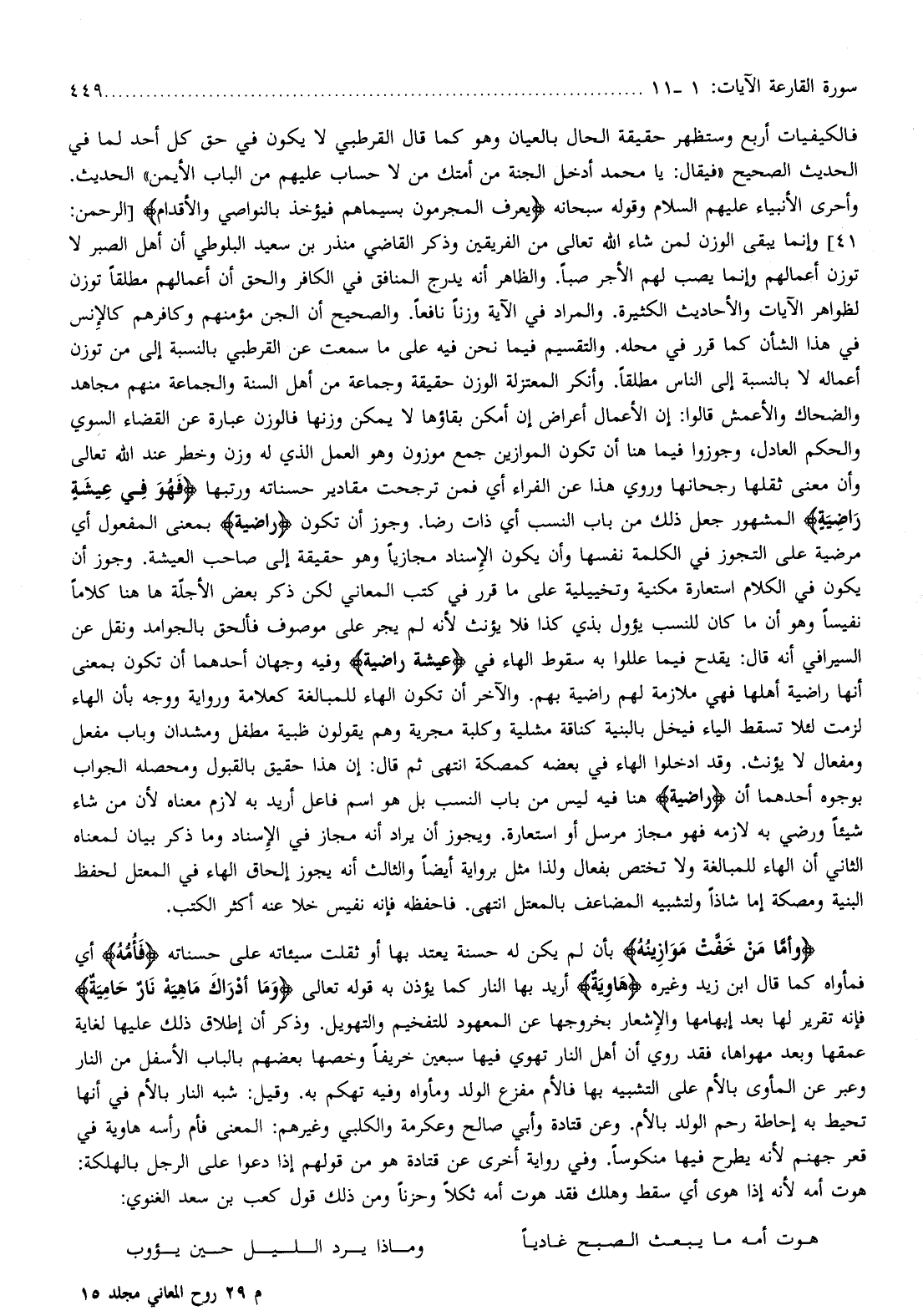 41] وإنما يبقى الوزن لمن شاء الله تعالى من الفريقين وذكر القاضي منذر بن سعيد البلوطي أن أهل الصبر لا توزن أعمالهم وإنما يصب لهم الأجر صبا. والظاهر أنه يدرج المنافق في الكافر والحق أن أعمالهم مطلقا توزن لظواهر الآيات والأحاديث الكثيرة. والمراد في الآية وزنا نافعا. والصحيح أن الجن مؤمنهم وكافرهم كالإنس في هذا الشأن كما قرر في محله. والتقسيم فيما نحن فيه على ما سمعت عن القرطبي بالنسبة إلى من توزن أعماله لا بالنسبة إلى الناس مطلقا. وأنكر المعتزلة الوزن حقيقة وجماعة من أهل السنة والجماعة منهم مجاهد والضحاك والأعمش قالوا: إن الأعمال أعراض إن أمكن بقاؤها لا يمكن وزنها فالوزن عبارة عن القضاء السوي والحكم العادل، وجوزوا فيما هنا أن تكون الموازين جمع موزون وهو العمل الذي له وزن وخطر عند الله تعالى وأن معنى ثقلها رجحانها وروي هذا عن الفراء أي فمن ترجحت مقادير حسناته ورتبها فَهُوَ فِي عِيشَةٍ راضِيَةٍ المشهور جعل ذلك من باب النسب أي ذات رضا. وجوز أن تكون راضِيَةٍ بمعنى المفعول أي مرضية على التجوز في الكلمة نفسها وأن يكون الإسناد مجازيا وهو حقيقة إلى صاحب العيشة. وجوز أن يكون في الكلام استعارة مكنية وتخييلية على ما قرر في كتب المعاني لكن ذكر بعض الأجلّة هاهنا كلاما نفيسا وهو أن ما كان للنسب يؤول بذي كذا فلا يؤنث لأنه لم يجر على موصوف فألحق بالجوامد ونقل عن السيرافي أنه قال: يقدح فيما عللوا به سقوط الهاء في عِيشَةٍ راضِيَةٍ وفيه وجهان أحدهما أن تكون بمعنى أنها راضية أهلها فهي ملازمة لهم راضية بهم. والآخر أن تكون الهاء للمبالغة كعلامة ورواية ووجه بأن الهاء لزمت لئلا تسقط الياء فيخل بالبنية كناقة مشلية وكلبة مجرية وهم يقولون ظبية مطفل ومشدان وباب مفعل ومفعال لا يؤنث. وقد ادخلوا الهاء في بعضه كمصكة انتهى ثم قال: إن هذا حقيق بالقبول ومحصله الجواب بوجوه أحدهما أن راضِيَةٍ هنا فيه ليس من باب النسب بل هو اسم فاعل أريد به لازم معناه لأن من شاء شيئا ورضي به لازمه فهو مجاز مرسل أو استعارة. ويجوز أن يراد أنه مجاز في الإسناد وما ذكر بيان لمعناه الثاني أن الهاء للمبالغة ولا تختص بفعال ولذا مثل برواية أيضا والثالث أنه يجوز إلحاق الهاء في المعتل لحفظ البنية ومصكة إما شاذا ولتشبيه المضاعف بالمعتل انتهى. فاحفظه فإنه نفيس خلا عنه أكثر الكتب.