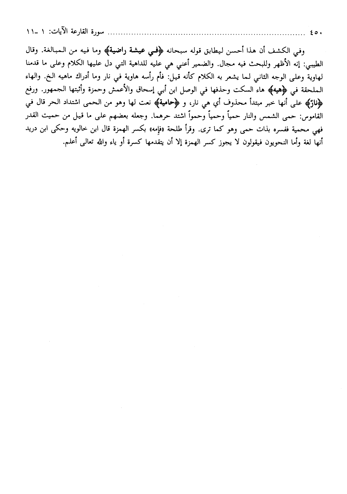 وفي الكشف أن هذا أحسن ليطابق قوله سبحانه فِي عِيشَةٍ راضِيَةٍ وما فيه من المبالغة. وقال الطيبي: إنه الأظهر وللبحث فيه مجال. والضمير أعني هي عليه للداهية التي دل عليها الكلام وعلى ما قدمنا لهاوية وعلى الوجه الثاني لما يشعر به الكلام كأنه قيل: فأم رأسه هاوية في نار وما أدراك ماهيه إلخ. والهاء الملحقة في هِيَهْ هاء السكت وحذفها في الوصل ابن أبي إسحاق والأعمش وحمزة وأثبتها الجمهور. ورفع نارٌ على أنها خبر مبتدأ محذوف أي هي نار، وحامِيَةٌ نعت لها وهو من الحمى اشتداد الحر قال في القاموس: حمى الشمس والنار حميا وحميا وحموا اشتد حرهما. وجعله بعضهم على ما قيل من حميت القدر فهي محمية ففسره بذات حمى وهو كما ترى. وقرأ طلحة «فإمه» بكسر الهمزة قال ابن خالويه وحكى ابن دريد أنها لغة وأما النحويون فيقولون لا يجوز كسر الهمزة إلا أن يتقدمها كسرة أو ياء والله تعالى أعلم.