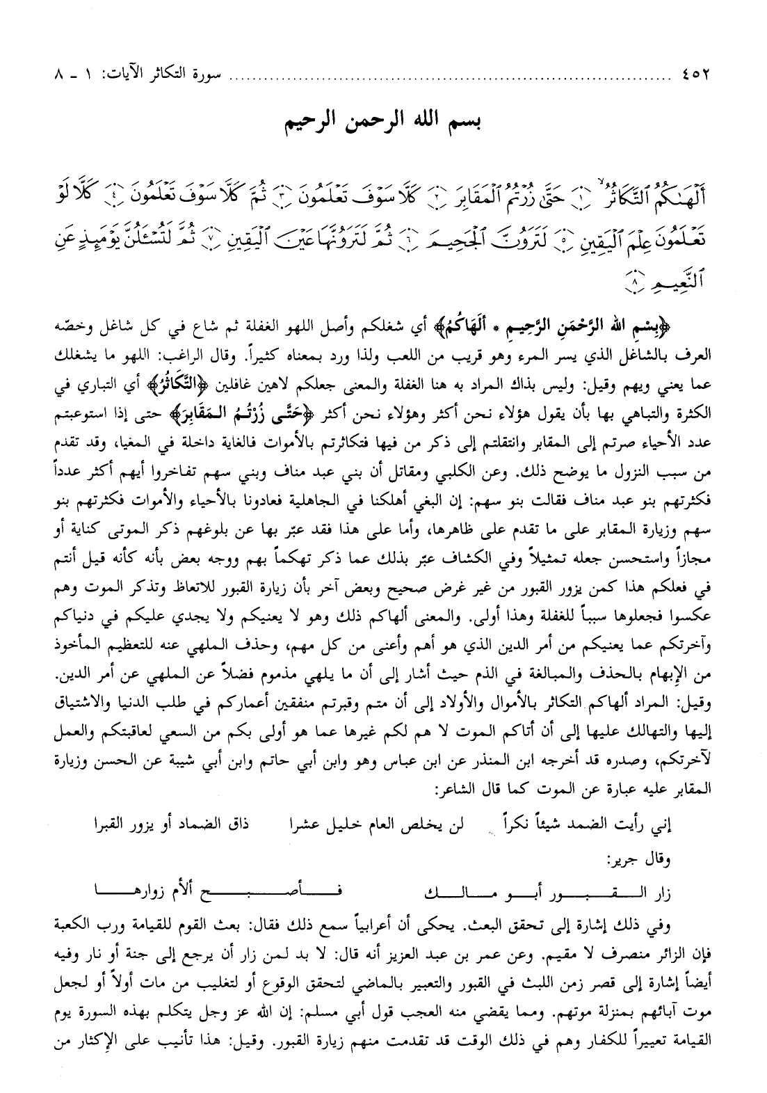 بِسْمِ اللَّهِ الرَّحْمنِ الرَّحِيمِ أَلْهاكُمُ أي شغلكم وأصل اللهو الغفلة ثم شاع في كل شاغل وخصّه العرف بالشاغل الذي يسر المرء وهو قريب من اللعب ولذا ورد بمعناه كثيرا. وقال الراغب: اللهو ما يشغلك عما يعني ويهم وقيل: وليس بذاك المراد به هنا الغفلة والمعنى جعلكم لاهين غافلين التَّكاثُرُ أي التباري في الكثرة والتباهي بها بأن يقول هؤلاء نحن أكثر وهؤلاء نحن أكثر حَتَّى زُرْتُمُ الْمَقابِرَ حتى إذا استوعبتم عدد الأحياء صرتم إلى المقابر وانتقلتم إلى ذكر من فيها فتكاثرتم بالأموات فالغاية داخلة في المغيا، وقد تقدم من سبب النزول ما يوضح ذلك. وعن الكلبي ومقاتل أن بني عبد مناف وبني سهم تفاخروا أيهم أكثر عددا فكثرتهم بنو عبد مناف فقالت بنو سهم: إن البغي أهلكنا في الجاهلية فعادونا بالأحياء والأموات فكثرتهم بنو سهم وزيارة المقابر على ما تقدم على ظاهرها، وأما على هذا فقد عبّر بها عن بلوغهم ذكر الموتى كناية أو مجازا واستحسن جعله تمثيلا وفي الكشاف عبّر بذلك عما ذكر تهكما بهم ووجه بعض بأنه كأنه قيل أنتم في فعلكم هذا كمن يزور القبور من غير غرض صحيح وبعض آخر بأن زيارة القبور للاتعاظ وتذكر الموت وهم عكسوا فجعلوها سببا للغفلة وهذا أولى. والمعنى ألهاكم ذلك وهو لا يعنيكم ولا يجدي عليكم في دنياكم وآخرتكم عما يعنيكم من أمر الدين الذي هو أهم وأعنى من كل مهم، وحذف الملهي عنه للتعظيم المأخوذ من الإبهام بالحذف والمبالغة في الذم حيث أشار إلى أن ما يلهي مذموم فضلا عن الملهي عن أمر الدين.