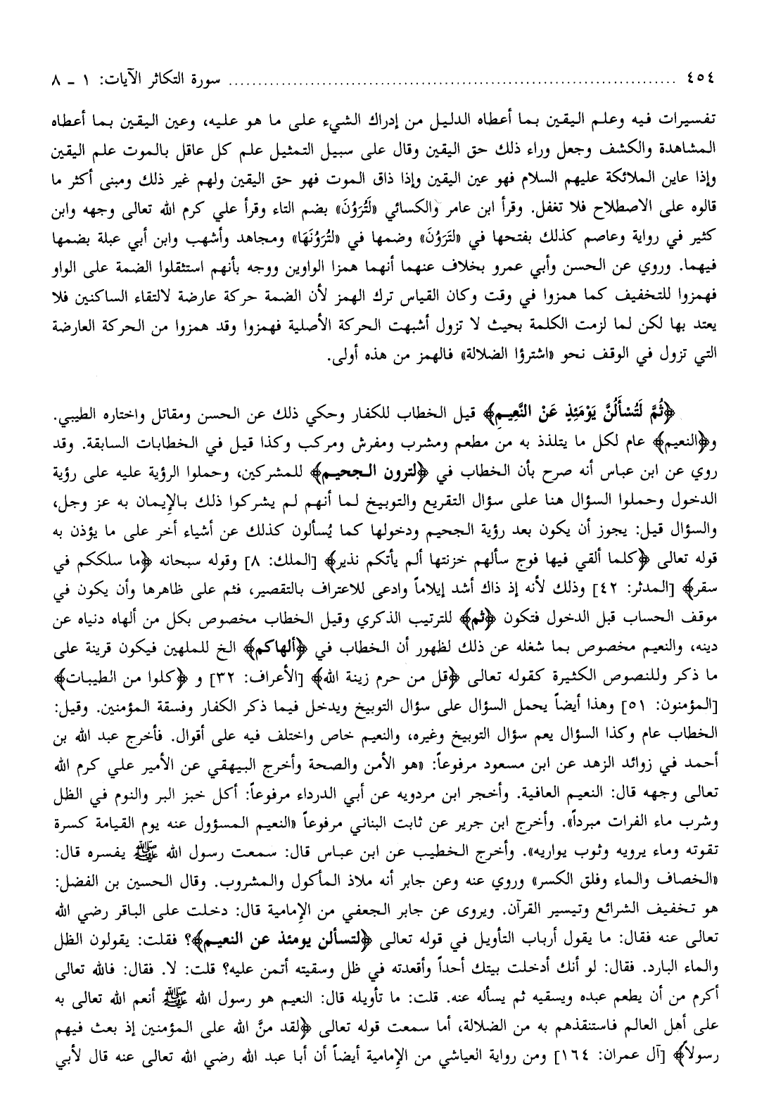 ويروى عن جابر الجعفي من الإمامية قال: دخلت على الباقر رضي الله تعالى عنه فقال: ما يقول أرباب التأويل في قوله تعالى لَتُسْئَلُنَّ يَوْمَئِذٍ عَنِ النَّعِيمِ؟ فقلت: يقولون الظل والماء البارد. فقال: لو أنك أدخلت بيتك أحدا وأقعدته في ظل وسقيته أتمن عليه؟ قلت: لا. فقال: فالله تعالى أكرم من أن يطعم عبده ويسقيه ثم يسأله عنه. قلت: ما تأويله قال: النعيم هو رسول الله صلّى الله عليه وسلم أنعم الله تعالى به على أهل العالم فاستنقذهم به من الضلالة، أما سمعت قوله تعالى لَقَدْ مَنَّ اللَّهُ عَلَى الْمُؤْمِنِينَ إِذْ بَعَثَ فِيهِمْ رَسُولًا [آل عمران: 164]
