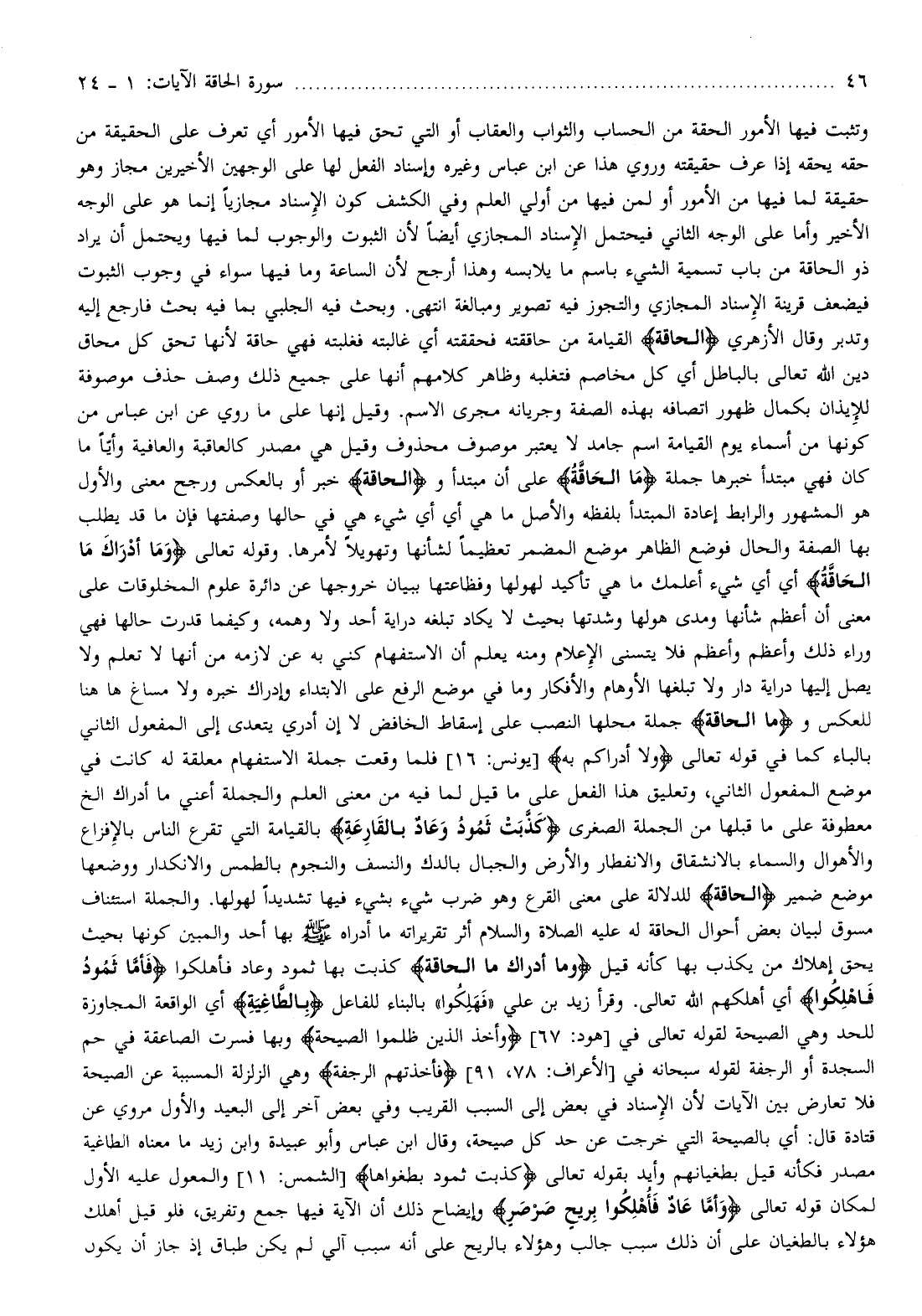 وتثبت فيها الأمور الحقة من الحساب والثواب والعقاب أو التي تحق فيها الأمور أي تعرف على الحقيقة من حقه يحقه إذا عرف حقيقته وروي هذا عن ابن عباس وغيره وإسناد الفعل لها على الوجهين الأخيرين مجاز وهو حقيقة لما فيها من الأمور أو لمن فيها من أولي العلم وفي الكشف كون الإسناد مجازيا إنما هو على الوجه الأخير وأما على الوجه الثاني فيحتمل الإسناد المجازي أيضا لأن الثبوت والوجوب لما فيها ويحتمل أن يراد ذو الحاقة من باب تسمية الشيء باسم ما يلابسه وهذا أرجح لأن الساعة وما فيها سواء في وجوب الثبوت فيضعف قرينة الإسناد المجازي والتجوز فيه تصوير ومبالغة انتهى. وبحث فيه الجلبي بما فيه بحث فارجع إليه وتدبر وقال الأزهري الْحَاقَّةُ القيامة من حاققته فحققته أي غالبته فغلبته فهي حاقة لأنها تحق كل محاق دين الله تعالى بالباطل أي كل مخاصم فتغلبه وظاهر كلامهم أنها على جميع ذلك وصف حذف موصوفة للإيذان بكمال ظهور اتصافه بهذه الصفة وجريانه مجرى الاسم. وقيل إنها على ما روي عن ابن عباس من كونها من أسماء يوم القيامة اسم جامد لا يعتبر موصوف محذوف وقيل هي مصدر كالعاقبة والعافية وأيّا ما كان فهي مبتدأ خبرها جملة مَا الْحَاقَّةُ على أن مبتدأ والْحَاقَّةُ خبر أو بالعكس ورجح معنى والأول هو المشهور والرابط إعادة المبتدأ بلفظه والأصل ما هي أي أي شيء هي في حالها وصفتها فإن ما قد يطلب بها الصفة والحال فوضع الظاهر موضع المضمر تعظيما لشأنها وتهويلا لأمرها. وقوله تعالى وَما أَدْراكَ مَا الْحَاقَّةُ أي أي شيء أعلمك ما هي تأكيد لهولها وفظاعتها ببيان خروجها عن دائرة علوم المخلوقات على معنى أن أعظم شأنها ومدى هولها وشدتها بحيث لا يكاد تبلغه دراية أحد ولا وهمه، وكيفما قدرت حالها فهي وراء ذلك وأعظم وأعظم فلا يتسنى الإعلام ومنه يعلم أن الاستفهام كني به عن لازمه من أنها لا تعلم ولا يصل إليها دراية دار ولا تبلغها الأوهام والأفكار وما في موضع الرفع على الابتداء وإدراك خبره ولا مساغ هاهنا للعكس ومَا الْحَاقَّةُ جملة محلها النصب على إسقاط الخافض لا إن أدري يتعدى إلى المفعول الثاني بالباء كما في قوله تعالى وَلا أَدْراكُمْ بِهِ [يونس: 16] فلما وقعت جملة الاستفهام معلقة له كانت في موضع المفعول الثاني، وتعليق هذا الفعل على ما قيل لما فيه من معنى العلم والجملة أعني ما أدراك إلخ معطوفة على ما قبلها من الجملة الصغرى كَذَّبَتْ ثَمُودُ وَعادٌ بِالْقارِعَةِ بالقيامة التي تقرع الناس بالإفزاع والأهوال والسماء بالانشقاق والانفطار والأرض والجبال بالدك والنسف والنجوم بالطمس والانكدار ووضعها موضع ضمير الْحَاقَّةُ للدلالة على معنى القرع وهو ضرب شيء بشيء فيها تشديدا لهولها. والجملة استئناف مسوق لبيان بعض أحوال الحاقة له عليه الصلاة والسلام أثر تقريراته ما أدراه صلّى الله عليه وسلم بها أحد والمبين كونها بحيث يحق إهلاك من يكذب بها كأنه قيل وَما أَدْراكَ مَا الْحَاقَّةُ كذبت بها ثمود وعاد فأهلكوا فَأَمَّا ثَمُودُ فَأُهْلِكُوا أي أهلكهم الله تعالى. وقرأ زيد بن علي «فهلكوا» بالبناء للفاعل بِالطَّاغِيَةِ أي الواقعة المجاوزة للحد وهي الصيحة لقوله تعالى في [هود: 67] وَأَخَذَ الَّذِينَ ظَلَمُوا الصَّيْحَةُ وبها فسرت الصاعقة في حم السجدة أو الرجفة لقوله سبحانه في [الأعراف: 78، 91] فَأَخَذَتْهُمُ الرَّجْفَةُ وهي الزلزلة المسببة عن الصيحة فلا تعارض بين الآيات لأن الإسناد في بعض إلى السبب القريب وفي بعض آخر إلى البعيد والأول مروي عن قتادة قال: أي بالصيحة التي خرجت عن حد كل صيحة، وقال ابن عباس وأبو عبيدة وابن زيد ما معناه الطاغية مصدر فكأنه قيل بطغيانهم وأيد بقوله تعالى كَذَّبَتْ ثَمُودُ بِطَغْواها [الشمس: 11] والمعول عليه الأول لمكان قوله تعالى وَأَمَّا عادٌ فَأُهْلِكُوا بِرِيحٍ صَرْصَرٍ وإيضاح ذلك أن الآية فيها جمع وتفريق، فلو قيل أهلك هؤلاء بالطغيان على أن ذلك سبب جالب وهؤلاء بالريح على أنه سبب آلي لم يكن طباق إذ جاز أن يكون
