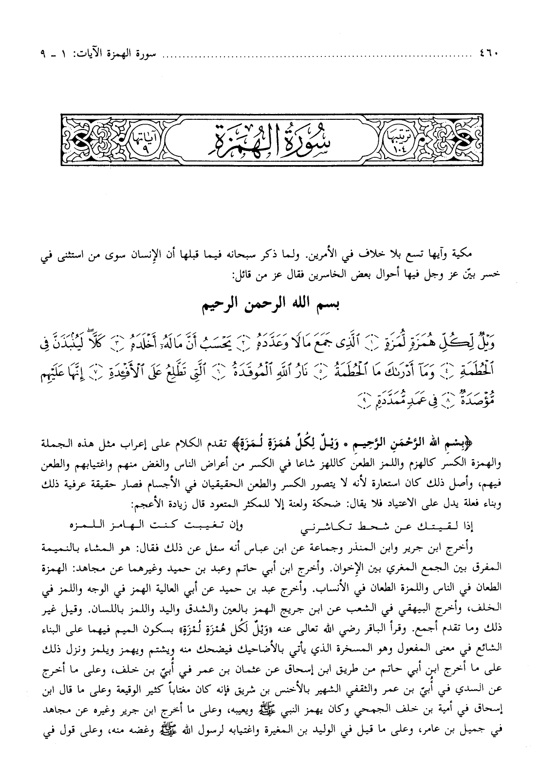 بِسْمِ اللَّهِ الرَّحْمنِ الرَّحِيمِ وَيْلٌ لِكُلِّ هُمَزَةٍ لُمَزَةٍ تقدم الكلام على إعراب مثل هذه الجملة والهمزة الكسر كالهزم واللمز الطعن كاللهز شاعا في الكسر من أعراض الناس والغض منهم واغتيابهم والطعن فيهم، وأصل ذلك كان استعارة لأنه لا يتصور الكسر والطعن الحقيقيان في الأجسام فصار حقيقة عرفية ذلك وبناء فعلة يدل على الاعتياد فلا يقال: ضحكة ولعنة إلا للمكثر المتعود قال زيادة الأعجم: