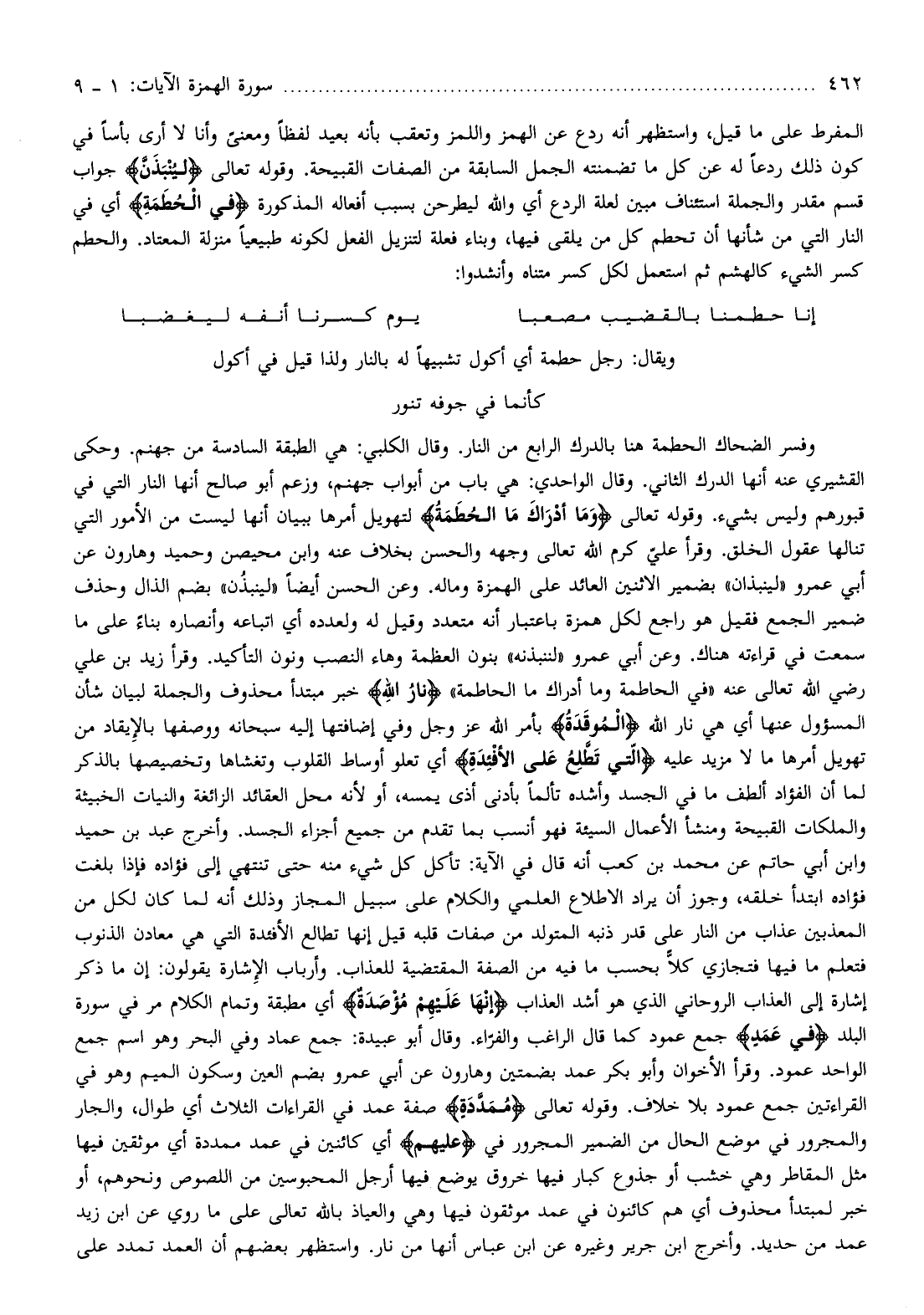 ويقال: رجل حطمة أي أكول تشبيها له بالنار ولذا قيل في أكول كأنما في جوفه تنور وفسر الضحاك الحطمة هنا بالدرك الرابع من النار. وقال الكلبي: هي الطبقة السادسة من جهنم. وحكى القشيري عنه أنها الدرك الثاني. وقال الواحدي: هي باب من أبواب جهنم، وزعم أبو صالح أنها النار التي في قبورهم وليس بشيء. وقوله تعالى وَما أَدْراكَ مَا الْحُطَمَةُ لتهويل أمرها ببيان أنها ليست من الأمور التي تنالها عقول الخلق. وقرأ عليّ كرم الله تعالى وجهه والحسن بخلاف عنه وابن محيصن وحميد وهارون عن أبي عمرو «لينبذان» بضمير الاثنين العائد على الهمزة وماله. وعن الحسن أيضا «لينبذن» بضم الذال وحذف ضمير الجمع فقيل هو راجع لكل همزة باعتبار أنه متعدد وقيل له ولعدده أي اتباعه وأنصاره بناء على ما سمعت في قراءته هناك. وعن أبي عمرو «لننبذنه» بنون العظمة وهاء النصب ونون التأكيد. وقرأ زيد بن علي رضي الله تعالى عنه «في الحاطمة وما أدراك ما الحاطمة» نارُ اللَّهِ خبر مبتدأ محذوف والجملة لبيان شأن المسئول عنها أي هي نار الله الْمُوقَدَةُ بأمر الله عز وجل وفي إضافتها إليه سبحانه ووصفها بالإيقاد من تهويل أمرها ما لا مزيد عليه الَّتِي تَطَّلِعُ عَلَى الْأَفْئِدَةِ أي تعلو أوساط القلوب وتغشاها وتخصيصها بالذكر لما أن الفؤاد ألطف ما في الجسد وأشده تألما بأدنى أذى يمسه، أو لأنه محل العقائد الزائغة والنيات الخبيثة والملكات القبيحة ومنشأ الأعمال السيئة فهو أنسب بما تقدم من جميع أجزاء الجسد. وأخرج عبد بن حميد وابن أبي حاتم عن محمد بن كعب أنه قال في الآية: تأكل كل شيء منه حتى تنتهي إلى فؤاده فإذا بلغت فؤاده ابتدأ خلقه، وجوز أن يراد الاطلاع العلمي والكلام على سبيل المجاز وذلك أنه لما كان لكل من المعذبين عذاب من النار على قدر ذنبه المتولد من صفات قلبه قيل إنها تطالع الأفئدة التي هي معادن الذنوب فتعلم ما فيها فتجازي كلّا بحسب ما فيه من الصفة المقتضية للعذاب. وأرباب الإشارة يقولون: إن ما ذكر إشارة إلى العذاب الروحاني الذي هو أشد العذاب إِنَّها عَلَيْهِمْ مُؤْصَدَةٌ أي مطبقة وتمام الكلام مر في سورة البلد فِي عَمَدٍ جمع عمود كما قال الراغب والفرّاء. وقال أبو عبيدة: جمع عماد وفي البحر وهو اسم جمع الواحد عمود. وقرأ الأخوان وأبو بكر عمد بضمتين وهارون عن أبي عمرو بضم العين وسكون الميم وهو في القراءتين جمع عمود بلا خلاف. وقوله تعالى مُمَدَّدَةٍ صفة عمد في القراءات الثلاث أي طوال، والجار والمجرور في موضع الحال من الضمير المجرور في عَلَيْهِمْ أي كائنين في عمد ممددة أي موثقين فيها مثل المقاطر وهي خشب أو جذوع كبار فيها خروق يوضع فيها أرجل المحبوسين من اللصوص ونحوهم، أو خبر لمبتدأ محذوف أي هم كائنون في عمد موثقون فيها وهي والعياذ بالله تعالى على ما روي عن ابن زيد عمد من حديد. وأخرج ابن جرير وغيره عن ابن عباس أنها من نار. واستظهر بعضهم أن العمد تمدد على