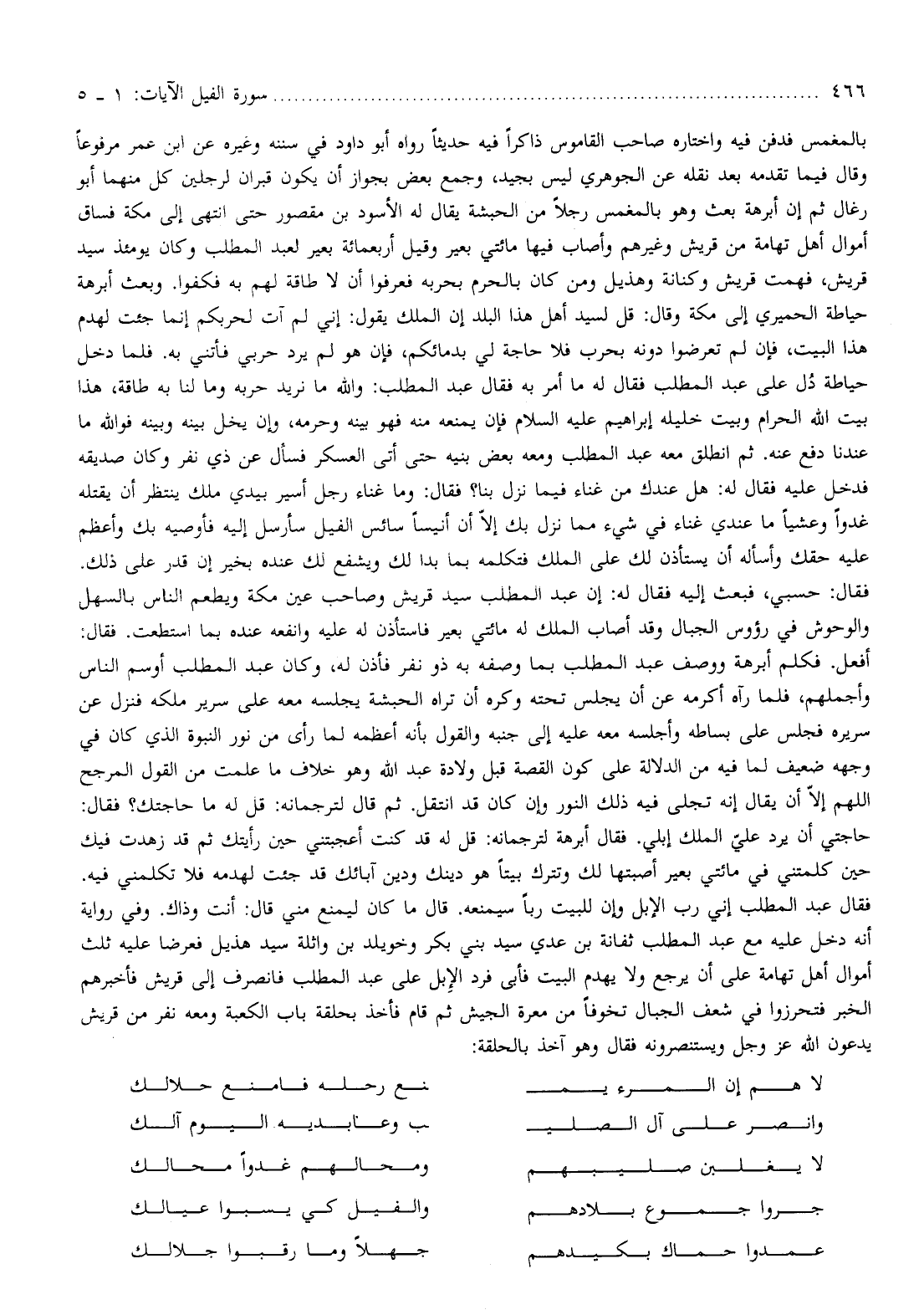 فقال عبد المطلب إني رب الإبل وإن للبيت ربا سيمنعه. قال ما كان ليمنع مني قال: أنت وذاك. وفي رواية أنه دخل عليه مع عبد المطلب ثفانة بن عدي سيد بني بكر وخويلد بن واثلة سيد هذيل فعرضا عليه ثلث أموال أهل تهامة على أن يرجع ولا يهدم البيت فأبى فرد الإبل على عبد المطلب فانصرف إلى قريش فأخبرهم الخبر فتحرزوا في شعف الجبال تخوفا من معرة الجيش ثم قام فأخذ بحلقة باب الكعبة ومعه نفر من قريش يدعون الله عز وجل ويستنصرونه فقال وهو آخذ بالحلقة:
