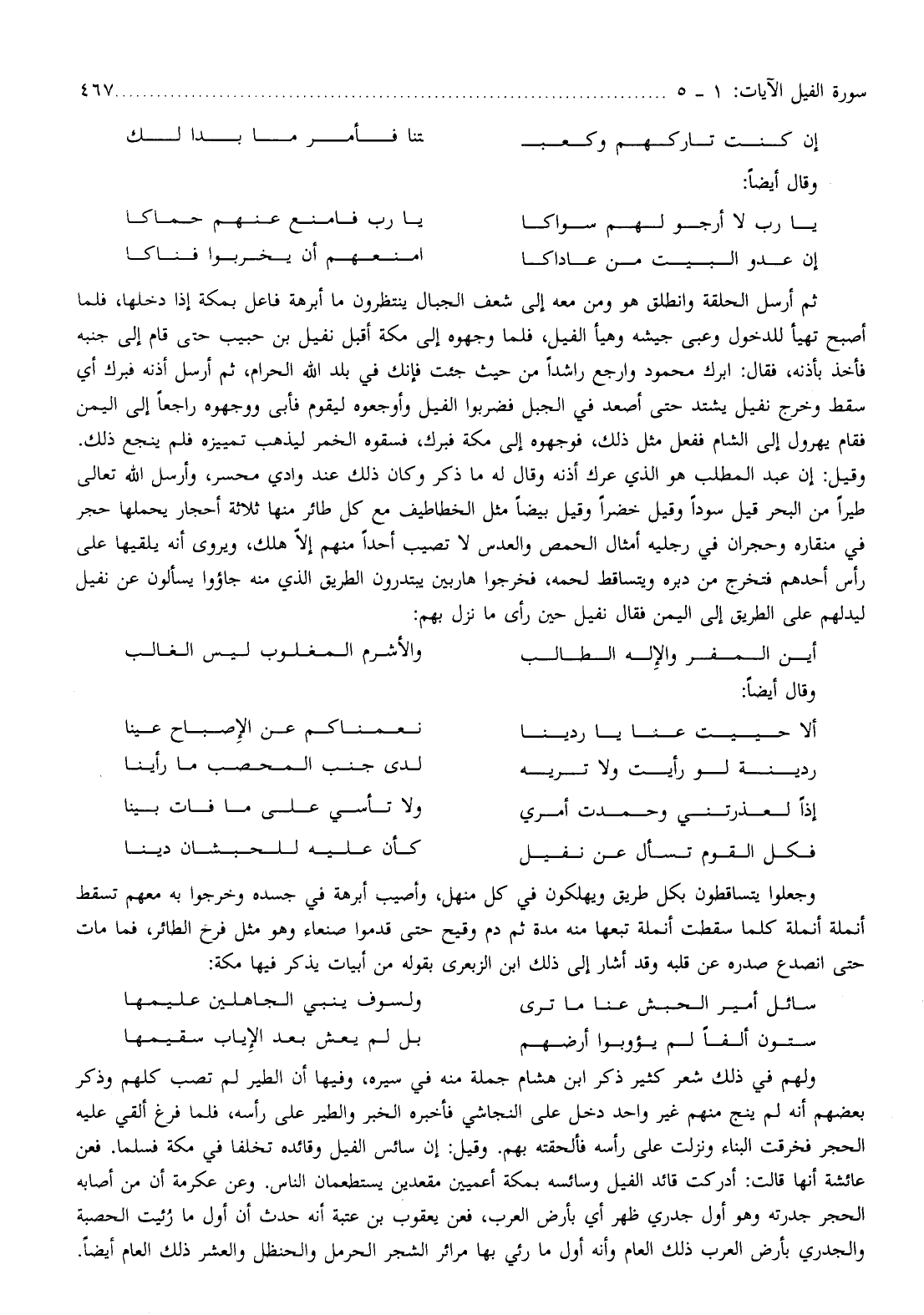 ولهم في ذلك شعر كثير ذكر ابن هشام جملة منه في سيره، وفيها أن الطير لم تصب كلهم وذكر بعضهم أنه لم ينج منهم غير واحد دخل على النجاشي فأخبره الخبر والطير على رأسه، فلما فرغ ألقي عليه الحجر فخرقت البناء ونزلت على رأسه فألحقته بهم. وقيل: إن سائس الفيل وقائده تخلفا في مكة فسلما. فعن عائشة أنها قالت: أدركت قائد الفيل وسائسه بمكة أعميين مقعدين يستطعمان الناس. وعن عكرمة أن من أصابه الحجر جدرته وهو أول جدري ظهر أي بأرض العرب، فعن يعقوب بن عتبة أنه حدث أن أول ما رئيت الحصبة والجدري بأرض العرب ذلك العام وأنه أول ما رئي بها مرائر الشجر الحرمل والحنظل والعشر ذلك العام أيضا.