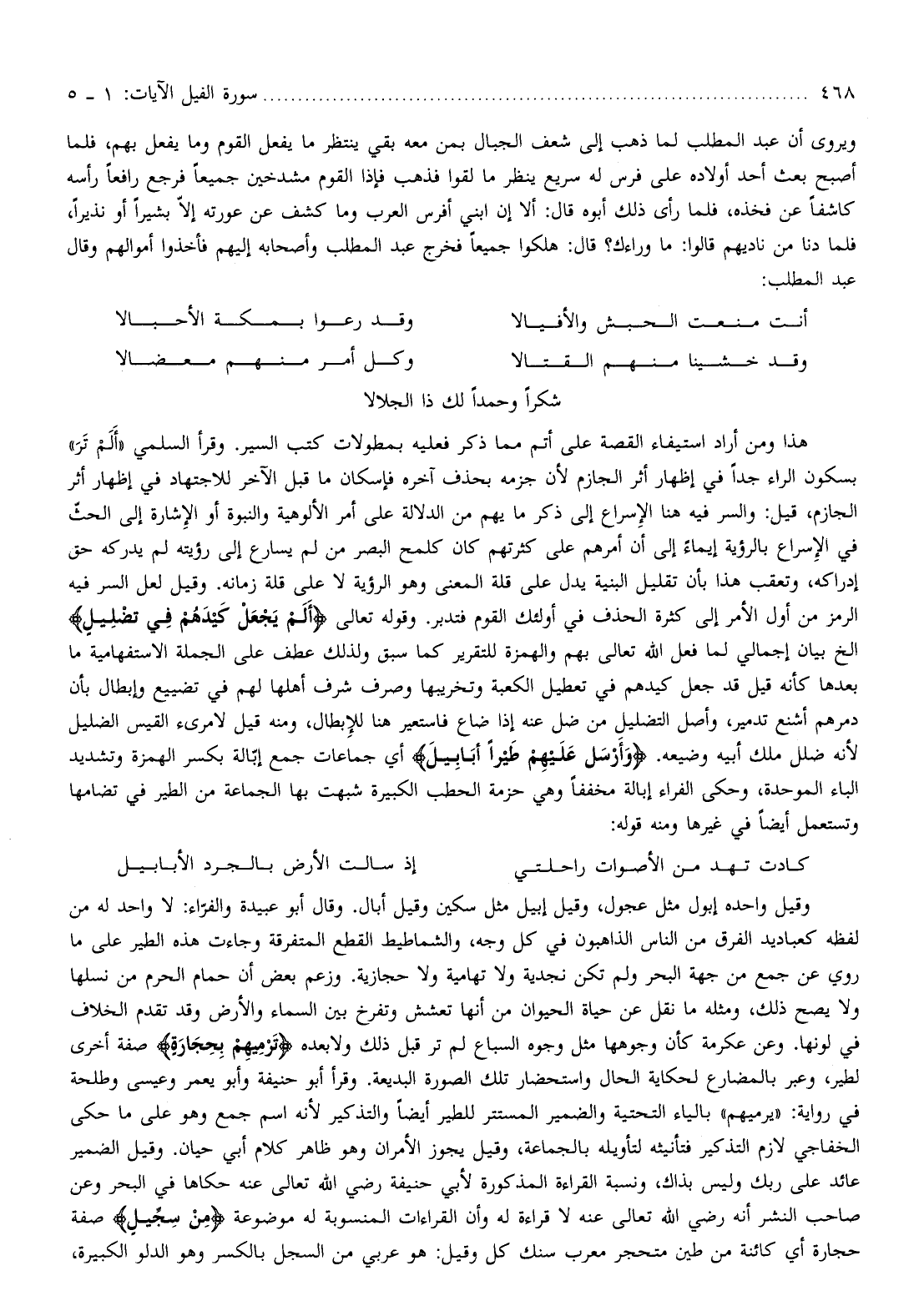 شكرا وحمدا لك ذا الجلالا هذا ومن أراد استيفاء القصة على أتم مما ذكر فعليه بمطولات كتب السير. وقرأ السلمي «ألم تر» بسكون الراء جدا في إظهار أثر الجازم لأن جزمه بحذف آخره فإسكان ما قبل الآخر للاجتهاد في إظهار أثر الجازم، قيل: والسر فيه هنا الإسراع إلى ذكر ما يهم من الدلالة على أمر الألوهية والنبوة أو الإشارة إلى الحثّ في الإسراع بالرؤية إيماء إلى أن أمرهم على كثرتهم كان كلمح البصر من لم يسارع إلى رؤيته لم يدركه حق إدراكه، وتعقب هذا بأن تقليل البنية يدل على قلة المعنى وهو الرؤية لا على قلة زمانه. وقيل لعل السر فيه الرمز من أول الأمر إلى كثرة الحذف في أولئك القوم فتدبر. وقوله تعالى أَلَمْ يَجْعَلْ كَيْدَهُمْ فِي تَضْلِيلٍ إلخ بيان إجمالي لما فعل الله تعالى بهم والهمزة للتقرير كما سبق ولذلك عطف على الجملة الاستفهامية ما بعدها كأنه قيل قد جعل كيدهم في تعطيل الكعبة وتخريبها وصرف شرف أهلها لهم في تضييع وإبطال بأن دمرهم أشنع تدمير، وأصل التضليل من ضل عنه إذا ضاع فاستعير هنا للإبطال، ومنه قيل لامرىء القيس الضليل لأنه ضلل ملك أبيه وضيعه. وَأَرْسَلَ عَلَيْهِمْ طَيْراً أَبابِيلَ أي جماعات جمع إبّالة بكسر الهمزة وتشديد الباء الموحدة، وحكى الفراء إبالة مخففا وهي حزمة الحطب الكبيرة شبهت بها الجماعة من الطير في تضامها وتستعمل أيضا في غيرها ومنه قوله: