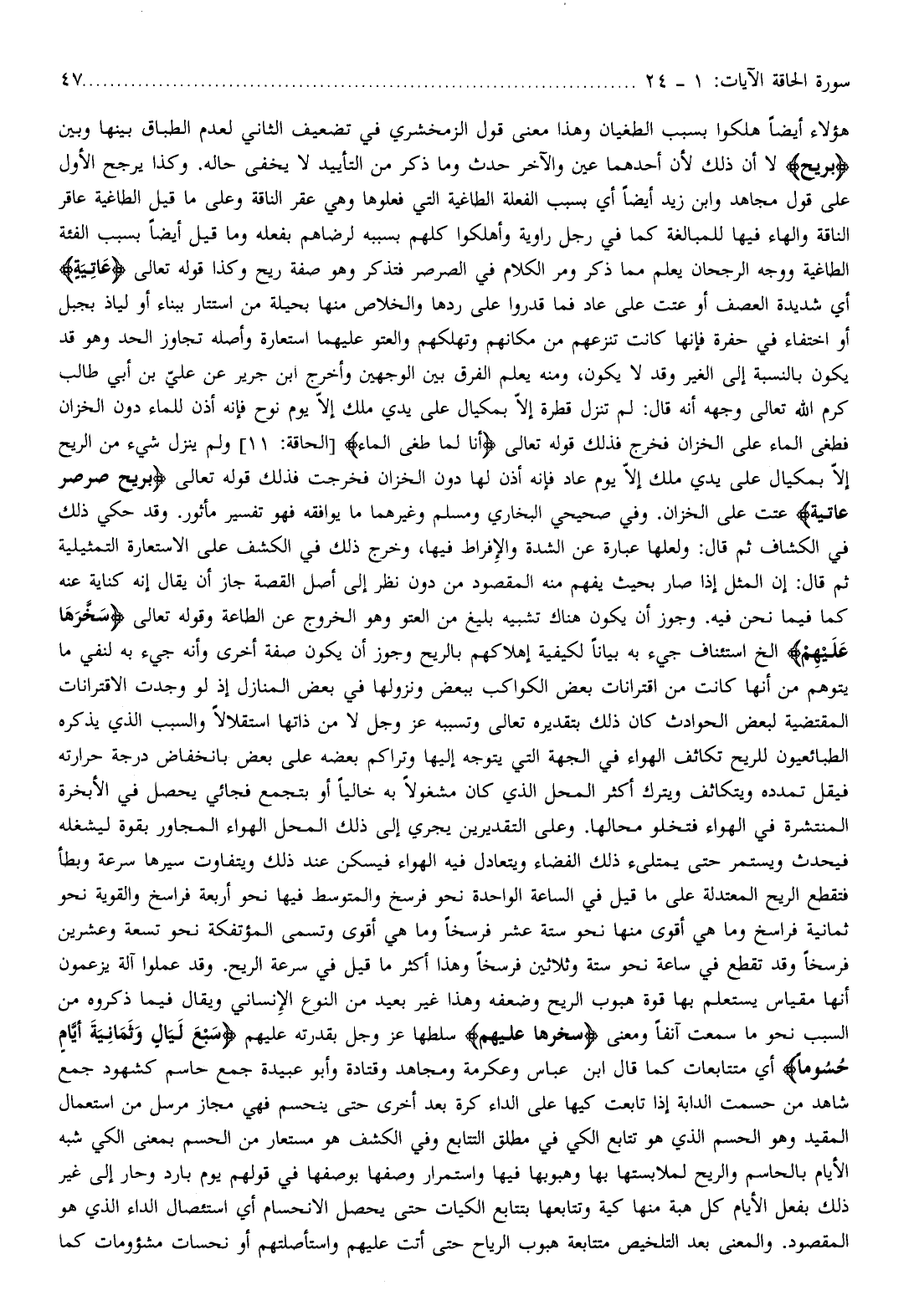 وفي صحيحي البخاري ومسلم وغيرهما ما يوافقه فهو تفسير مأثور. وقد حكي ذلك في الكشاف ثم قال: ولعلها عبارة عن الشدة والإفراط فيها، وخرج ذلك في الكشف على الاستعارة التمثيلية ثم قال: إن المثل إذا صار بحيث يفهم منه المقصود من دون نظر إلى أصل القصة جاز أن يقال إنه كناية عنه كما فيما نحن فيه. وجوز أن يكون هناك تشبيه بليغ من العتو وهو الخروج عن الطاعة وقوله تعالى سَخَّرَها عَلَيْهِمْ إلخ استئناف جيء به بيانا لكيفية إهلاكهم بالريح وجوز أن يكون صفة أخرى وأنه جيء به لنفي ما يتوهم من أنها كانت من اقترانات بعض الكواكب ببعض ونزولها في بعض المنازل إذ لو وجدت الاقترانات المقتضية لبعض الحوادث كان ذلك بتقديره تعالى وتسببه عز وجل لا من ذاتها استقلالا والسبب الذي يذكره الطبائعيون للريح تكاثف الهواء في الجهة التي يتوجه إليها وتراكم بعضه على بعض بانخفاض درجة حرارته فيقل تمدده ويتكاثف ويترك أكثر المحل الذي كان مشغولا به خاليا أو بتجمع فجائي يحصل في الأبخرة المنتشرة في الهواء فتخلو محالها. وعلى التقديرين يجري إلى ذلك المحل الهواء المجاور بقوة ليشغله فيحدث ويستمر حتى يمتلىء ذلك الفضاء ويتعادل فيه الهواء فيسكن عند ذلك ويتفاوت سيرها سرعة وبطأ فتقطع الريح المعتدلة على ما قيل في الساعة الواحدة نحو فرسخ والمتوسط فيها نحو أربعة فراسخ والقوية نحو ثمانية فراسخ وما هي أقوى منها نحو ستة عشر فرسخا وما هي أقوى وتسمى المؤتفكة نحو تسعة وعشرين فرسخا وقد تقطع في ساعة نحو ستة وثلاثين فرسخا وهذا أكثر ما قيل في سرعة الريح. وقد عملوا آلة يزعمون أنها مقياس يستعلم بها قوة هبوب الريح وضعفه وهذا غير بعيد من النوع الإنساني ويقال فيما ذكروه من السبب نحو ما سمعت آنفا ومعنى سَخَّرَها عَلَيْهِمْ سلطها عز وجل بقدرته عليهم سَبْعَ لَيالٍ وَثَمانِيَةَ أَيَّامٍ حُسُوماً أي متتابعات كما قال ابن عباس وعكرمة ومجاهد وقتادة وأبو عبيدة جمع حاسم كشهود جمع شاهد من حسمت الدابة إذا تابعت كيها على الداء كرة بعد أخرى حتى ينحسم فهي مجاز مرسل من استعمال المقيد وهو الحسم الذي هو تتابع الكي في مطلق التتابع وفي الكشف هو مستعار من الحسم بمعنى الكي شبه الأيام بالحاسم والريح لملابستها بها وهبوبها فيها واستمرار وصفها بوصفها في قولهم يوم بارد وحار إلى غير ذلك بفعل الأيام كل هبة منها كية وتتابعها بتتابع الكيات حتى يحصل الانحسام أي استئصال الداء الذي هو المقصود. والمعنى بعد التلخيص متتابعة هبوب الرياح حتى أتت عليهم واستأصلتهم أو نحسات مشؤومات كما