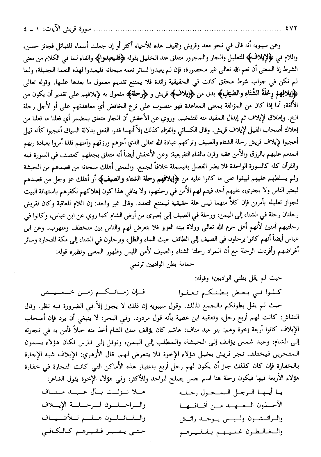 حيث لم يقل بطونكم بالجمع لذلك. وقول سيبويه إن ذلك لا يجوز إلّا في الضرورة فيه نظر. وقال النقاش: كانت لهم أربع رحل، وتعقبه ابن عطية بأنه قول مردود. وفي البحر: لا ينبغي أن يرد فإن أصحاب الإيلاف كانوا أربعة إخوة وهم: بنو عبد مناف: هاشم كان يؤالف ملك الشام أخذ منه خيلا فأمن به في تجارته إلى الشام، وعبد شمس يؤالف إلى الحبشة، والمطلب إلى اليمن، ونوفل إلى فارس فكان هؤلاء يسمون المتجرين فيختلف تجر قريش بخيل هؤلاء الإخوة فلا يتعرض لهم. قال الأزهري: الإيلاف شبه الإجارة بالخفارة فإن كان كذلك جاز أن يكون لهم رحل أربع باعتبار هذه الأماكن التي كانت التجارة في خفارة هؤلاء الأربعة فيها فيكون رحلة هنا اسم جنس يصلح للواحد وللأكثر، وفي هؤلاء الإخوة يقول الشاعر: