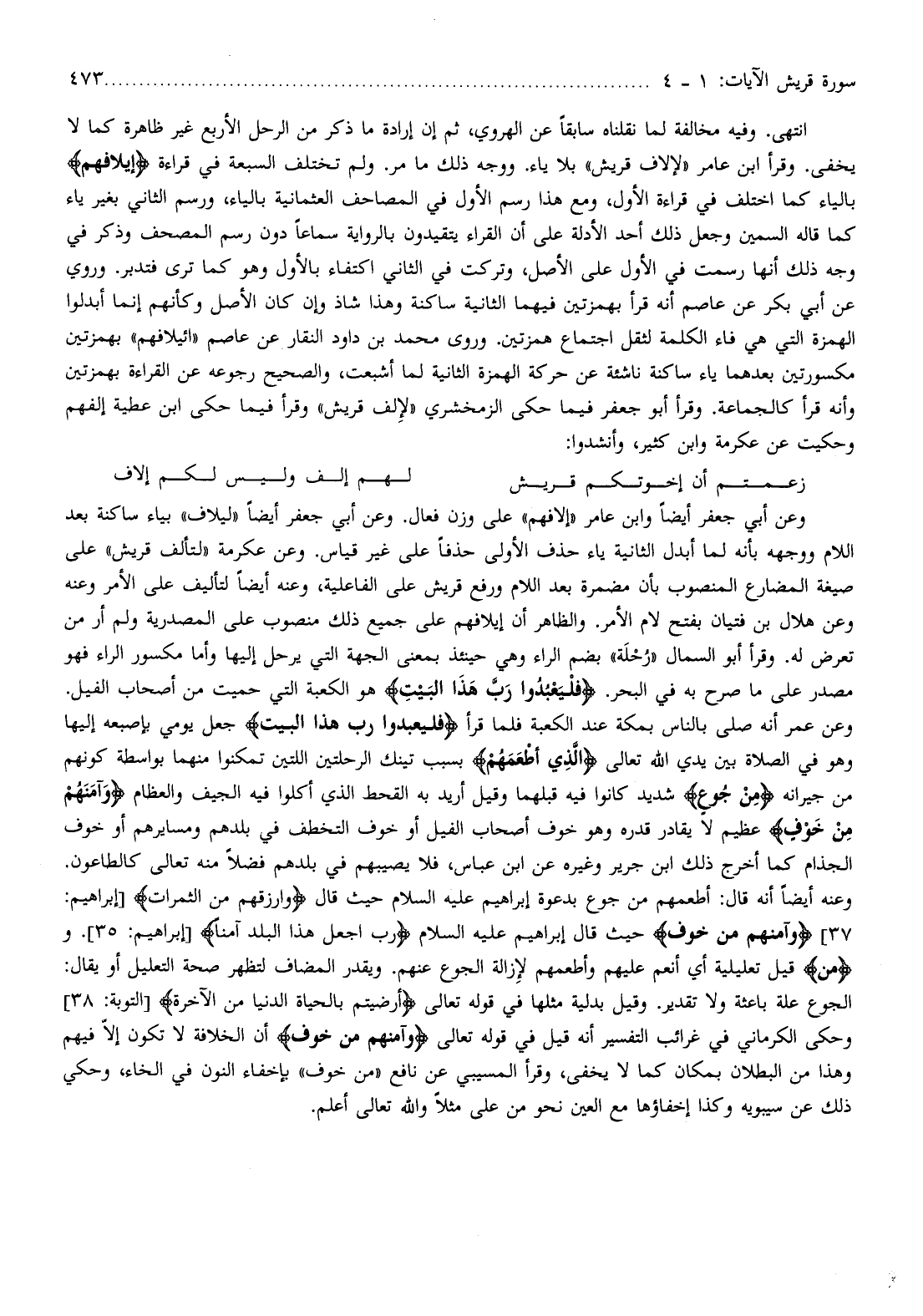 انتهى. وفيه مخالفة لما نقلناه سابقا عن الهروي، ثم إن إرادة ما ذكر من الرحل الأربع غير ظاهرة كما لا يخفى. وقرأ ابن عامر «لإلاف قريش» بلا ياء. ووجه ذلك ما مر. ولم تختلف السبعة في قراءة إِيلافِهِمْ بالياء كما اختلف في قراءة الأول، ومع هذا رسم الأول في المصاحف العثمانية بالياء، ورسم الثاني بغير ياء كما قاله السمين وجعل ذلك أحد الأدلة على أن القراء يتقيدون بالرواية سماعا دون رسم المصحف وذكر في وجه ذلك أنها رسمت في الأول على الأصل، وتركت في الثاني اكتفاء بالأول وهو كما ترى فتدبر. وروي عن أبي بكر عن عاصم أنه قرأ بهمزتين فيهما الثانية ساكنة وهذا شاذ وإن كان الأصل وكأنهم إنما أبدلوا الهمزة التي هي فاء الكلمة لثقل اجتماع همزتين. وروى محمد بن داود النقار عن عاصم «إئيلافهم» بهمزتين مكسورتين بعدهما ياء ساكنة ناشئة عن حركة الهمزة الثانية لما أشبعت، والصحيح رجوعه عن القراءة بهمزتين وأنه قرأ كالجماعة. وقرأ أبو جعفر فيما حكى الزمخشري «لإلف قريش» وقرأ فيما حكى ابن عطية إلفهم وحكيت عن عكرمة وابن كثير، وأنشدوا:
