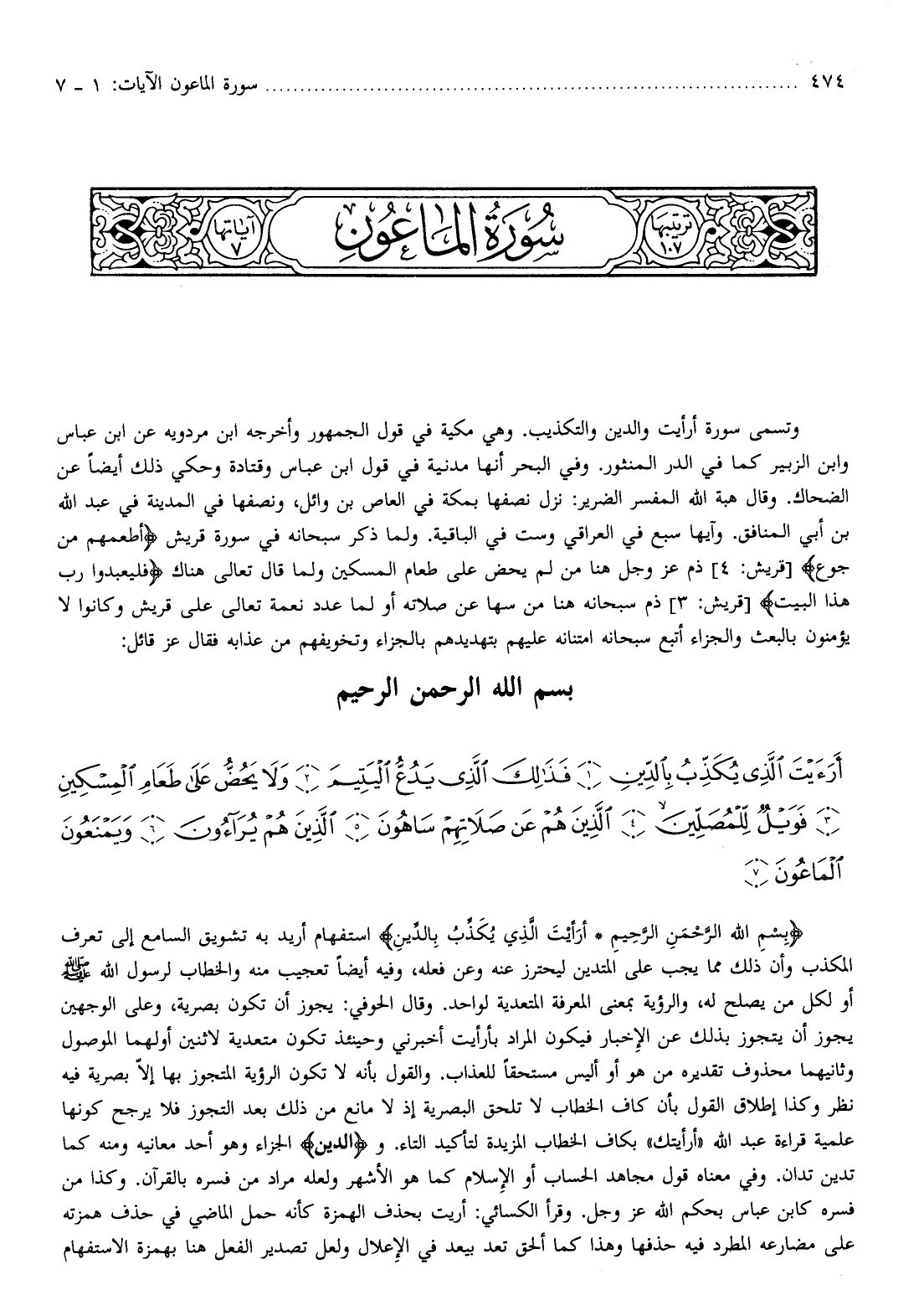 بِسْمِ اللَّهِ الرَّحْمنِ الرَّحِيمِ أَرَأَيْتَ الَّذِي يُكَذِّبُ بِالدِّينِ استفهام أريد به تشويق السامع إلى تعرف المكذب وأن ذلك مما يجب على المتدين ليحترز عنه وعن فعله، وفيه أيضا تعجيب منه والخطاب لرسول الله صلّى الله عليه وسلم أو لكل من يصلح له، والرؤية بمعنى المعرفة المتعدية لواحد. وقال الحوفي: يجوز أن تكون بصرية، وعلى الوجهين يجوز أن يتجوز بذلك عن الإخبار فيكون المراد بأرأيت أخبرني وحينئذ تكون متعدية لاثنين أولهما الموصول وثانيهما محذوف تقديره من هو أو أليس مستحقا للعذاب. والقول بأنه لا تكون الرؤية المتجوز بها إلّا بصرية فيه نظر وكذا إطلاق القول بأن كاف الخطاب لا تلحق البصرية إذ لا مانع من ذلك بعد التجوز فلا يرجح كونها علمية قراءة عبد الله «أرأيتك» بكاف الخطاب المزيدة لتأكيد التاء. و (الدين) الجزاء وهو أحد معانيه ومنه كما تدين تدان. وفي معناه قول مجاهد الحساب أو الإسلام كما هو الأشهر ولعله مراد من فسره بالقرآن. وكذا من فسره كابن عباس بحكم الله عز وجل. وقرأ الكسائي: أريت بحذف الهمزة كأنه حمل الماضي في حذف همزته على مضارعه المطرد فيه حذفها وهذا كما ألحق تعد بيعد في الإعلال ولعل تصدير الفعل هنا بهمزة الاستفهام
