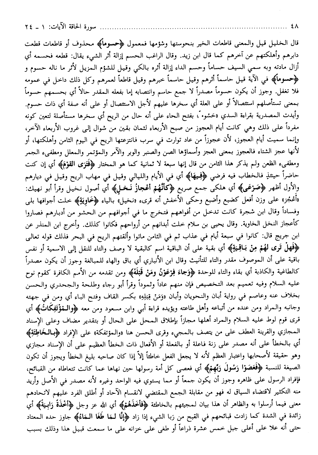 «أعجز» على وزن أفعل كضبع وأضبع وحكى الأخفش أنه قرىء «نخيل» بالياء خاوِيَةٍ خلت أجوافها بلى وفسادا وقال ابن شجرة كانت تدخل من أفواههم فتخرج ما في أجوافهم من الحشو من أدبارهم فصاروا كأعجاز النخل الخاوية. وقال يحيى بن سلام خلت أبدانهم من أرواحهم فكانوا كذلك. وأخرج ابن المنذر عن ابن جريج قال: كانوا في سبعة أيام في عذاب ثم في الثامن ماتوا وألقتهم الريح في البحر فذلك قوله تعالى فَهَلْ تَرى لَهُمْ مِنْ باقِيَةٍ أي بقية على أن الباقية اسم كالبقية لا وصف والتاء للنقل إلى الاسمية أو نفس باقية على أن الموصوف مقدر والتاء للتأنيث وقال ابن الأنباري أي باق والهاء للمبالغة وجوز أن يكون مصدرا كالطاغية والكاذبة أي بقاء والتاء للوحدة وَجاءَ فِرْعَوْنُ وَمَنْ قَبْلَهُ ومن تقدمه من الأمم الكافرة كقوم نوح عليه السلام وفيه تعميم بعد التخصيص فإن منهم عادا وثمودا وقرأ أبو رجاء وطلحة والجحدري والحسن بخلاف عنه وعاصم في رواية أبان والنحويان وأبان «ومن قبله» بكسر القاف وفتح الباء أي ومن في جهته وجانبه والمراد ومن عنده من أتباعه وأهل طاعته ويؤيده قراءة أبي وابن مسعود ومن معه وَالْمُؤْتَفِكاتُ أي قرى قوم لوط عليه السلام والمراد أهلها مجازا بإطلاق المحل على الحال أو بتقدير مضاف وعلى الإسناد المجازي والقرينة العطف على من يتصف بالمجيء وقرى الحسن هنا «والمؤتفكة» على الإفراد بِالْخاطِئَةِ أي بالخطأ على أنه مصدر على زنة فاعلة أو بالفعلة أو الأفعال ذات الخطأ العظيم على أن الإسناد مجازي وهو حقيقة لأصحابها واعتبار العظم لأنه لا يجعل الفعل خاطئا إلّا إذا كان صاحبه بليغ الخطأ ويجوز أن تكون الصيغة للنسبة فَعَصَوْا رَسُولَ رَبِّهِمْ أي فعصى كل أمة رسولها حين نهاها عما كانت تتعاطاه من القبائح، فإفراد الرسول على ظاهره وجوز أن يكون جمعا أو مما يستوي فيه الواحد وغيره لأنه مصدر في الأصل وأريد منه التكثير لاقتضاء السياق له فهو من مقابلة الجمع المقتضي لانقسام الآحاد أو أطلق الفرد عليهم لاتحادهم معنى فيما أرسلوا به والظاهر أن هذا بيان لمجيئهم بالخاطئة فَأَخَذَهُمْ أي الله عز وجل أَخْذَةً رابِيَةً أي زائدة في الشدة كما زادت قبائحهم في القبح من ربا الشيء إذا زاد إِنَّا لَمَّا طَغَى الْماءُ جاوز حده المعتاد حتى أنه علا على أعلى جبل خمس عشرة ذراعا أو طغى على خزانه على ما سمعت قبيل هذا وذلك بسبب
