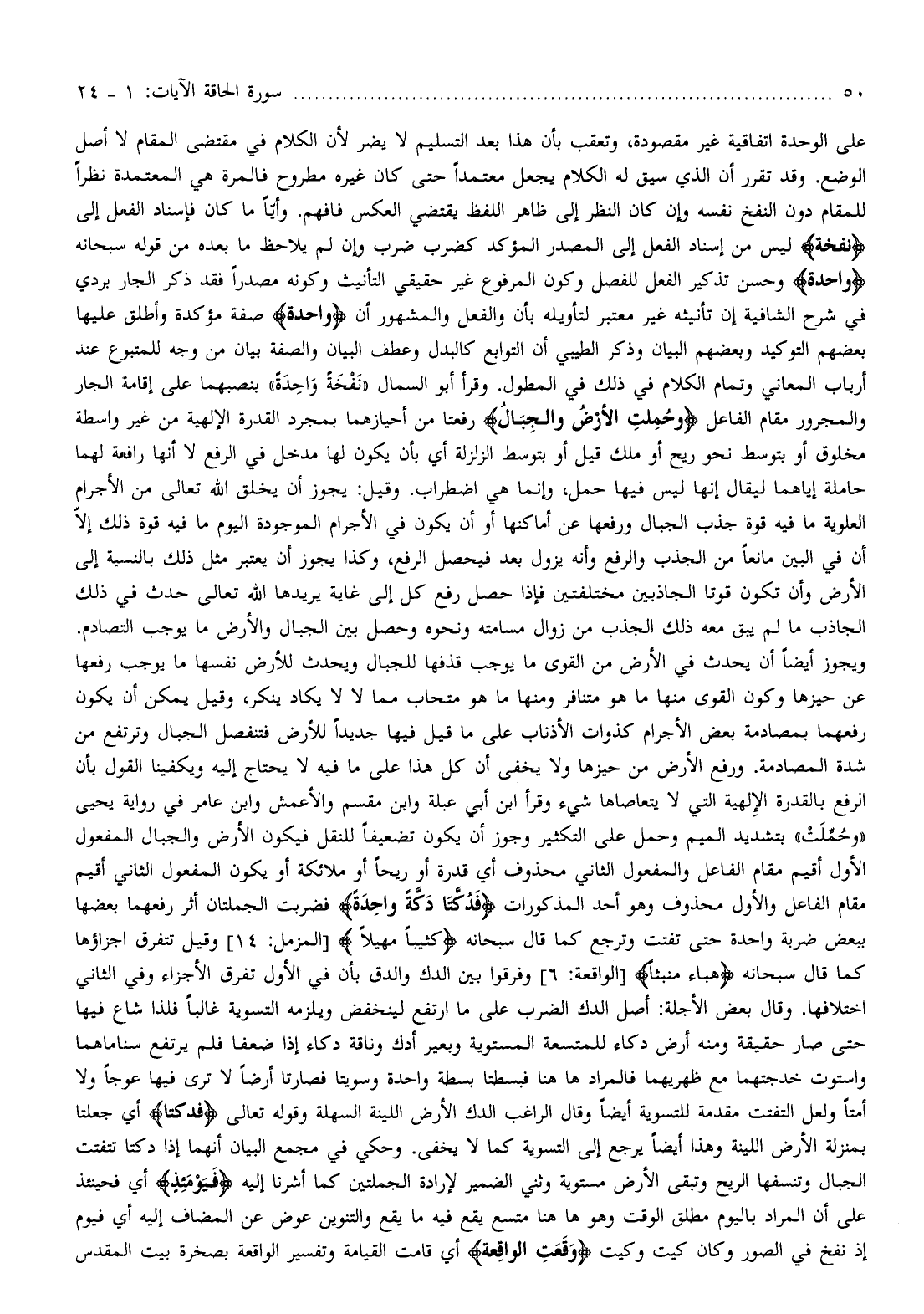ويجوز أيضا أن يحدث في الأرض من القوى ما يوجب قذفها للجبال ويحدث للأرض نفسها ما يوجب رفعها عن حيزها وكون القوى منها ما هو متنافر ومنها ما هو متحاب مما لا لا يكاد ينكر، وقيل يمكن أن يكون رفعهما بمصادمة بعض الأجرام كذوات الأذناب على ما قيل فيها جديدا للأرض فتنفصل الجبال وترتفع من شدة المصادمة. ورفع الأرض من حيزها ولا يخفى أن كل هذا على ما فيه لا يحتاج إليه ويكفينا القول بأن الرفع بالقدرة الإلهية التي لا يتعاصاها شيء وقرأ ابن أبي عبلة وابن مقسم والأعمش وابن عامر في رواية يحيى «وحملت» بتشديد الميم وحمل على التكثير وجوز أن يكون تضعيفا للنقل فيكون الأرض والجبال المفعول الأول أقيم مقام الفاعل والمفعول الثاني محذوف أي قدرة أو ريحا أو ملائكة أو يكون المفعول الثاني أقيم مقام الفاعل والأول محذوف وهو أحد المذكورات فَدُكَّتا دَكَّةً واحِدَةً فضربت الجملتان أثر رفعهما بعضها ببعض ضربة واحدة حتى تفتت وترجع كما قال سبحانه كَثِيباً مَهِيلًا [المزمل: 14] وقيل تتفرق اجزاؤها كما قال سبحانه هَباءً مُنْبَثًّا [الواقعة: 6] وفرقوا بين الدك والدق بأن في الأول تفرق الأجزاء وفي الثاني اختلافها. وقال بعض الأجلة: أصل الدك الضرب على ما ارتفع لينخفض ويلزمه التسوية غالبا فلذا شاع فيها حتى صار حقيقة ومنه أرض دكاء للمتسعة المستوية وبعير أدك وناقة دكاء إذا ضعفا فلم يرتفع سناما هما واستوت خدجتهما مع ظهريهما فالمرادها هنا فبسطتا بسطة واحدة وسويتا فصارتا أرضا لا ترى فيها عوجا ولا أمتا ولعل التفتت مقدمة للتسوية أيضا وقال الراغب الدك الأرض اللينة السهلة وقوله تعالى فَدُكَّتا أي جعلتا بمنزلة الأرض اللينة وهذا أيضا يرجع إلى التسوية كما لا يخفى. وحكي في مجمع البيان أنهما إذا دكتا تتفتت الجبال وتنسفها الريح وتبقى الأرض مستوية وثني الضمير لإرادة الجملتين كما أشرنا إليه فَيَوْمَئِذٍ أي فحينئذ على أن المراد باليوم مطلق الوقت وهو هاهنا متسع يقع فيه ما يقع والتنوين عوض عن المضاف إليه أي فيوم إذ نفخ في الصور وكان كيت وكيت وَقَعَتِ الْواقِعَةُ أي قامت القيامة وتفسير الواقعة بصخرة بيت المقدس