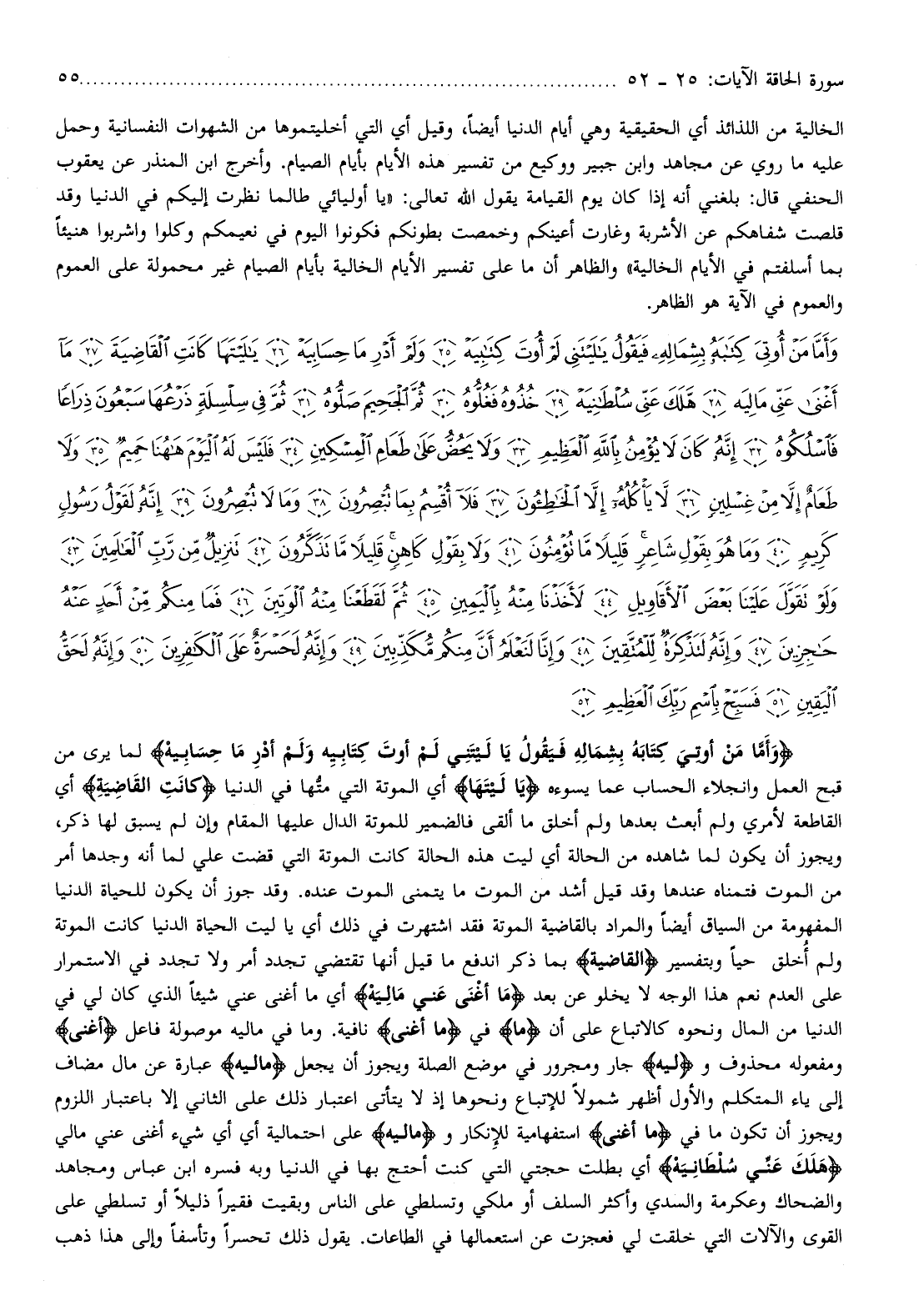 وَأَمَّا مَنْ أُوتِيَ كِتابَهُ بِشِمالِهِ فَيَقُولُ يا لَيْتَنِي لَمْ أُوتَ كِتابِيَهْ وَلَمْ أَدْرِ ما حِسابِيَهْ لما يرى من قبح العمل وانجلاء الحساب عما يسوءه يا لَيْتَها أي الموتة التي متّها في الدنيا كانَتِ الْقاضِيَةَ أي القاطعة لأمري ولم أبعث بعدها ولم أخلق ما ألقى فالضمير للموتة الدال عليها المقام وإن لم يسبق لها ذكر، ويجوز أن يكون لما شاهده من الحالة أي ليت هذه الحالة كانت الموتة التي قضت علي لما أنه وجدها أمر من الموت فتمناه عندها وقد قيل أشد من الموت ما يتمنى الموت عنده. وقد جوز أن يكون للحياة الدنيا المفهومة من السياق أيضا والمراد بالقاضية الموتة فقد اشتهرت في ذلك أي يا ليت الحياة الدنيا كانت الموتة ولم أخلق حيا وبتفسير الْقاضِيَةَ بما ذكر اندفع ما قيل أنها تقتضي تجدد أمر ولا تجدد في الاستمرار على العدم نعم هذا الوجه لا يخلو عن بعد ما أَغْنى عَنِّي مالِيَهْ أي ما أغنى عني شيئا الذي كان لي في الدنيا من المال ونحوه كالاتباع على أن ما في ما أَغْنى نافية. وما في ماليه موصولة فاعل أَغْنى ومفعوله محذوف و (ليه) جار ومجرور في موضع الصلة ويجوز أن يجعل مالِيَهْ عبارة عن مال مضاف إلى ياء المتكلم والأول أظهر شمولا للإتباع ونحوها إذ لا يتأتى اعتبار ذلك على الثاني إلا باعتبار اللزوم ويجوز أن تكون ما في ما أَغْنى استفهامية للإنكار ومالِيَهْ على احتمالية أي أي شيء أغنى عني مالي هَلَكَ عَنِّي سُلْطانِيَهْ أي بطلت حجتي التي كنت أحتج بها في الدنيا وبه فسره ابن عباس ومجاهد والضحاك وعكرمة والسدي وأكثر السلف أو ملكي وتسلطي على الناس وبقيت فقيرا ذليلا أو تسلطي على القوى والآلات التي خلقت لي فعجزت عن استعمالها في الطاعات. يقول ذلك تحسرا وتأسفا وإلى هذا ذهب