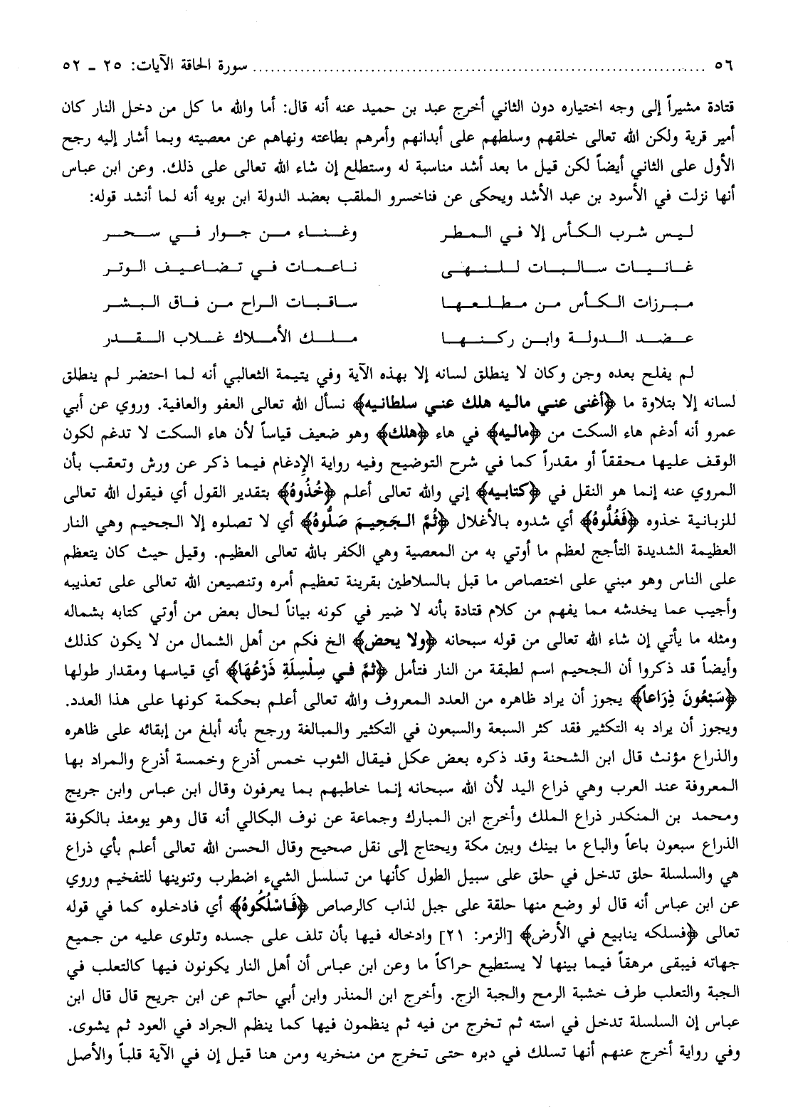 لم يفلح بعده وجن وكان لا ينطلق لسانه إلا بهذه الآية وفي يتيمة الثعالبي أنه لما احتضر لم ينطلق لسانه إلا بتلاوة ما أَغْنى عَنِّي مالِيَهْ هَلَكَ عَنِّي سُلْطانِيَهْ نسأل الله تعالى العفو والعافية. وروي عن أبي عمرو أنه أدغم هاء السكت من مالِيَهْ في هاء هَلَكَ وهو ضعيف قياسا لأن هاء السكت لا تدغم لكون الوقف عليها محققا أو مقدرا كما في شرح التوضيح وفيه رواية الإدغام فيما ذكر عن ورش وتعقب بأن المروي عنه إنما هو النقل في كِتابِيَهْ إني والله تعالى أعلم خُذُوهُ بتقدير القول أي فيقول الله تعالى للزبانية خذوه فَغُلُّوهُ أي شدوه بالأغلال ثُمَّ الْجَحِيمَ صَلُّوهُ أي لا تصلوه إلا الجحيم وهي النار العظيمة الشديدة التأجج لعظم ما أوتي به من المعصية وهي الكفر بالله تعالى العظيم. وقيل حيث كان يتعظم على الناس وهو مبني على اختصاص ما قبل بالسلاطين بقرينة تعظيم أمره وتنصيعن الله تعالى على تعذيبه وأجيب عما يخدشه مما يفهم من كلام قتادة بأنه لا ضير في كونه بيانا لحال بعض من أوتي كتابه بشماله ومثله ما يأتي إن شاء الله تعالى من قوله سبحانه وَلا يَحُضُّ إلخ فكم من أهل الشمال من لا يكون كذلك وأيضا قد ذكروا أن الجحيم اسم لطبقة من النار فتأمل ثُمَّ فِي سِلْسِلَةٍ ذَرْعُها أي قياسها ومقدار طولها سَبْعُونَ ذِراعاً يجوز أن يراد ظاهره من العدد المعروف والله تعالى أعلم بحكمة كونها على هذا العدد.
