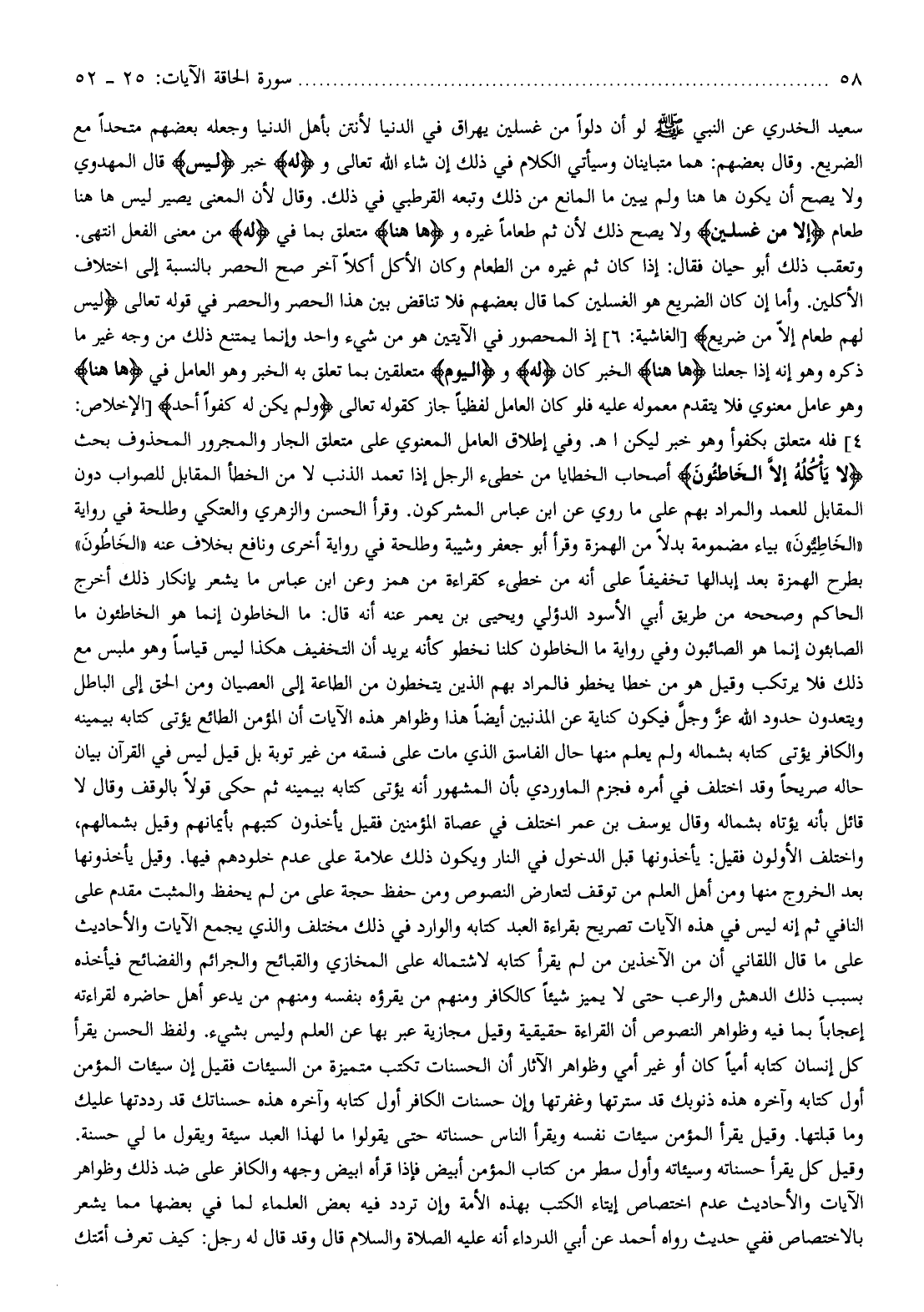 4] فله متعلق بكفوا وهو خبر ليكن اهـ. وفي إطلاق العامل المعنوي على متعلق الجار والمجرور المحذوف بحث لا يَأْكُلُهُ إِلَّا الْخاطِؤُنَ أصحاب الخطايا من خطىء الرجل إذا تعمد الذنب لا من الخطأ المقابل للصواب دون المقابل للعمد والمراد بهم على ما روي عن ابن عباس المشركون. وقرأ الحسن والزهري والعتكي وطلحة في رواية «الخاطيون» بياء مضمومة بدلا من الهمزة وقرأ أبو جعفر وشيبة وطلحة في رواية أخرى ونافع بخلاف عنه «الخاطون» بطرح الهمزة بعد إبدالها تخفيفا على أنه من خطىء كقراءة من همز وعن ابن عباس ما يشعر بإنكار ذلك أخرج الحاكم وصححه من طريق أبي الأسود الدؤلي ويحيى بن يعمر عنه أنه قال: ما الخاطون إنما هو الخاطئون ما الصابئون إنما هو الصائبون وفي رواية ما الخاطون كلنا نخطو كأنه يريد أن التخفيف هكذا ليس قياسا وهو ملبس مع ذلك فلا يرتكب وقيل هو من خطا يخطو فالمراد بهم الذين يتخطون من الطاعة إلى العصيان ومن الحق إلى الباطل ويتعدون حدود الله عزّ وجلّ فيكون كناية عن المذنبين أيضا هذا وظواهر هذه الآيات أن المؤمن الطائع يؤتى كتابه بيمينه والكافر يؤتى كتابه بشماله ولم يعلم منها حال الفاسق الذي مات على فسقه من غير توبة بل قيل ليس في القرآن بيان حاله صريحا وقد اختلف في أمره فجزم الماوردي بأن المشهور أنه يؤتى كتابه بيمينه ثم حكى قولا بالوقف وقال لا قائل بأنه يؤتاه بشماله وقال يوسف بن عمر اختلف في عصاة المؤمنين فقيل يأخذون كتبهم بأيمانهم وقيل بشمالهم، واختلف الأولون فقيل: يأخذونها قبل الدخول في النار ويكون ذلك علامة على عدم خلودهم فيها. وقيل يأخذونها بعد الخروج منها ومن أهل العلم من توقف لتعارض النصوص ومن حفظ حجة على من لم يحفظ والمثبت مقدم على النافي ثم إنه ليس في هذه الآيات تصريح بقراءة العبد كتابه والوارد في ذلك مختلف والذي يجمع الآيات والأحاديث على ما قال اللقاني أن من الآخذين من لم يقرأ كتابه لاشتماله على المخازي والقبائح والجرائم والفضائح فيأخذه بسبب ذلك الدهش والرعب حتى لا يميز شيئا كالكافر ومنهم من يقرؤه بنفسه ومنهم من يدعو أهل حاضره لقراءته إعجابا بما فيه وظواهر النصوص أن القراءة حقيقية وقيل مجازية عبر بها عن العلم وليس بشيء. ولفظ الحسن يقرأ كل إنسان كتابه أميا كان أو غير أمي وظواهر الآثار أن الحسنات تكتب متميزة من السيئات فقيل إن سيئات المؤمن أول كتابه وآخره هذه ذنوبك قد سترتها وغفرتها وإن حسنات الكافر أول كتابه وآخره هذه حسناتك قد رددتها عليك وما قبلتها. وقيل يقرأ المؤمن سيئات نفسه ويقرأ الناس حسناته حتى يقولوا ما لهذا العبد سيئة ويقول ما لي حسنة.