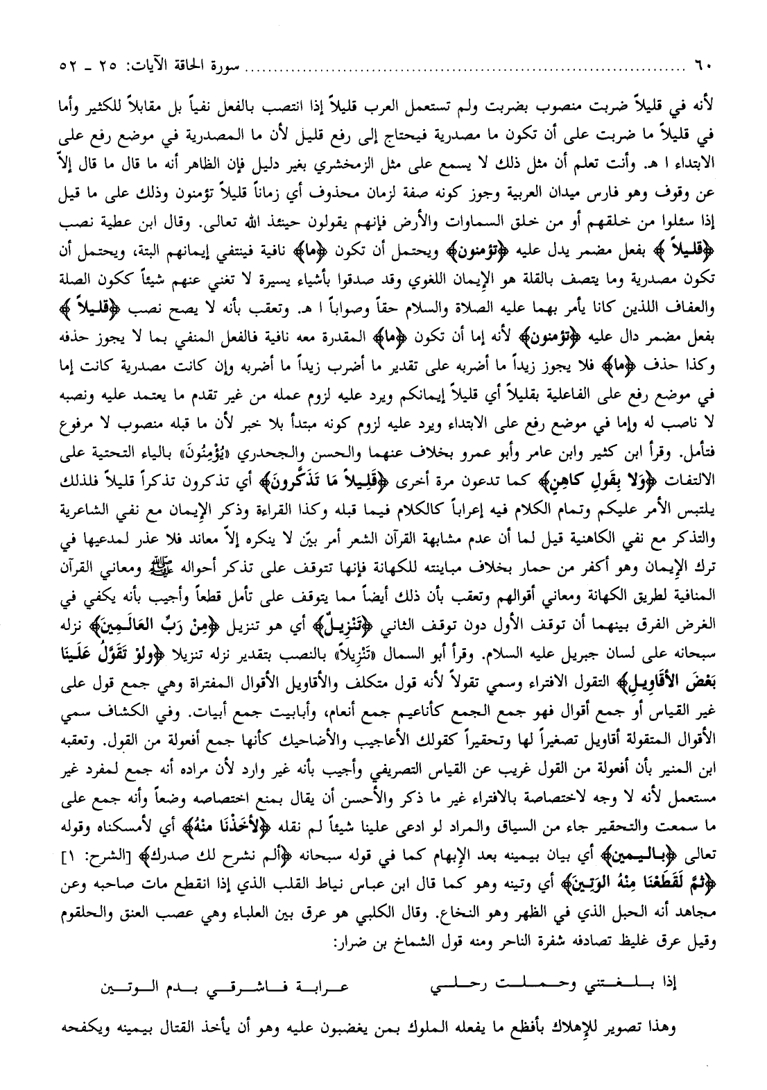 لأنه في قليلا ضربت منصوب بضربت ولم تستعمل العرب قليلا إذا انتصب بالفعل نفيا بل مقابلا للكثير وأما في قليلا ما ضربت على أن تكون ما مصدرية فيحتاج إلى رفع قليل لأن ما المصدرية في موضع رفع على الابتداء اهـ. وأنت تعلم أن مثل ذلك لا يسمع على مثل الزمخشري بغير دليل فإن الظاهر أنه ما قال ما قال إلّا عن وقوف وهو فارس ميدان العربية وجوز كونه صفة لزمان محذوف أي زمانا قليلا تؤمنون وذلك على ما قيل إذا سئلوا من خلقهم أو من خلق السماوات والأرض فإنهم يقولون حينئذ الله تعالى. وقال ابن عطية نصب قَلِيلًا بفعل مضمر يدل عليه تُؤْمِنُونَ ويحتمل أن تكون ما نافية فينتفي إيمانهم البتة، ويحتمل أن تكون مصدرية وما يتصف بالقلة هو الإيمان اللغوي وقد صدقوا بأشياء يسيرة لا تغني عنهم شيئا ككون الصلة والعفاف اللذين كانا يأمر بهما عليه الصلاة والسلام حقا وصوابا اهـ. وتعقب بأنه لا يصح نصب قَلِيلًا بفعل مضمر دال عليه تُؤْمِنُونَ لأنه إما أن تكون ما المقدرة معه نافية فالفعل المنفي بما لا يجوز حذفه وكذا حذف ما فلا يجوز زيدا ما أضربه على تقدير ما أضرب زيدا ما أضربه وإن كانت مصدرية كانت إما في موضع رفع على الفاعلية بقليلا أي قليلا إيمانكم ويرد عليه لزوم عمله من غير تقدم ما يعتمد عليه ونصبه لا ناصب له وإما في موضع رفع على الابتداء ويرد عليه لزوم كونه مبتدأ بلا خبر لأن ما قبله منصوب لا مرفوع فتأمل. وقرأ ابن كثير وابن عامر وأبو عمرو بخلاف عنهما والحسن والجحدري «يؤمنون» بالياء التحتية على الالتفات وَلا بِقَوْلِ كاهِنٍ كما تدعون مرة أخرى قَلِيلًا ما تَذَكَّرُونَ أي تذكرون تذكرا قليلا فلذلك يلتبس الأمر عليكم وتمام الكلام فيه إعرابا كالكلام فيما قبله وكذا القراءة وذكر الإيمان مع نفي الشاعرية والتذكر مع نفي الكاهنية قيل لما أن عدم مشابهة القرآن الشعر أمر بيّن لا ينكره إلّا معاند فلا عذر لمدعيها في ترك الإيمان وهو أكفر من حمار بخلاف مباينته للكهانة فإنها تتوقف على تذكر أحواله صلّى الله عليه وسلم ومعاني القرآن المنافية لطريق الكهانة ومعاني أقوالهم وتعقب بأن ذلك أيضا مما يتوقف على تأمل قطعا وأجيب بأنه يكفي في الغرض الفرق بينهما أن توقف الأول دون توقف الثاني تَنْزِيلٌ أي هو تنزيل مِنْ رَبِّ الْعالَمِينَ نزله سبحانه على لسان جبريل عليه السلام. وقرأ أبو السمال «تنزيلا» بالنصب بتقدير نزله تنزيلا وَلَوْ تَقَوَّلَ عَلَيْنا بَعْضَ الْأَقاوِيلِ التقول الافتراء وسمي تقولا لأنه قول متكلف والأقاويل الأقوال المفتراة وهي جمع قول على غير القياس أو جمع أقوال فهو جمع الجمع كأناعيم جمع أنعام، وأبابيت جمع أبيات. وفي الكشاف سمي الأقوال المتقولة أقاويل تصغيرا لها وتحقيرا كقولك الأعاجيب والأضاحيك كأنها جمع أفعولة من القول. وتعقبه ابن المنبر بأن أفعولة من القول غريب عن القياس التصريفي وأجيب بأنه غير وارد لأن مراده أنه جمع لمفرد غير مستعمل لأنه لا وجه لاختصاصة بالافتراء غير ما ذكر والأحسن أن يقال بمنع اختصاصه وضعا وأنه جمع على ما سمعت والتحقير جاء من السياق والمراد لو ادعى علينا شيئا لم نقله لَأَخَذْنا مِنْهُ أي لأمسكناه وقوله تعالى بِالْيَمِينِ أي بيان بيمينه بعد الإبهام كما في قوله سبحانه أَلَمْ نَشْرَحْ لَكَ صَدْرَكَ [الشرح: 1] ثُمَّ لَقَطَعْنا مِنْهُ الْوَتِينَ أي وتينه وهو كما قال ابن عباس نياط القلب الذي إذا انقطع مات صاحبه وعن مجاهد أنه الحبل الذي في الظهر وهو النخاع. وقال الكلبي هو عرق بين العلباء وهي عصب العنق والحلقوم وقيل عرق غليظ تصادفه شفرة الناحر ومنه قول الشماخ بن ضرار: