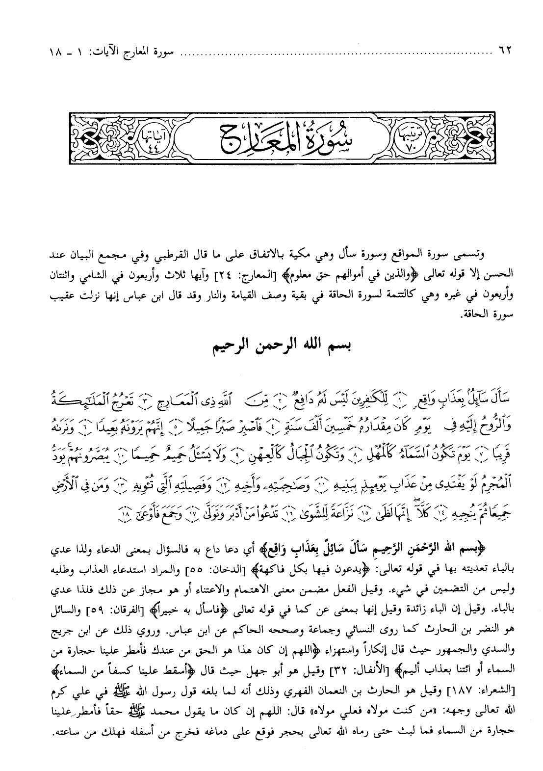 بِسْمِ اللَّهِ الرَّحْمنِ الرَّحِيمِ سَأَلَ سائِلٌ بِعَذابٍ واقِعٍ أي دعا داع به فالسؤال بمعنى الدعاء ولذا عدي بالباء تعديته بها في قوله تعالى: يَدْعُونَ فِيها بِكُلِّ فاكِهَةٍ [الدخان: 55] والمراد استدعاء العذاب وطلبه وليس من التضمين في شيء. وقيل الفعل مضمن معنى الاهتمام والاعتناء أو هو مجاز عن ذلك فلذا عدي بالباء. وقيل إن الباء زائدة وقيل إنها بمعنى عن كما في قوله تعالى فَسْئَلْ بِهِ خَبِيراً [الفرقان: 59] والسائل هو النضر بن الحارث كما روى النسائي وجماعة وصححه الحاكم عن ابن عباس. وروي ذلك عن ابن جريج والسدي والجمهور حيث قال إنكارا واستهزاء اللَّهُمَّ إِنْ كانَ هذا هُوَ الْحَقَّ مِنْ عِنْدِكَ فَأَمْطِرْ عَلَيْنا حِجارَةً مِنَ السَّماءِ أَوِ ائْتِنا بِعَذابٍ أَلِيمٍ [الأنفال: 32] وقيل هو أبو جهل حيث قال فَأَسْقِطْ عَلَيْنا كِسَفاً مِنَ السَّماءِ [الشعراء: 187]