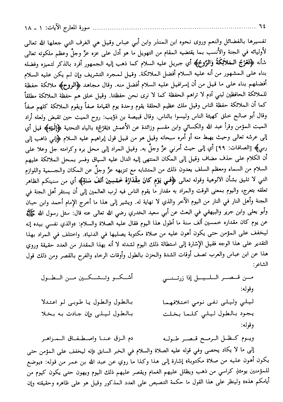 تفسيرها بالفضائل والنعم وروى نحوه ابن المنذر وابن أبي عباس وقيل هي الغرف التي جعلها الله تعالى لأوليائه في الجنة والأنسب بما يقتضيه المقام من التهويل ما هو أدل على عزه عزّ وجلّ وعظم ملكوته تعالى شأنه تَعْرُجُ الْمَلائِكَةُ وَالرُّوحُ أي جبريل عليه السلام كما ذهب إليه الجمهور أفرد بالذكر لتميزة وفضله بناء على المشهور من أنه عليه السلام أفضل الملائكة. وقيل لمجرد التشريف وإن لم يكن عليه السلام أفضلهم بناء على ما قيل من أن إسرافيل عليه السلام أفضل منه. وقال مجاهد الرُّوحُ ملائكة حفظة للملائكة الحافظين لبني آدم لا تراهم الحفظة كما لا نرى نحن حفظتنا. وقيل خلق هم حفظة الملائكة مطلقا كما أن الملائكة حفظة الناس وقيل ملك عظيم الحلقة يقوم وحدة يوم القيامة صفا ويقوم الملائكة كلهم صفا وقال أبو صالح خلق كهيئة الناس وليسوا بالناس. وقال قبيصة بن ذؤيب: روح الميت حين تقبض ولعله أراد الميت المؤمن وقرأ عبد الله والكسائي وابن مقسم وزائدة عن الأعمش «يعرج» بالياء التحتية إِلَيْهِ قيل أي إلى عرشه تعالى وحيث يهبط منه أو أمره سبحانه وقيل هو من قبيل قول إبراهيم عليه السلام إِنِّي ذاهِبٌ إِلى رَبِّي [الصافات: 99] أي إلى حيث أمرني عزّ وجلّ به. وقيل المراد إلى محل بره وكرامته جل وعلا على أن الكلام على حذف مضاف وقيل إلى المكان المنتهى إليه الدال عليه السياق وفسر بمحل الملائكة عليهم السلام من السماء ومعظم السلف يعدون ذلك من المتشابه مع تنزيهه عزّ وجلّ عن المكان والجسمية واللوازم التي لا تليق بشأن الالوهية وقوله تعالى فِي يَوْمٍ كانَ مِقْدارُهُ خَمْسِينَ أَلْفَ سَنَةٍ أي من سنينكم الظاهر تعلقه بتعرج، واليوم بمعنى الوقت والمراد به مقدار ما يقوم الناس فيه لرب العالمين إلى أن يستقر أهل الجنة في الجنة وأهل النار في النار من اليوم الآخر والذي لا نهاية له.