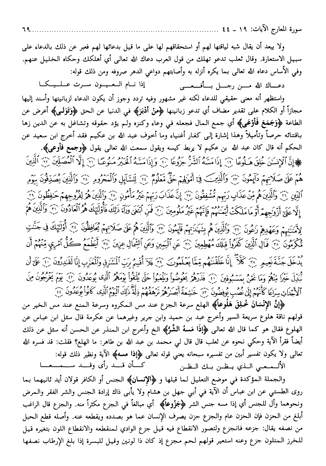 إِنَّ الْإِنْسانَ خُلِقَ هَلُوعاً الهلع سرعة الجزع عند مس المكروه وسرعة المنع عند مس الخير من قولهم ناقة هلوع سريعة السير وأخرج عبد بن حميد وابن جرير وغيرهما عن عكرمة قال سئل ابن عباس عن الهلوع فقال هو كما قال الله تعالى إِذا مَسَّهُ الشَّرُّ إلخ وأخرج ابن المنذر عن الحسن أنه سئل عن ذلك أيضا فقرأ الآية وحكي نحوه عن ثعلب قال قال لي محمد بن عبد الله بن طاهر: ما الهلع؟ فقلت: قد فسره الله تعالى ولا يكون تفسير أبين من تفسيره سبحانه يعني قوله تعالى إِذا مَسَّهُ الآية ونظير ذلك قوله: