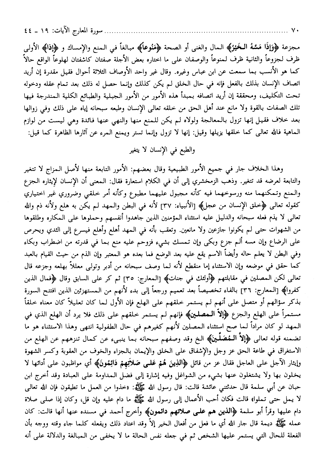 والطبع في الإنسان لا يتغير وهذا الخلاف جار في جميع الأمور الطبيعية وقال بعضهم: الأمور التابعة منها لأصل المزاج لا تتغير والتابعة لعرضه قد تتغير. وذهب الزمخشري إلى أن في الكلام استعارة فقال: المعنى أن الإنسان لإيثاره الجزع والمنع وتمكنهما منه ورسوخهما فيه كأنه مجبول عليهما مطبوع وكأنه أمر خلقي وضروري غير اختياري كقوله تعالى خُلِقَ الْإِنْسانُ مِنْ عَجَلٍ [الأنبياء: 37] لأنه في البطن والمهد لم يكن به هلع ولأنه ذم والله تعالى لا يذم فعله سبحانه والدليل عليه استثناء المؤمنين الذين جاهدوا أنفسهم وحملوها على المكاره وطلقوها من الشهوات حتى لم يكونوا جازعين ولا مانعين. وتعقب بأنه في المهد أهلع وأهلع فيسرع إلى الثدي ويحرص على الرضاع وإن مسه ألم جزع وبكى وإن تمسك بشيء فزوحم عليه منع بما في قدرته من اضطراب وبكاء وفي البطن لا يعلم حاله وأيضا الاسم يقع عليه بعد الوضع فما بعده هو المعتبر وإن الذم من حيث القيام بالعبد كما حقق في موضعه وإن الاستثناء إما منقطع لأنه لما وصف سبحانه من أدبر وتولى معللا بهلعه وجزعه قال تعالى لكن المصلين في مقابلتهم أُولئِكَ فِي جَنَّاتٍ [المعارج: 35] ثم كر على السابق وقال فَمالِ الَّذِينَ كَفَرُوا [المعارج: 36] بالفاء تخصيصا بعد تعميم ورجعا إلى بدء لأنهم من المستهزئين الذين افتتح السورة بذكر سؤالهم أو متصل على أنهم لم يستمر خلقهم على الهلع فإن الأول لما كان تعليلا كان معناه خلقا مستمرا على الهلع والجزع إِلَّا الْمُصَلِّينَ فإنهم لم يستمر خلقهم على ذلك فلا يرد أن الهلع الذي في المهد لو كان مرادا لما صح استثناء المصلين لأنهم كغيرهم في حال الطفولية انتهى وهذا الاستثناء هو ما تضمنه قوله تعالى إِلَّا الْمُصَلِّينَ إلخ وقد وصفهم سبحانه بما ينبىء عن كمال تنزههم عن الهلع من الاستغراق في طاعة الحق عز وجل والإشفاق على الخلق والإيمان بالجزاء والخوف من العقوبة وكسر الشهوة وإيثار الآجل على العاجل فقال عز من قائل الَّذِينَ هُمْ عَلى صَلاتِهِمْ دائِمُونَ أي مواظبون على أدائها لا يخلون بها ولا يشتغلون عنها بشيء من الشواغل وفيه إشارة إلى فضل المداومة على العبادة