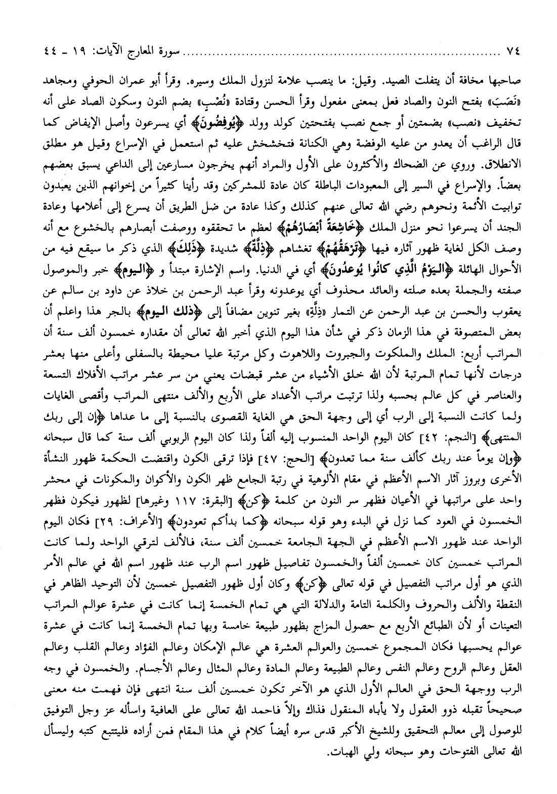 صاحبها مخافة أن يتفلت الصيد. وقيل: ما ينصب علامة لنزول الملك وسيره. وقرأ أبو عمران الحوفي ومجاهد «نصب» بفتح النون والصاد فعل بمعنى مفعول وقرأ الحسن وقتادة «نصب» بضم النون وسكون الصاد على أنه تخفيف «نصب» بضمتين أو جمع نصب بفتحتين كولد وولد يُوفِضُونَ أي يسرعون وأصل الإيفاض كما قال الراغب أن يعدو من عليه الوفضة وهي الكنانة فتخشخش عليه ثم استعمل في الإسراع وقيل هو مطلق الانطلاق. وروي عن الضحاك والأكثرون على الأول والمراد أنهم يخرجون مسارعين إلى الداعي يسبق بعضهم بعضا. والإسراع في السير إلى المعبودات الباطلة كان عادة للمشركين وقد رأينا كثيرا من إخوانهم الذين يعبدون توابيت الأئمة ونحوهم رضي الله تعالى عنهم كذلك وكذا عادة من ضل الطريق أن يسرع إلى أعلامها وعادة الجند أن يسرعوا نحو منزل الملك خاشِعَةً أَبْصارُهُمْ لعظم ما تحققوه ووصفت أبصارهم بالخشوع مع أنه وصف الكل لغاية ظهور آثاره فيها تَرْهَقُهُمْ تغشاهم ذِلَّةٌ شديدة ذلِكَ الذي ذكر ما سيقع فيه من الأحوال الهائلة الْيَوْمُ الَّذِي كانُوا يُوعَدُونَ أي في الدنيا. واسم الإشارة مبتدأ والْيَوْمُ خبر والموصول صفته والجملة بعده صلته والعائد محذوف أي يوعدونه وقرأ عبد الرحمن بن خلاذ عن داود بن سالم عن يعقوب والحسن بن عبد الرحمن عن التمار «ذلّة» بغير تنوين مضافا إلى ذلِكَ الْيَوْمُ بالجر هذا واعلم أن بعض المتصوفة في هذا الزمان ذكر في شأن هذا اليوم الذي أخبر الله تعالى أن مقداره خمسون ألف سنة أن المراتب أربع: الملك والملكوت والجبروت واللاهوت وكل مرتبة عليا محيطة بالسفلى وأعلى منها بعشر درجات لأنها تمام المرتبة لأن الله خلق الأشياء من عشر قبضات يعني من سر عشر مراتب الأفلاك التسعة والعناصر في كل عالم بحسبه ولذا ترتبت مراتب الأعداد على الأربع والألف منتهى المراتب وأقصى الغايات ولما كانت النسبة إلى الرب أي إلى وجهة الحق هي الغاية القصوى بالنسبة إلى ما عداها أَنَّ إِلى رَبِّكَ الْمُنْتَهى [النجم: 42] كان اليوم الواحد المنسوب إليه ألفا ولذا كان اليوم الربوبي ألف سنة كما قال سبحانه وَإِنَّ يَوْماً عِنْدَ رَبِّكَ كَأَلْفِ سَنَةٍ مِمَّا تَعُدُّونَ [الحج: 47] فإذا ترقى الكون واقتضت الحكمة ظهور النشأة الأخرى وبروز آثار الاسم الأعظم في مقام الألوهية في رتبة الجامع ظهر الكون والأكوان والمكونات في محشر واحد على مراتبها في الأعيان فظهر سر النون من كلمة كُنْ [البقرة: 117 وغيرها] لظهور فيكون فظهر الخمسون في العود كما نزل في البدء وهو قوله سبحانه كَما بَدَأَكُمْ تَعُودُونَ [الأعراف: 29] فكان اليوم الواحد عند ظهور الاسم الأعظم في الجهة الجامعة خمسين ألف سنة، فالألف لترقي الواحد ولما كانت المراتب خمسين كان خمسين ألفا والخمسون تفاصيل ظهور اسم الرب عند ظهور اسم الله في عالم الأمر الذي هو أول مراتب التفصيل في قوله تعالى كُنْ وكان أول ظهور التفصيل خمسين لأن التوحيد الظاهر في النقطة والألف والحروف والكلمة التامة والدلالة التي هي تمام الخمسة إنما كانت في عشرة عوالم المراتب التعينات أو لأن الطبائع الأربع مع حصول المزاج بظهور طبيعة خامسة وبها تمام الخمسة إنما كانت في عشرة عوالم يحسبها فكان المجموع خمسين والعوالم العشرة هي عالم الإمكان وعالم الفؤاد وعالم القلب وعالم العقل وعالم الروح وعالم النفس وعالم الطبيعة وعالم المادة وعالم المثال وعالم الأجسام. والخمسون في وجه الرب ووجهة الحق في العالم الأول الذي هو الآخر تكون خمسين ألف سنة انتهى فإن فهمت منه معنى صحيحا تقبله ذوو العقول ولا يأباه المنقول فذاك وإلّا فاحمد الله تعالى على العافية واسأله عز وجل التوفيق للوصول إلى معالم التحقيق وللشيخ الأكبر قدس سره أيضا كلام في هذا المقام فمن أراده فليتتبع كتبه وليسأل الله تعالى الفتوحات وهو سبحانه ولي الهبات.