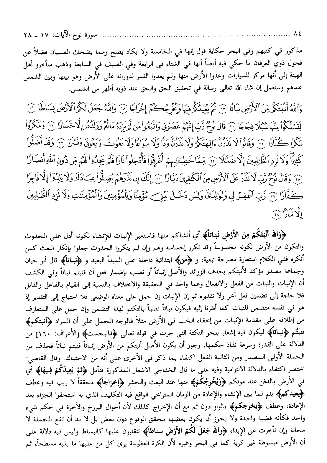 وَاللَّهُ أَنْبَتَكُمْ مِنَ الْأَرْضِ نَباتاً أي أنشاكم منها فاستعير الإنبات للإنشاء لكونه أدل على الحدوث والتكون من الأرض لكونه محسوسا وقد تكرر إحساسه وهم وإن لم ينكروا الحدوث جعلوا بإنكار البعث كمن أنكره ففي الكلام استعارة مصرحة تبعية، ومِنَ ابتدائية داخلة على المبدأ البعيد ونَباتاً قال أبو حيان وجماعة مصدر مؤكد لأنبتكم بحذف الزوائد والأصل إنباتا أو نصب بإضمار فعل أن فنبتم نباتا وفي الكشف أن الإنبات والنبات من الفعل والانفعال وهما واحد في الحقيقة والاختلاف بالنسبة إلى القيام بالفاعل والقابل فلا حاجة إلى تضمين فعل آخر ولا تقديره ثم إن الإنبات إن حمل على معناه الوضعي فلا احتياج إلى التقدير إذ هو في نفسه متضمن للنبات كما أشرنا إليه فيكون نباتا نصبا بالتكتم لهذا التضمن وإن حمل على المتعارف من إطلاقه على مقدمة الإنبات من إخفاء الحب في الأرض مثلا فالوجه الحمل على أن المراد أَنْبَتَكُمْ فنبتّم نَباتاً ليكون فيه إشعار بنحو النكتة التي جرت في قوله تعالى فَانْبَجَسَتْ [الأعراف: 160] من الدلالة على القدرة وسرعة نفاذ حكمها. وجوز أن يكون الأصل أنبتكم من الأرض إنباتا فنبتم نباتا فحذف من الجملة الأولى المصدر ومن الثانية الفعل اكتفاء بما ذكر في الأخرى على أنه من الاحتباك. وقال القاضي: