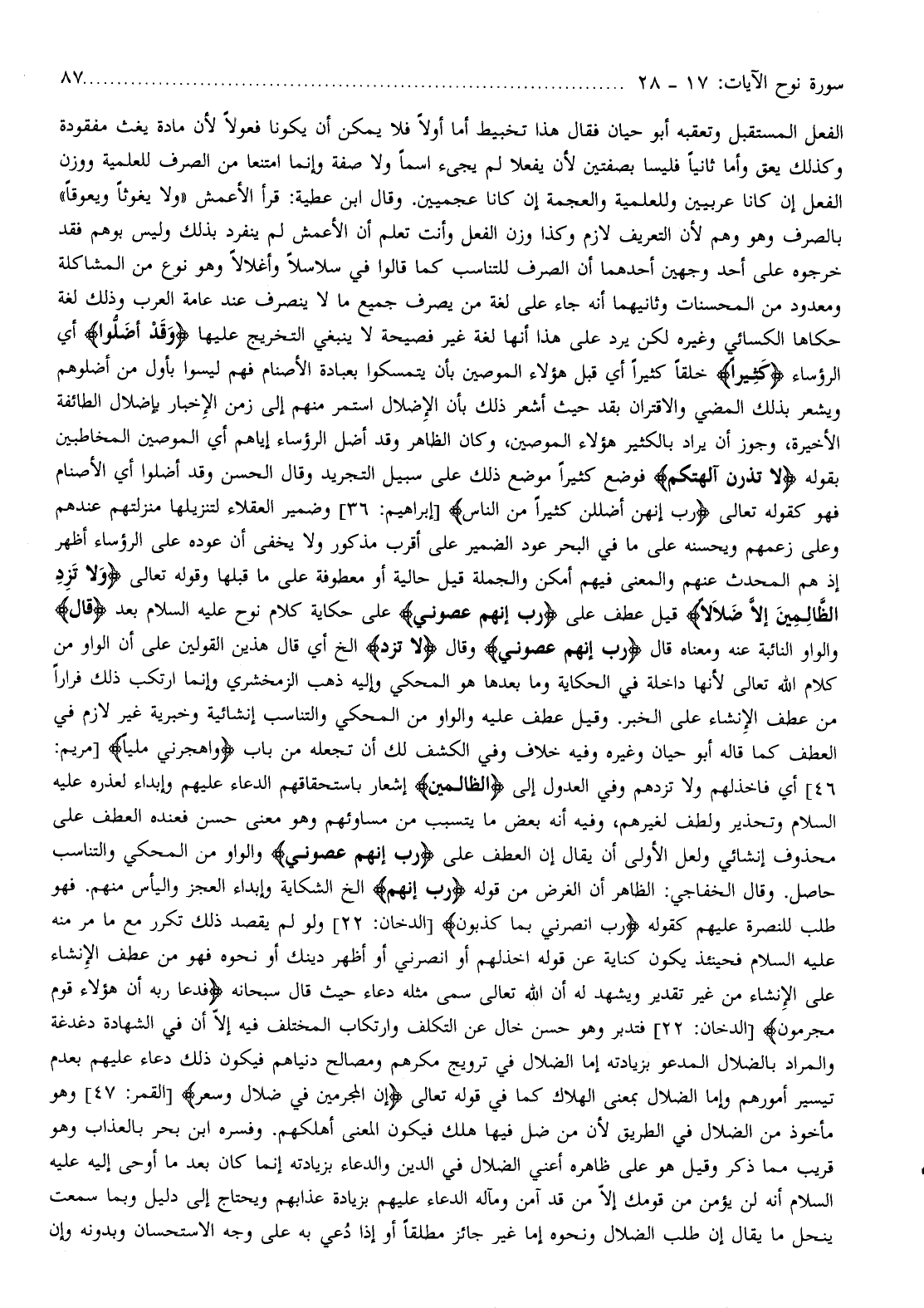 الفعل المستقبل وتعقبه أبو حيان فقال هذا تخبيط أما أولا فلا يمكن أن يكونا فعولا لأن مادة يغث مفقودة وكذلك يعق وأما ثانيا فليسا بصفتين لأن يفعلا لم يجىء اسما ولا صفة وإنما امتنعا من الصرف للعلمية ووزن الفعل إن كانا عربيين وللعلمية والعجمة إن كانا عجميين. وقال ابن عطية: قرأ الأعمش «ولا يغوثا ويعوقا» بالصرف وهو وهم لأن التعريف لازم وكذا وزن الفعل وأنت تعلم أن الأعمش لم ينفرد بذلك وليس بوهم فقد خرجوه على أحد وجهين أحدهما أن الصرف للتناسب كما قالوا في سلاسلا وأغلالا وهو نوع من المشاكلة ومعدود من المحسنات وثانيهما أنه جاء على لغة من يصرف جميع ما لا ينصرف عند عامة العرب وذلك لغة حكاها الكسائي وغيره لكن يرد على هذا أنها لغة غير فصيحة لا ينبغي التخريج عليها وَقَدْ أَضَلُّوا أي الرؤساء كَثِيراً خلقا كثيرا أي قبل هؤلاء الموصين بأن يتمسكوا بعبادة الأصنام فهم ليسوا بأول من أضلوهم ويشعر بذلك المضي والاقتران بقد حيث أشعر ذلك بأن الإضلال استمر منهم إلى زمن الإخبار بإضلال الطائفة الأخيرة، وجوز أن يراد بالكثير هؤلاء الموصين، وكان الظاهر وقد أضل الرؤساء إياهم أي الموصين المخاطبين بقوله لا تَذَرُنَّ آلِهَتَكُمْ فوضع كثيرا موضع ذلك على سبيل التجريد وقال الحسن وقد أضلوا أي الأصنام فهو كقوله تعالى رَبِّ إِنَّهُنَّ أَضْلَلْنَ كَثِيراً مِنَ النَّاسِ [إبراهيم: 36] وضمير العقلاء لتنزيلها منزلتهم عندهم وعلى زعمهم ويحسنه على ما في البحر عود الضمير على أقرب مذكور ولا يخفى أن عوده على الرؤساء أظهر إذ هم المحدث عنهم والمعنى فيهم أمكن والجملة قيل حالية أو معطوفة على ما قبلها وقوله تعالى وَلا تَزِدِ الظَّالِمِينَ إِلَّا ضَلالًا قيل عطف على رَبِّ إِنَّهُمْ عَصَوْنِي على حكاية كلام نوح عليه السلام بعد قالَ والواو النائبة عنه ومعناه قال رَبِّ إِنَّهُمْ عَصَوْنِي وقال لا تَزِدِ إلخ أي قال هذين القولين على أن الواو من كلام الله تعالى لأنها داخلة في الحكاية وما بعدها هو المحكي وإليه ذهب الزمخشري وإنما ارتكب ذلك فرارا من عطف الإنشاء على الخبر. وقيل عطف عليه والواو من المحكي والتناسب إنشائية وخبرية غير لازم في العطف كما قاله أبو حيان وغيره وفيه خلاف وفي الكشف لك أن تجعله من باب وَاهْجُرْنِي مَلِيًّا [مريم: 46] أي فاخذلهم ولا تزدهم وفي العدول إلى الظَّالِمِينَ إشعار باستحقاقهم الدعاء عليهم وإبداء لعذره عليه السلام وتحذير ولطف لغيرهم، وفيه أنه بعض ما يتسبب من مساوئهم وهو معنى حسن فعنده العطف على محذوف إنشائي ولعل الأولى أن يقال إن العطف على رَبِّ إِنَّهُمْ عَصَوْنِي والواو من المحكي والتناسب حاصل. وقال الخفاجي: الظاهر أن الغرض من قوله رَبِّ إِنَّهُمْ إلخ الشكاية وإبداء العجز واليأس منهم. فهو طلب للنصرة عليهم كقوله رَبِّ انْصُرْنِي بِما كَذَّبُونِ [الدخان: 22] ولو لم يقصد ذلك تكرر مع ما مر منه عليه السلام فحينئذ يكون كناية عن قوله اخذلهم أو انصرني أو أظهر دينك أو نحوه فهو من عطف الإنشاء على الإنشاء من غير تقدير ويشهد له أن الله تعالى سمى مثله دعاء حيث قال سبحانه فَدَعا رَبَّهُ أَنَّ هؤُلاءِ قَوْمٌ مُجْرِمُونَ [الدخان: 22] فتدبر وهو حسن خال عن التكلف وارتكاب المختلف فيه إلّا أن في الشهادة دغدغة والمراد بالضلال المدعو بزيادته إما الضلال في ترويج مكرهم ومصالح دنياهم فيكون ذلك دعاء عليهم بعدم تيسير أمورهم وإما الضلال بمعنى الهلاك كما في قوله تعالى إِنَّ الْمُجْرِمِينَ فِي ضَلالٍ وَسُعُرٍ [القمر: 47] وهو مأخوذ من الضلال في الطريق لأن من ضل فيها هلك فيكون المعنى أهلكهم. وفسره ابن بحر بالعذاب وهو قريب مما ذكر وقيل هو على ظاهره أعني الضلال في الدين والدعاء بزيادته إنما كان بعد ما أوحى إليه عليه السلام أنه لن يؤمن من قومك إلّا من قد آمن ومآله الدعاء عليهم بزيادة عذابهم ويحتاج إلى دليل وبما سمعت ينحل ما يقال إن طلب الضلال ونحوه إما غير جائز مطلقا أو إذا دعي به على وجه الاستحسان وبدونه وإن