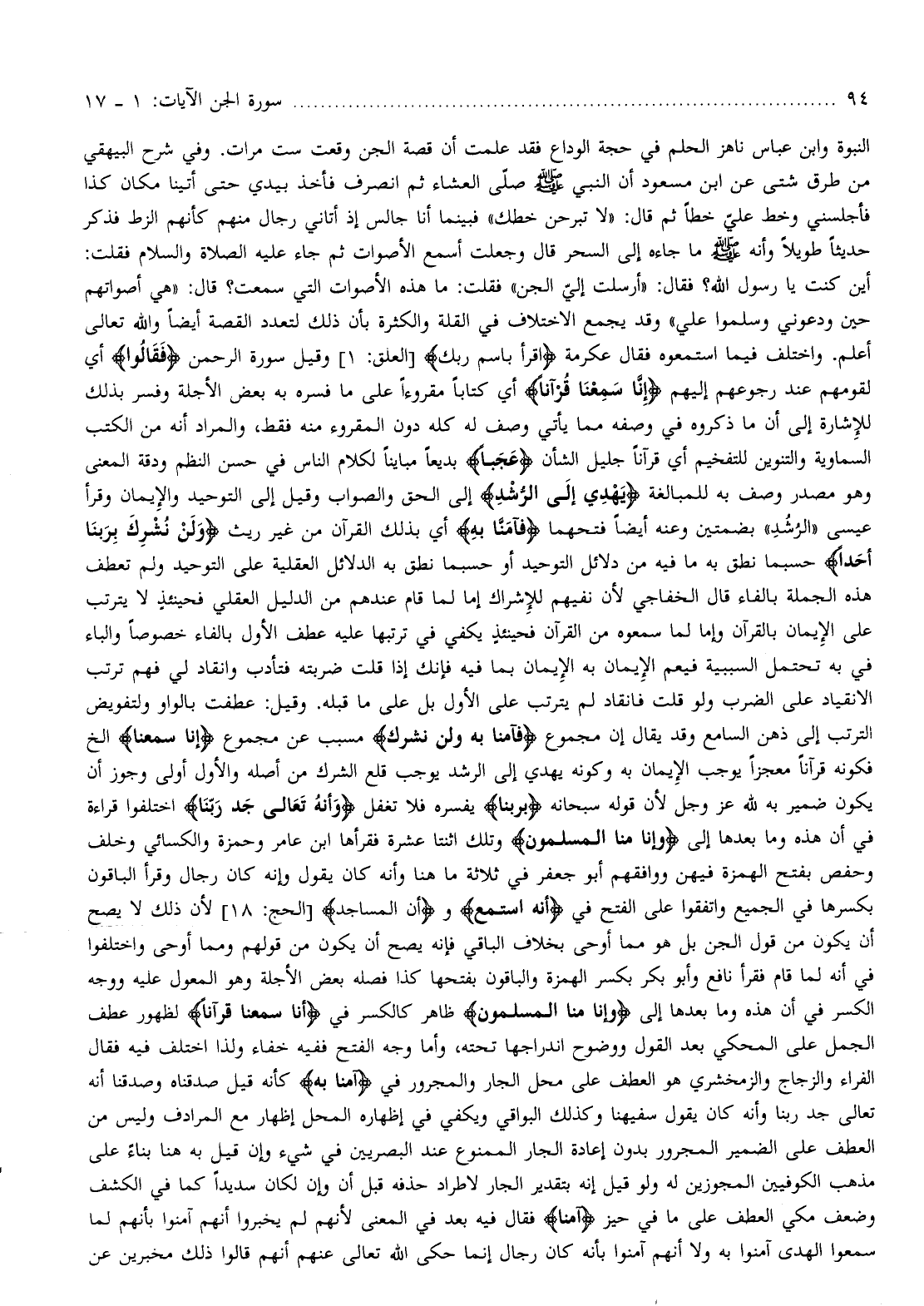 وقد يجمع الاختلاف في القلة والكثرة بأن ذلك لتعدد القصة أيضا والله تعالى أعلم. واختلف فيما استمعوه فقال عكرمة اقْرَأْ بِاسْمِ رَبِّكَ [العلق: 1] وقيل سورة الرحمن فَقالُوا أي لقومهم عند رجوعهم إليهم إِنَّا سَمِعْنا قُرْآناً أي كتابا مقروءا على ما فسره به بعض الأجلة وفسر بذلك للإشارة إلى أن ما ذكروه في وصفه مما يأتي وصف له كله دون المقروء منه فقط، والمراد أنه من الكتب السماوية والتنوين للتفخيم أي قرآنا جليل الشأن عَجَباً بديعا مباينا لكلام الناس في حسن النظم ودقة المعنى وهو مصدر وصف به للمبالغة يَهْدِي إِلَى الرُّشْدِ إلى الحق والصواب وقيل إلى التوحيد والإيمان وقرأ عيسى «الرشد» بضمتين وعنه أيضا فتحهما فَآمَنَّا بِهِ أي بذلك القرآن من غير ريث وَلَنْ نُشْرِكَ بِرَبِّنا أَحَداً حسبما نطق به ما فيه من دلائل التوحيد أو حسبما نطق به الدلائل العقلية على التوحيد ولم تعطف هذه الجملة بالفاء قال الخفاجي لأن نفيهم للإشراك إما لما قام عندهم من الدليل العقلي فحينئذ لا يترتب على الإيمان بالقرآن وإما لما سمعوه من القرآن فحينئذ يكفي في ترتبها عليه عطف الأول بالفاء خصوصا والباء في به تحتمل السببية فيعم الإيمان به الإيمان بما فيه فإنك إذا قلت ضربته فتأدب وانقاد لي فهم ترتب الانقياد على الضرب ولو قلت فانقاد لم يترتب على الأول بل على ما قبله. وقيل: عطفت بالواو ولتفويض الترتب إلى ذهن السامع وقد يقال إن مجموع فَآمَنَّا بِهِ وَلَنْ نُشْرِكَ مسبب عن مجموع إِنَّا سَمِعْنا إلخ فكونه قرآنا معجزا يوجب الإيمان به وكونه يهدي إلى الرشد يوجب قلع الشرك من أصله والأول أولى وجوز أن يكون ضمير به لله عز وجل لأن قوله سبحانه بِرَبِّنا يفسره فلا تغفل وَأَنَّهُ تَعالى جَدُّ رَبِّنا اختلفوا قراءة في أن هذه وما بعدها إلى وَأَنَّا مِنَّا الْمُسْلِمُونَ وتلك اثنتا عشرة فقرأها ابن عامر وحمزة والكسائي وخلف وحفص بفتح الهمزة فيهن ووافقهم أبو جعفر في ثلاثة ما هنا وأنه كان يقول وإنه كان رجال وقرأ الباقون بكسرها في الجميع واتفقوا على الفتح في أَنَّهُ اسْتَمَعَ وأَنَّ الْمَساجِدَ [الحج: 18] لأن ذلك لا يصح أن يكون من قول الجن بل هو مما أوحى بخلاف الباقي فإنه يصح أن يكون من قولهم ومما أوحى واختلفوا في أنه لما قام فقرأ نافع وأبو بكر بكسر الهمزة والباقون بفتحها كذا فصله بعض الأجلة وهو المعول عليه ووجه الكسر في أن هذه وما بعدها إلى وَأَنَّا مِنَّا الْمُسْلِمُونَ ظاهر كالكسر في إِنَّا سَمِعْنا قُرْآناً لظهور عطف الجمل على المحكي بعد القول ووضوح اندراجها تحته، وأما وجه الفتح ففيه خفاء ولذا اختلف فيه فقال الفراء والزجاج والزمخشري هو العطف على محل الجار والمجرور في فَآمَنَّا بِهِ كأنه قيل صدقناه وصدقنا أنه تعالى جد ربنا وأنه كان يقول سفيهنا وكذلك البواقي ويكفي في إظهاره المحل إظهار مع المرادف وليس من العطف على الضمير المجرور بدون إعادة الجار الممنوع عند البصريين في شيء وإن قيل به هنا بناء على مذهب الكوفيين المجوزين له ولو قيل إنه بتقدير الجار لاطراد حذفه قبل أن وإن لكان سديدا كما في الكشف وضعف مكي العطف على ما في حيز (آمنا) فقال فيه بعد في المعنى لأنهم لم يخبروا أنهم آمنوا بأنهم لما سمعوا الهدى آمنوا به ولا أنهم آمنوا بأنه كان رجال إنما حكى الله تعالى عنهم أنهم قالوا ذلك مخبرين عن