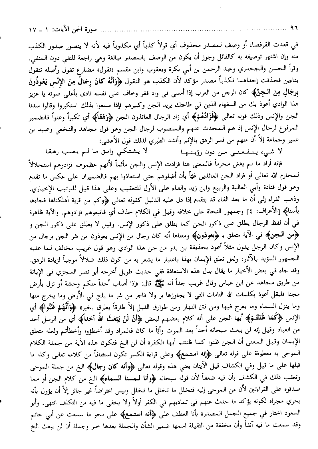 وذهب الفراء إلى أن ما بعد الفاء قد يتقدم إذا دل عليه الدليل كقوله تعالى وَكَمْ مِنْ قَرْيَةٍ أَهْلَكْناها فَجاءَها بَأْسُنا [الأعراف: 4] وجمهور النحاة على خلافه وقيل في الكلام حذف أي فاتبعوهم فزادوهم. والآية ظاهرة في أن لفظ الرجال يطلق على ذكور الجن كما يطلق على ذكور الإنس. وقيل لا يطلق على ذكور الجن ومِنَ الْجِنِّ في الآية متعلق ب يَعُوذُونَ ومعناها أنه كان رجال من الإنس يعوذون من شر الجن برجال من الإنس وكان الرجل يقول مثلا أعوذ بحذيفة بن بدر من جن هذا الوادي وهو قول غريب مخالف لما عليه الجمهور المؤيد بالآثار، ولعل تعلق الإيمان بهذا باعتبار ما يشعر به من كون ذلك ضلالا موجبا لزيادة الرهق.