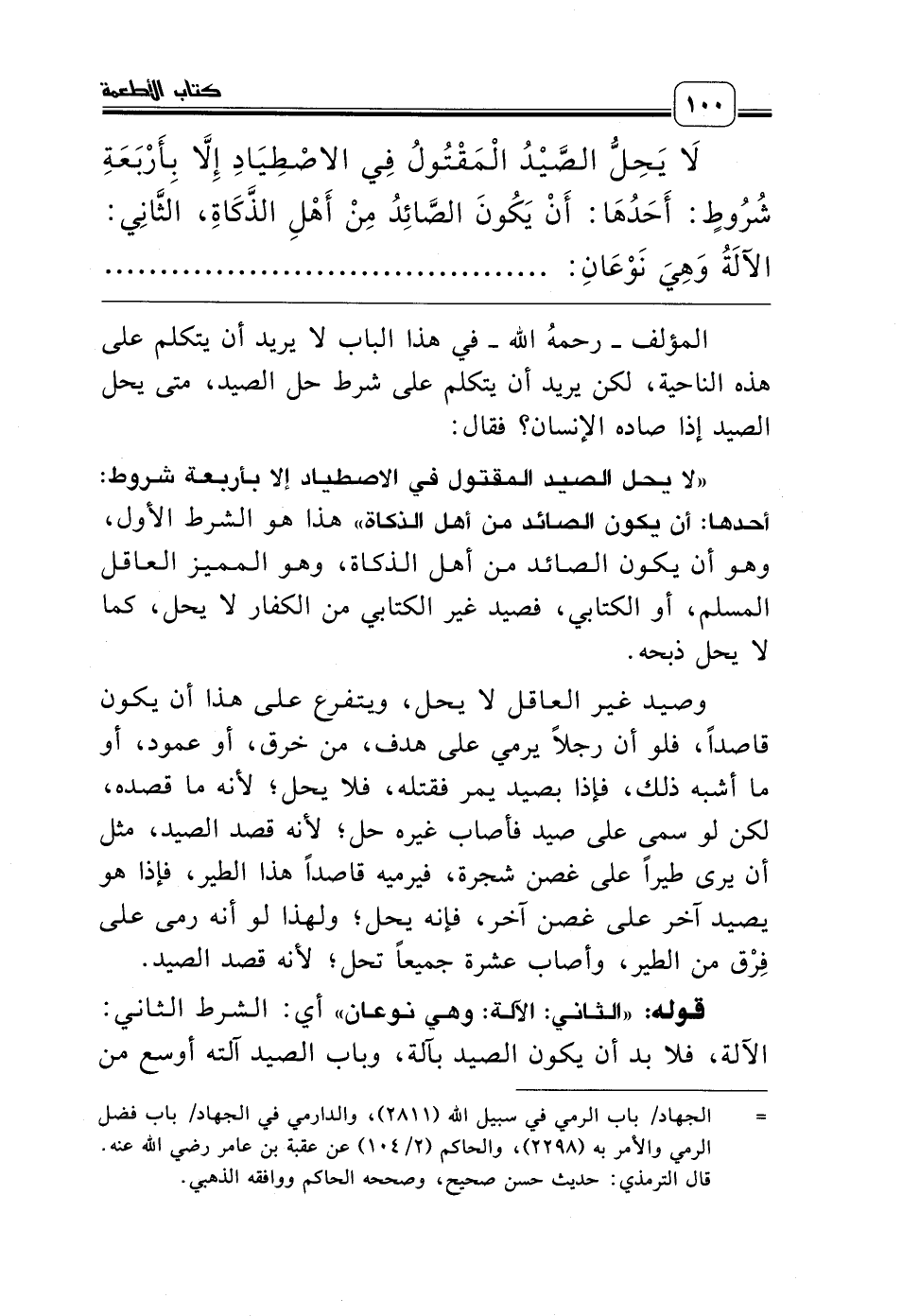«لا يحل الصيد المقتول في الاصطياد إلا بأربعة شروط: أحدها: أن يكون الصائد من أهل الذكاة» هذا هو الشرط الأول، وهو أن يكون الصائد من أهل الذكاة، وهو المميز العاقل المسلم، أو الكتابي، فصيد غير الكتابي من الكفار لا يحل، كما لا يحل ذبحه.